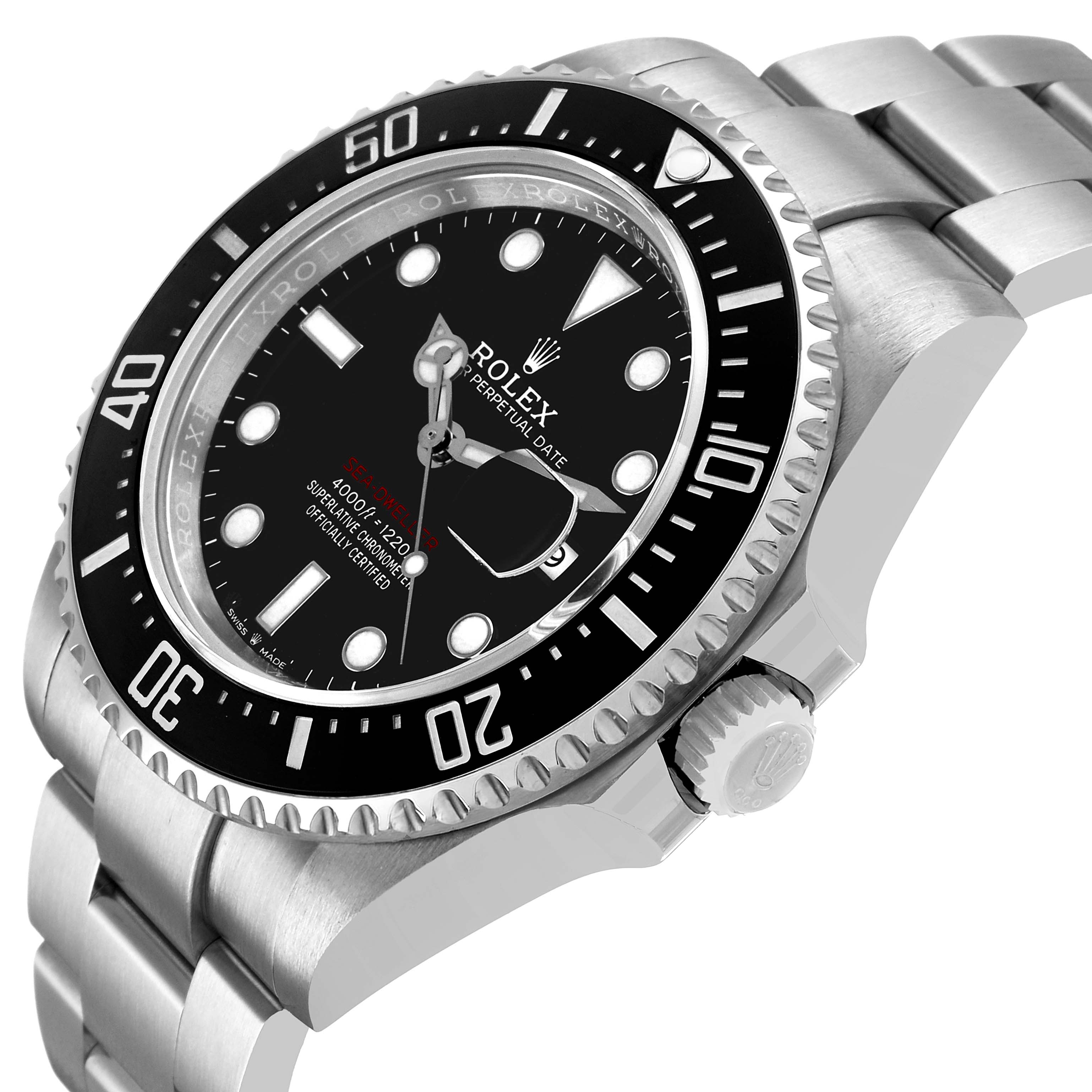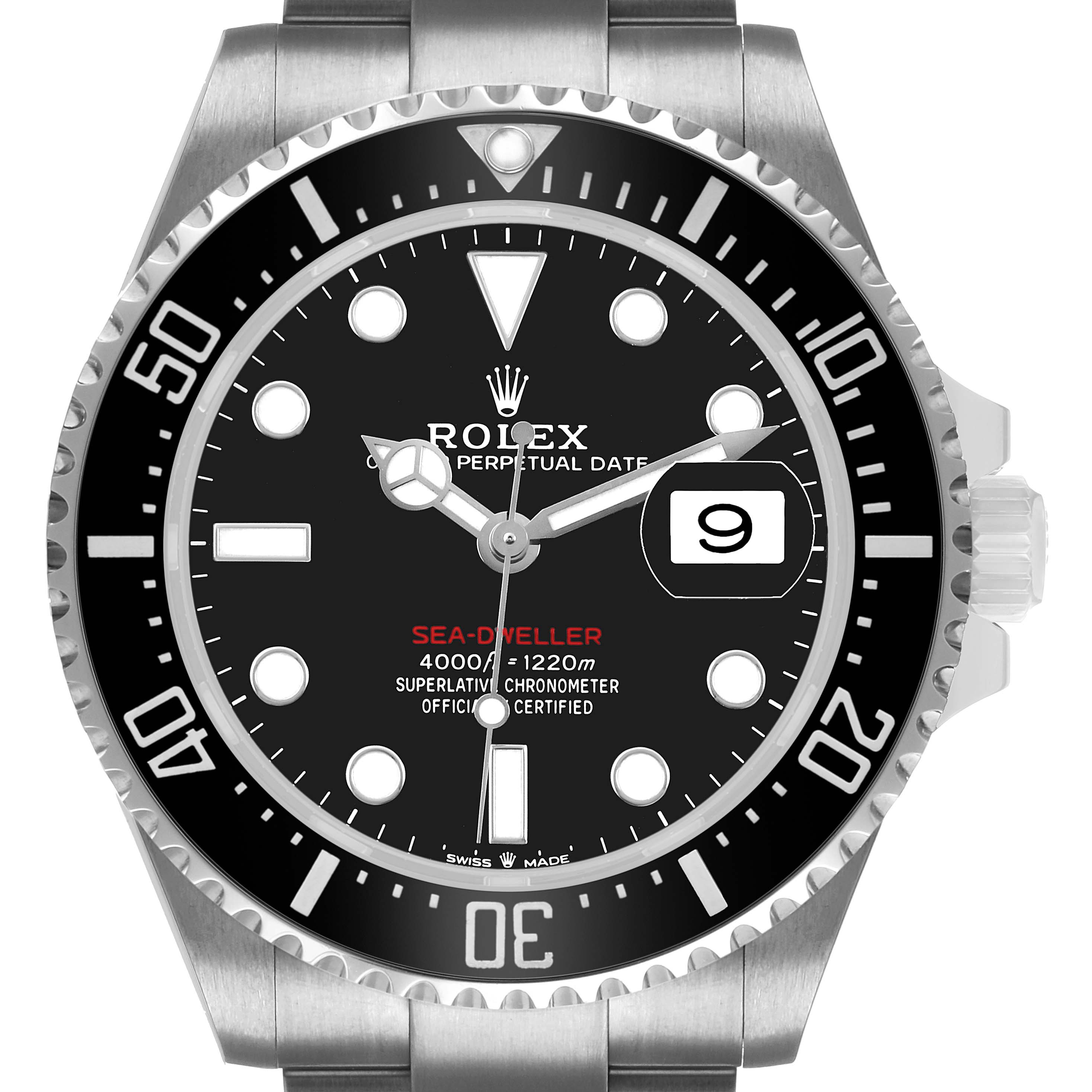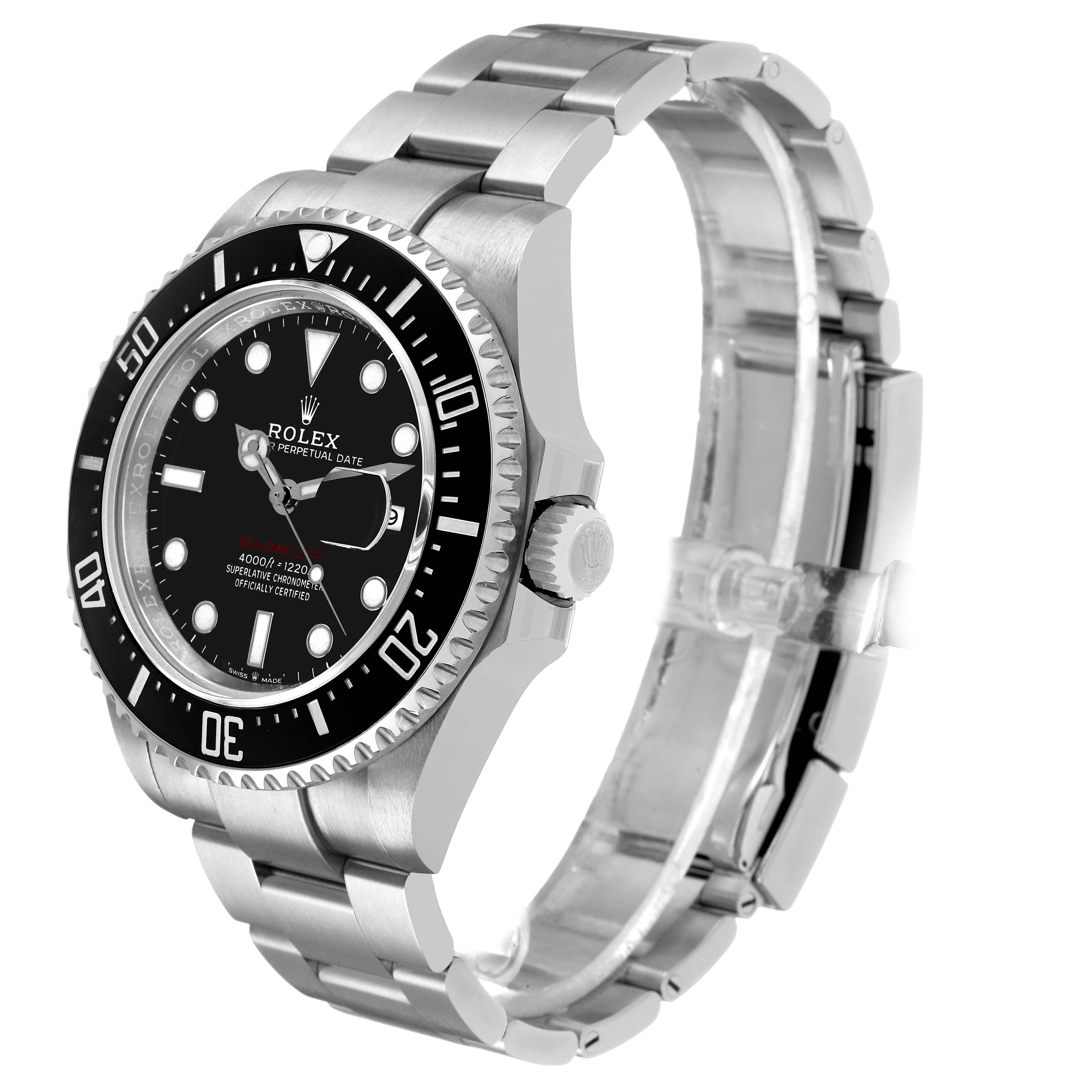 Rolex Seadweller 43 50th Anniversary Steel Black Dial Mens Watch 126600. Officially certified chronometer automatic self-winding movement. Stainless steel oyster case 43.0 mm in diameter. Rolex logo on the crown. Ceramic unidirectional rotating time-lapse bezel with numerals and graduations coated in platinum. Scratch resistant sapphire crystal with a cyclops magnifier. Black dial with white luminescent Mercedes hands and dot hour markers. Luminescent lollipop-tipped centre seconds hand. Outer stick minute markers. Red "Sea-Dweller" text. Date calendar at the 3 o'clock aperture. Stainless steel oyster bracelet with a flip-lock clasp. Fits an 8 1/4'' wrist.