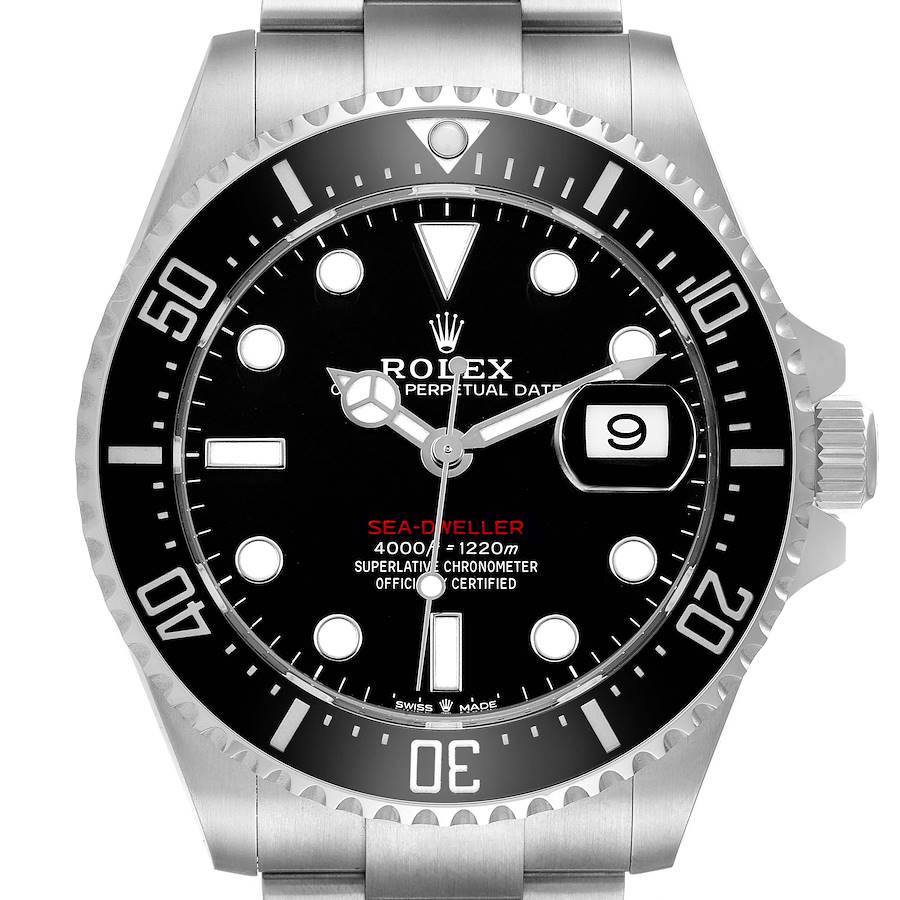 Rolex Seadweller 43 50th Anniversary Steel Black Dial Mens Watch 126600 Box Card. Officially certified chronometer automatic self-winding movement. Stainless steel oyster case 43.0 mm in diameter. Rolex logo on the crown. Ceramic unidirectional rotating time-lapse bezel with numerals and graduations coated in platinum. Scratch resistant sapphire crystal with a cyclops magnifier. Black dial with white luminescent Mercedes hands and dot hour markers. Luminescent lollipop-tipped centre seconds hand. Outer stick minute markers. Red "Sea-Dweller" text. Date calendar at the 3 o'clock aperture. Stainless steel oyster bracelet with a flip-lock clasp. Fits an 8 1/4'' wrist.