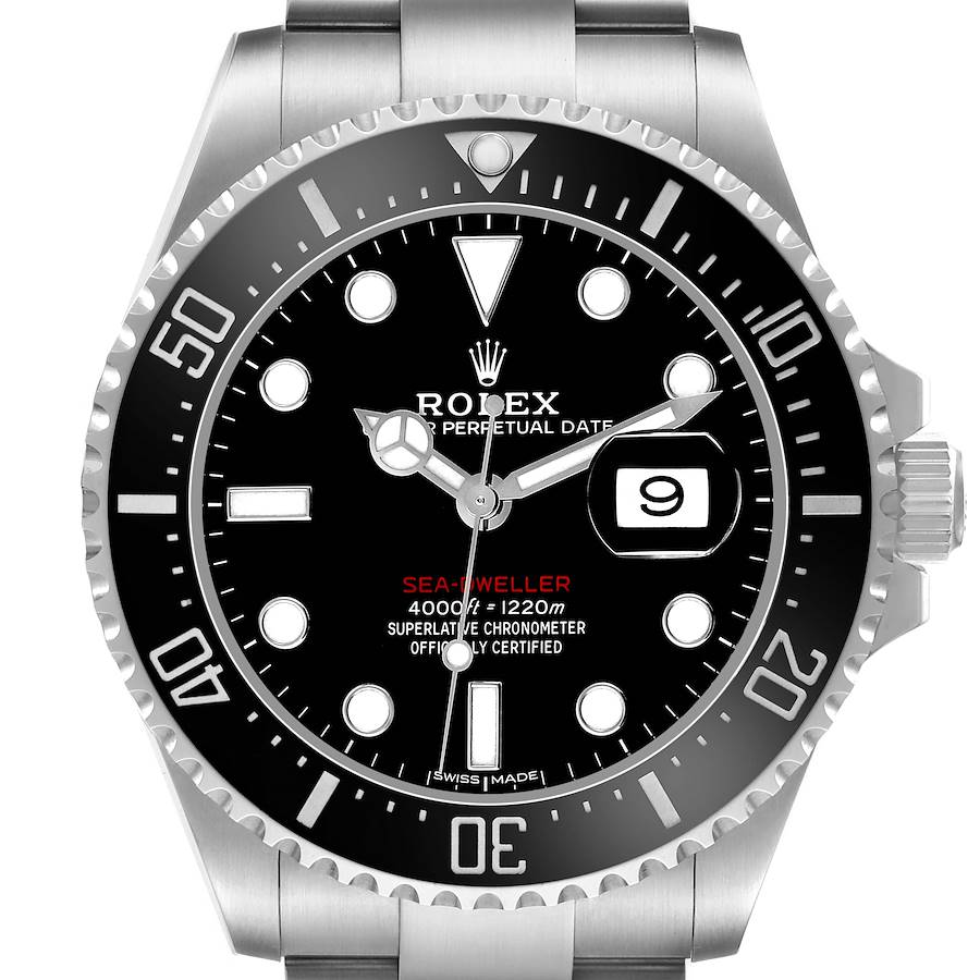 Rolex Seadweller 43 50th Anniversary Steel Black Dial Mens Watch 126600 Box Card. Officially certified chronometer automatic self-winding movement. Stainless steel oyster case 43.0 mm in diameter. Rolex logo on the crown. Ceramic unidirectional rotating time-lapse bezel with numerals and graduations coated in platinum. Scratch resistant sapphire crystal with a cyclops magnifier. Mark I black dial with white luminescent Mercedes hands and dot hour markers. Luminescent lollipop-tipped centre seconds hand. Outer stick minute markers. Red "Sea-Dweller" text. Date calendar at the 3 o'clock aperture. Stainless steel oyster bracelet with a flip-lock clasp. Fits an 8 1/2'' wrist.