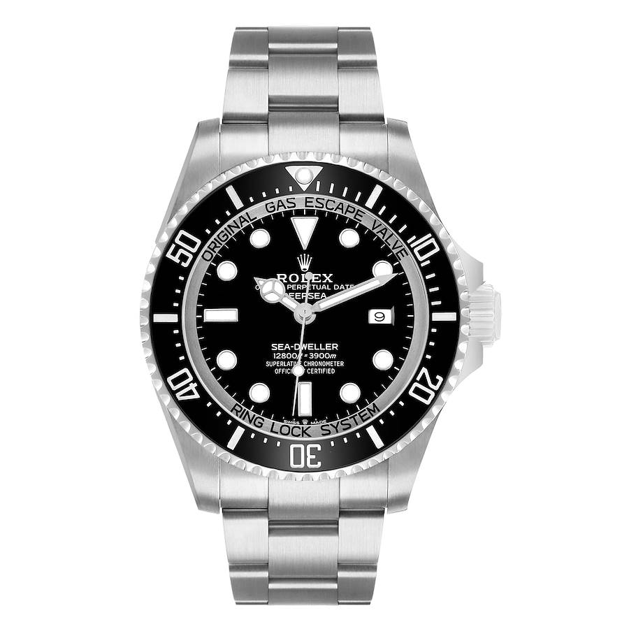 Rolex Seadweller Deepsea 44 Black Dial Steel Mens Watch 126660. Officially certified chronometer automatic self-winding movement. Stainless steel oyster case 44.0 mm in diameter. Rolex logo on the crown. Special time-lapse unidirectional rotating black Cerachrom ceramic bezel with 60-minute graduation engravings. Scratch resistant sapphire crystal. Black dial with luminescent Mercedes hands and dot hour markers. Minute markers around the outer rim. Date calendar at the 3 o'clock aperture. Special time-lapse unidirectional rotating black Cerachrom ceramic bezel with 60-minute graduation engravings.