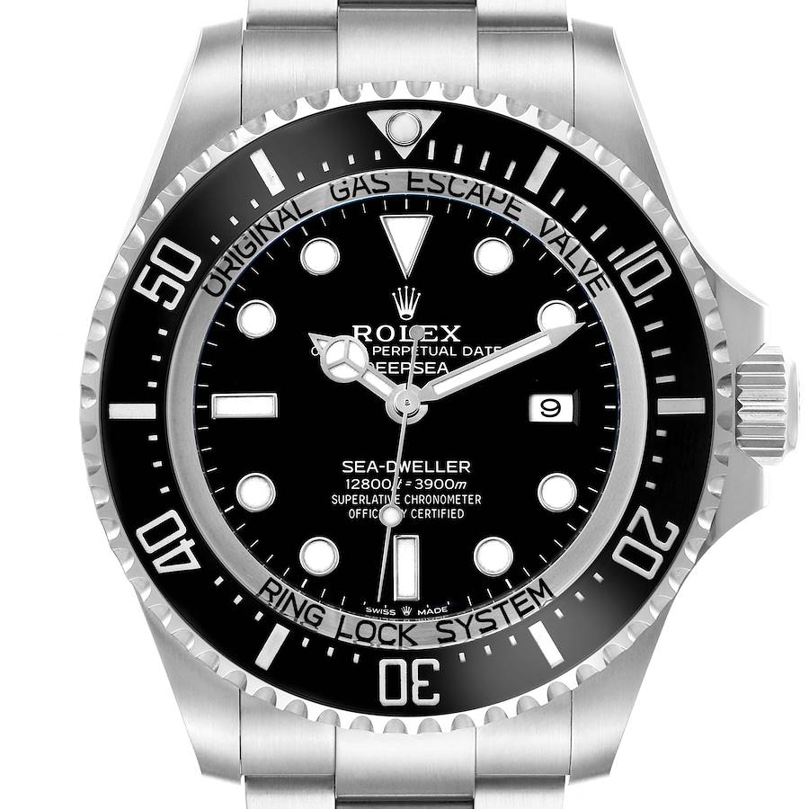 Rolex Seadweller Deepsea 44 Steel Black Dial Mens Watch 126660 Card. Officially certified chronometer automatic self-winding movement. Stainless steel oyster case 44.0 mm in diameter. Rolex logo on the crown. Special time-lapse unidirectional rotating black Cerachrom ceramic bezel with 60-minute graduation engravings. Scratch resistant sapphire crystal. Black dial with luminescent Mercedes hands and dot hour markers. Minute markers around the outer rim. Date calendar at the 3 o'clock aperture. Stainless steel oyster bracelet with a flip-lock clasp. Fits an 8.5" wrist.