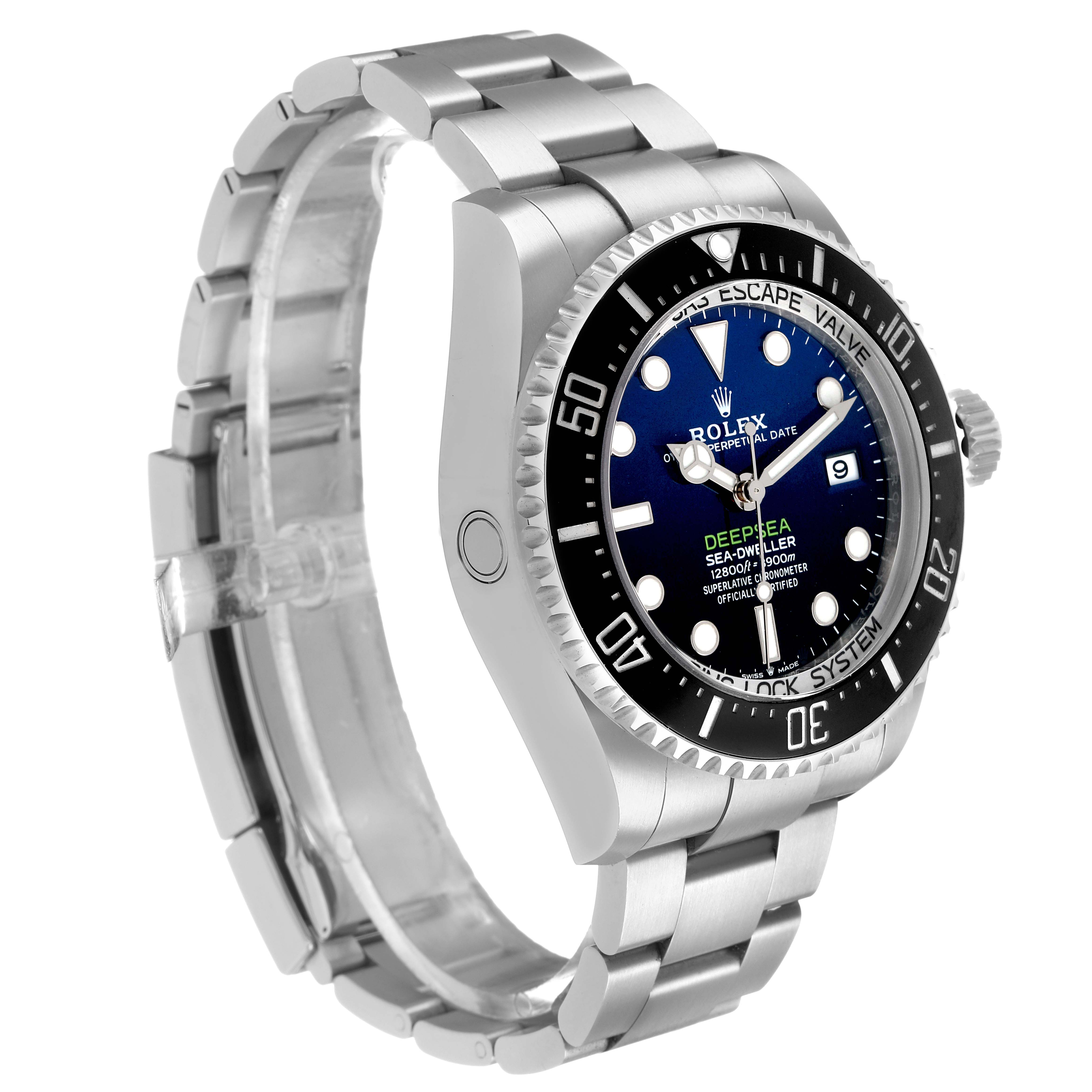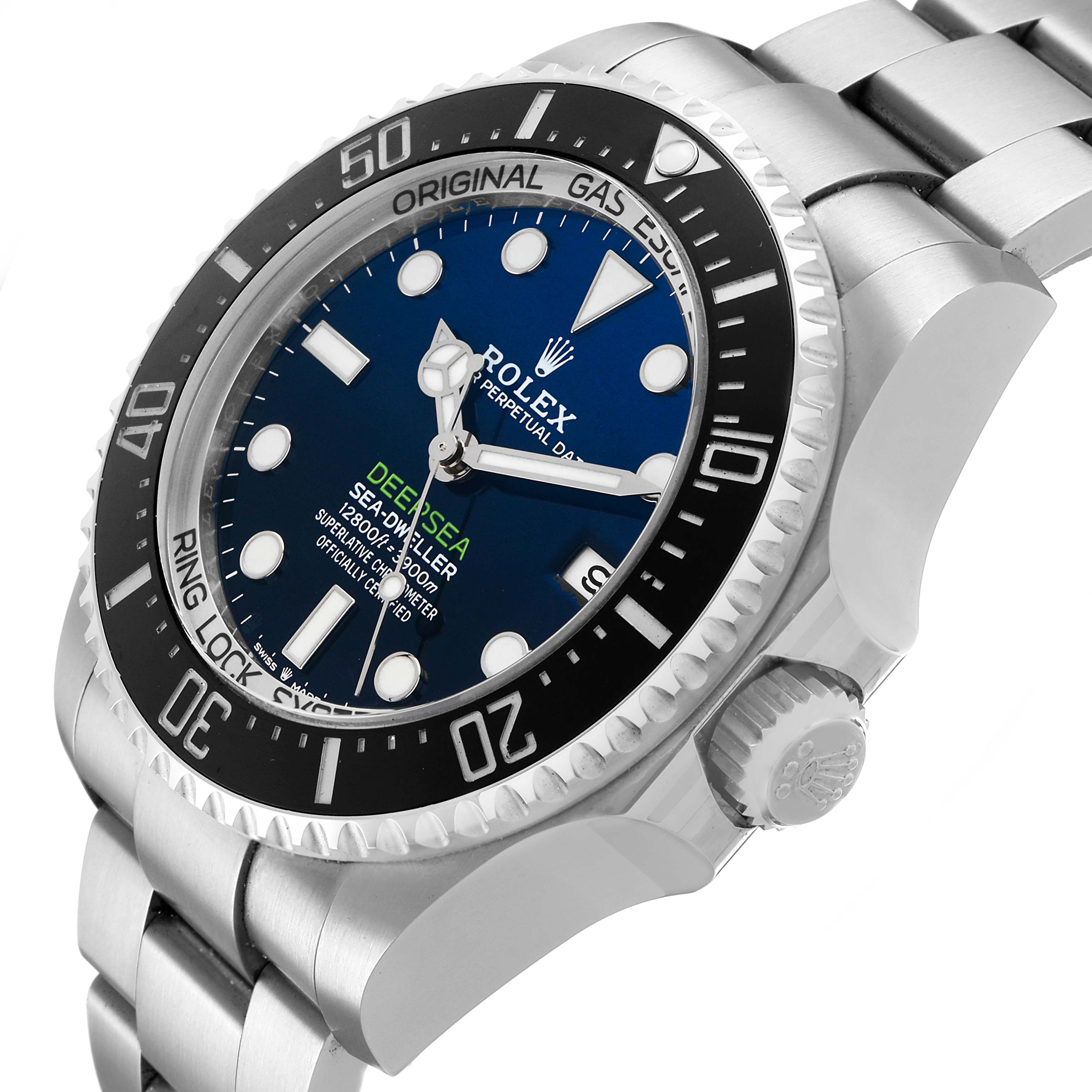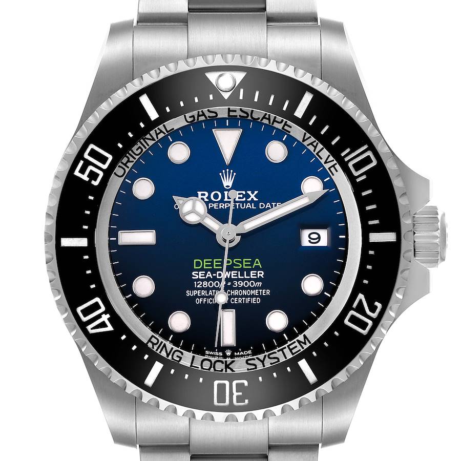 Rolex Seadweller Deepsea Cameron D-Blue Dial Steel Mens Watch 136660 Box Card+ 1 EXTRA LINK INSTALLED, FINAL SALE. Officially certified chronometer, automatic self-winding movement. Paramagnetic blue Parachrom hairspring. High-performance Paraflex shock absorbers. Bidirectional self-winding via Perpetual rotor. Stainless steel oyster case 44.0 mm in diameter. Pointed crown guards. Rolex logo on the crown. Special time-lapse unidirectional rotating Cerachrom ceramic black bezel with 60-minute graduations. Scratch-resistant sapphire crystal. Gradient deep blue dial with luminescent Mercedes hands and dot hour markers. Minute markers around the outer rim. Date calendar at the 3 o'clock aperture. Stainless steel oyster bracelet with a flip-lock clasp. Fits an 8 1/4" wrist.
