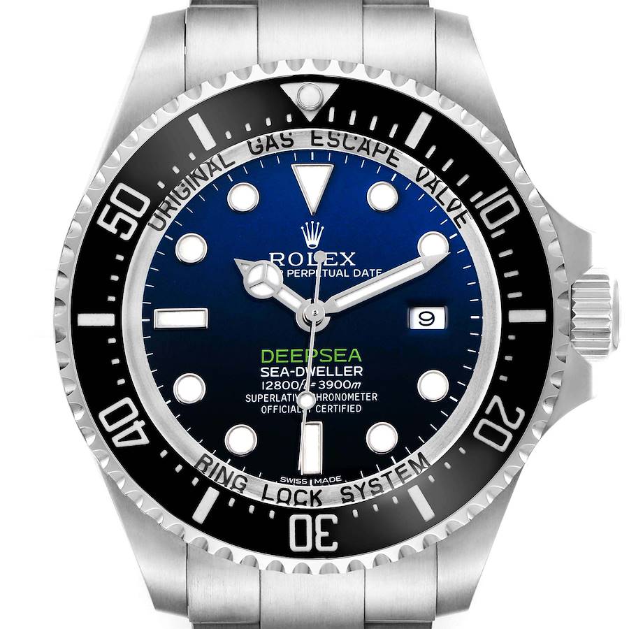 Rolex Seadweller Deepsea Cameron D-Blue Steel Mens Watch 116660 Box Card. Officially certified chronometer automatic self-winding movement. Stainless steel oyster case 44.0 mm in diameter. Rolex logo on the crown. Pointed crown guards. Special time-lapse unidirectional rotating Cerachrom ceramic bezel engraved with 60-minute graduations. Scratch resistant sapphire crystal. Gradient deep blue dial with luminescent Mercedes hands and dot hour markers. Central sweeping luminescent lollipop-tipped seconds hand. Minute markers on outer track. Date calendar at the 3 o'clock aperture. Stainless steel oyster bracelet with a flip-lock clasp. Fits an 8.5" wrist.