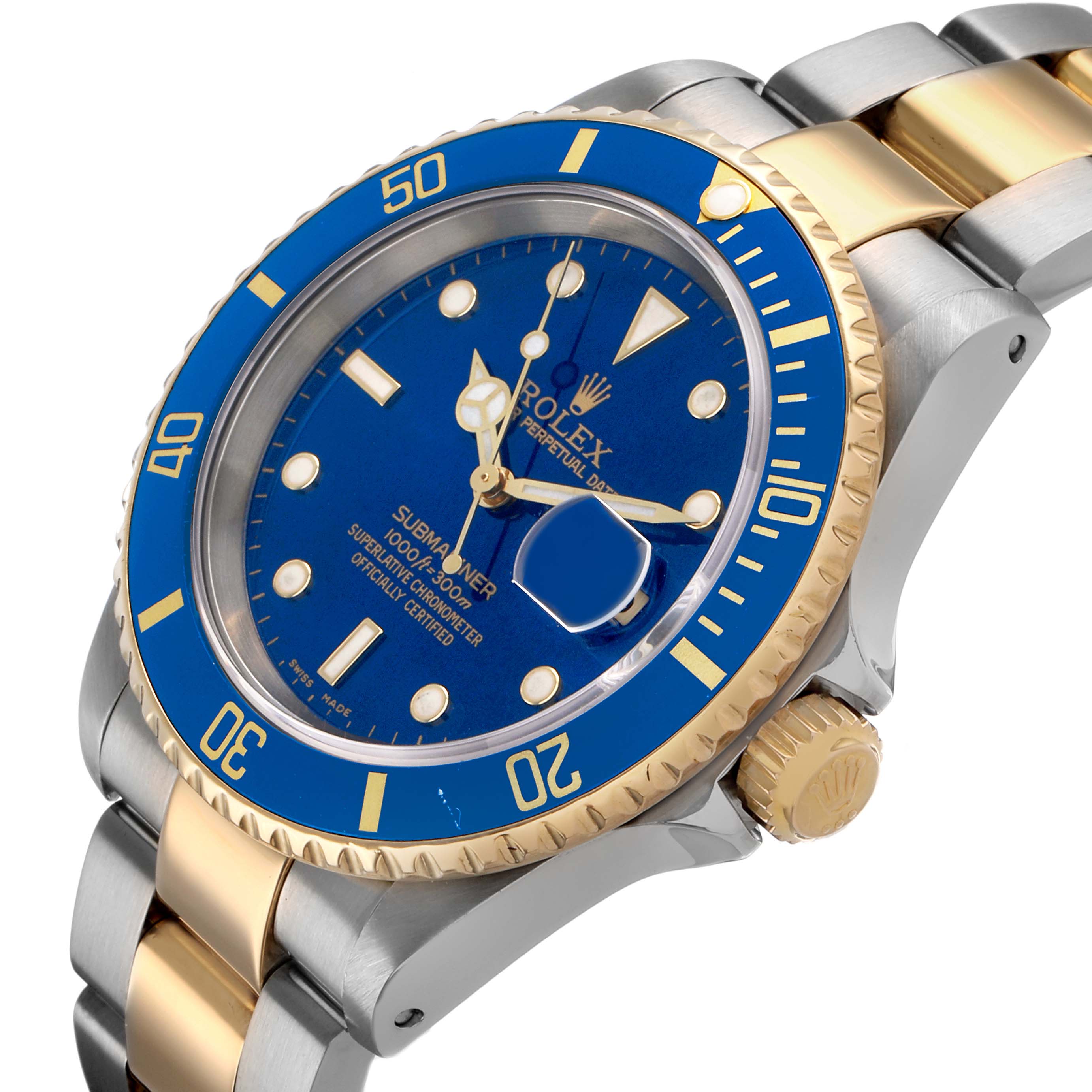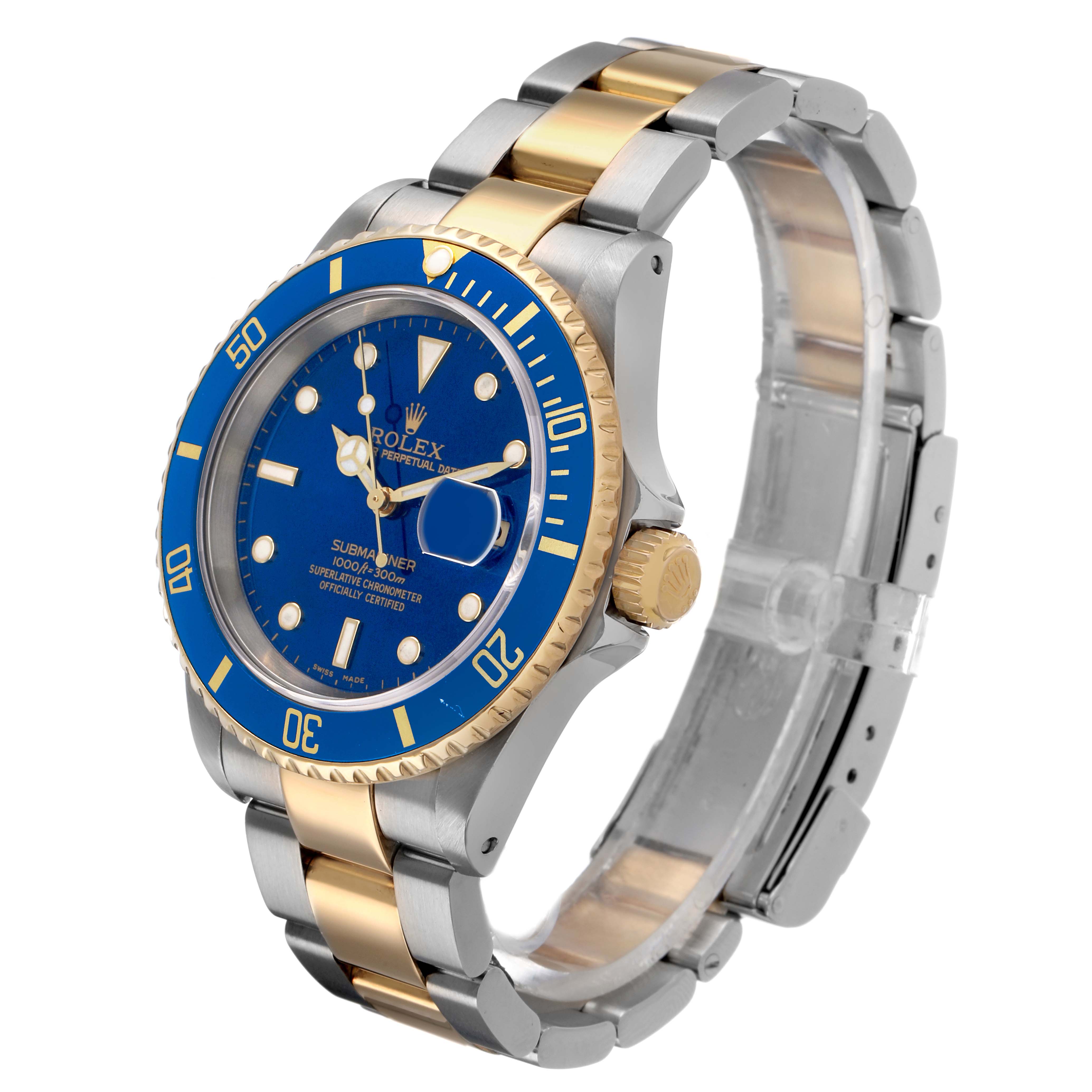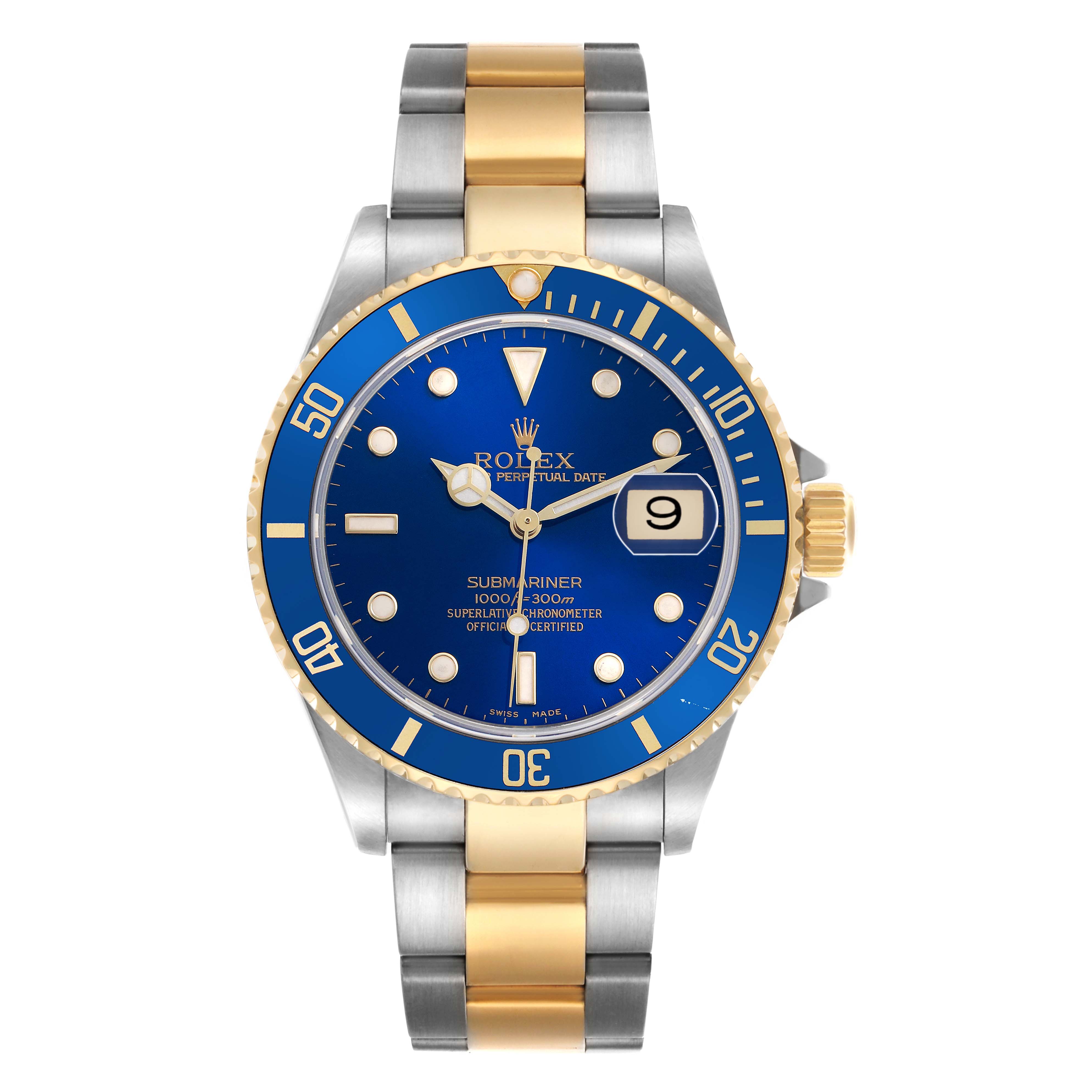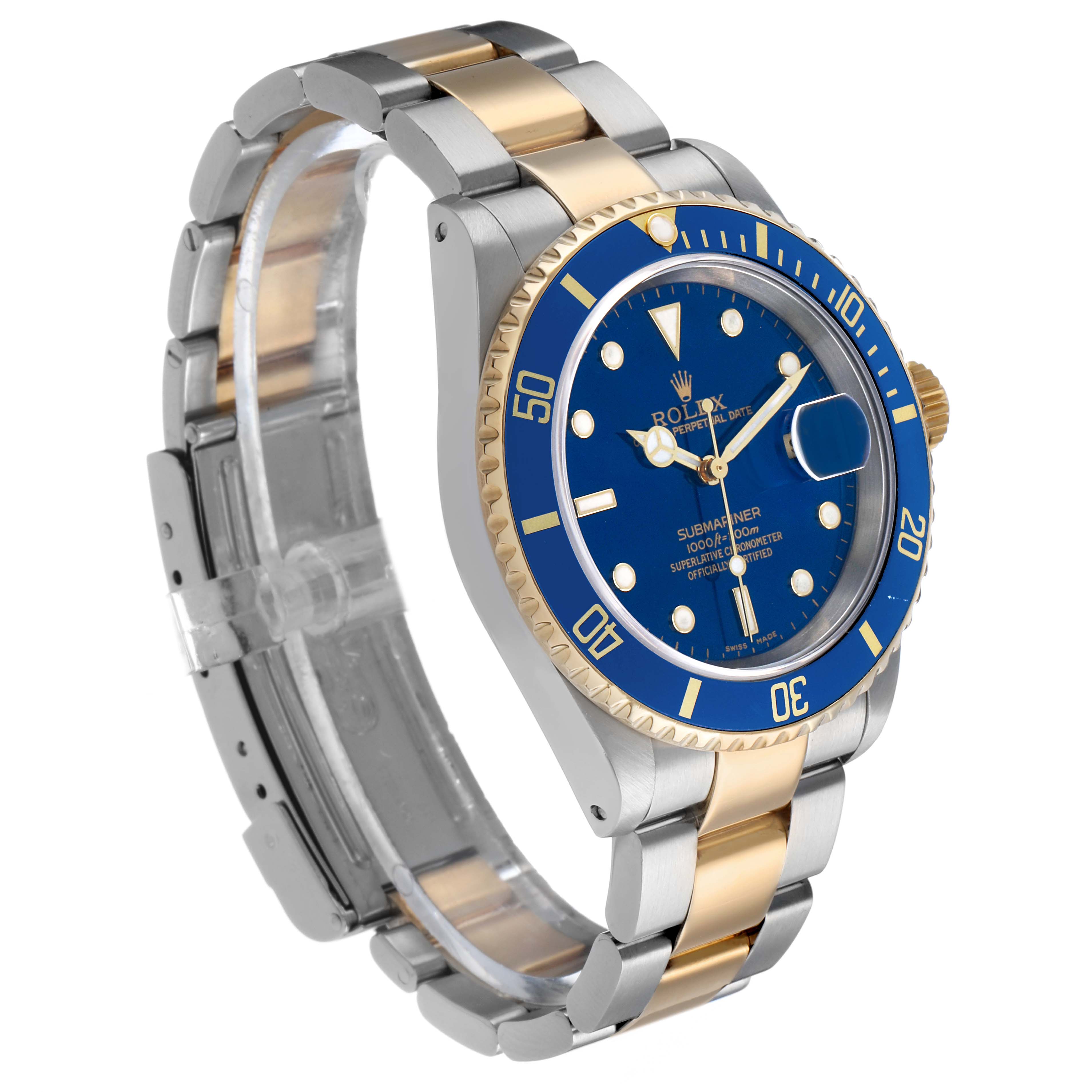 Rolex Submariner Blue Dial Steel Yellow Gold Mens Watch 16613 Box Papers. Officially certified chronometer automatic self-winding movement. Stainless steel and 18k yellow gold oyster case 40.0 mm in diameter. Rolex logo on the 18k yellow gold crown. Pointed crown guards. Special time-lapse unidirectional 18k yellow gold rotating blue insert bezel with a 60 minute graduation coated in gold. Scratch resistant sapphire crystal with a cyclops magnifier. Blue dial with luminescent yellow gold outlined Mercedes hands and dot hour markers. Outer stick minute markers. Date calendar at the 3 o'clock aperture. Stainless steel and 18k yellow gold oyster bracelet with a flip-lock clasp. Fits a 7 1/4" wrist.