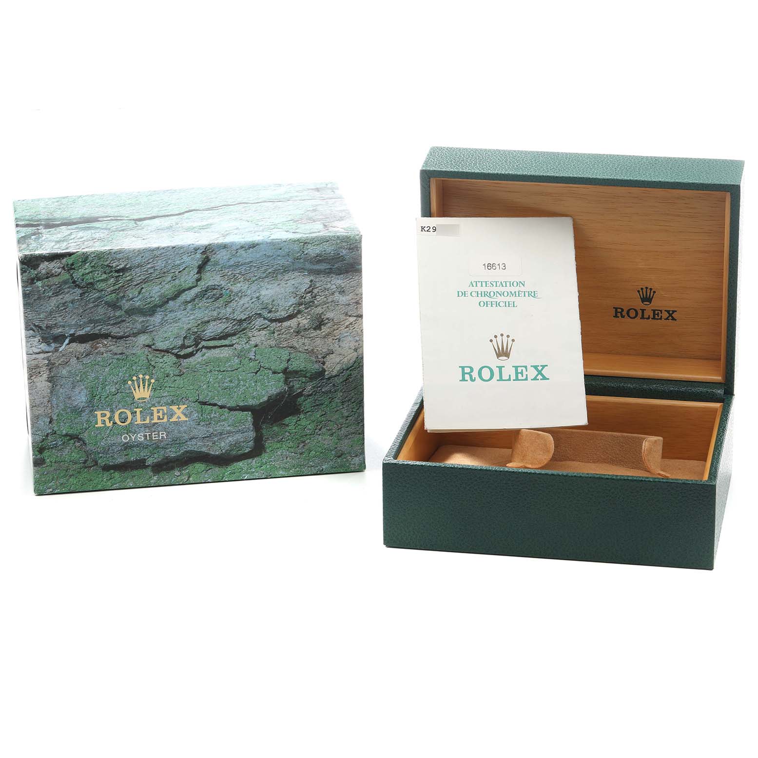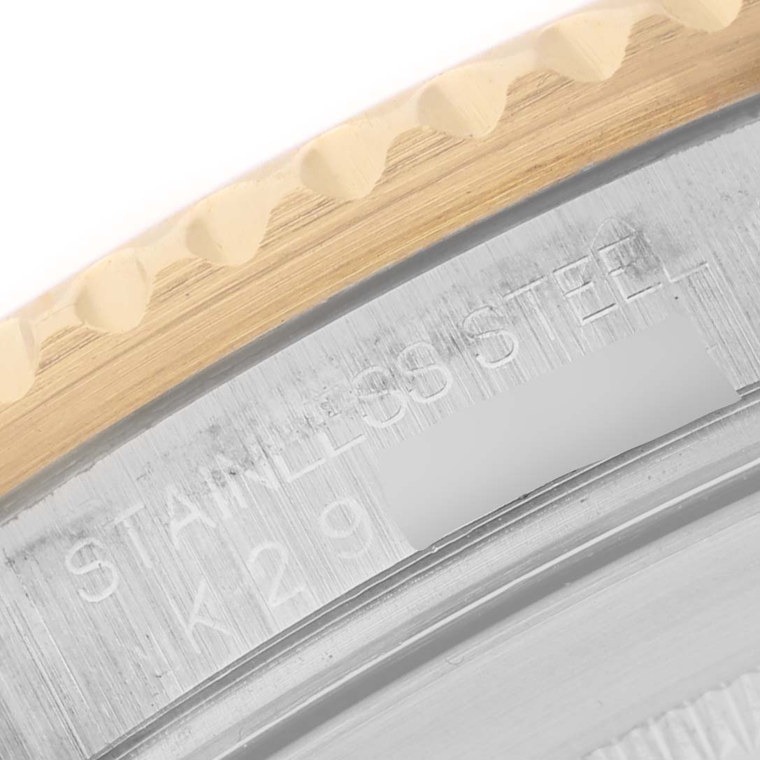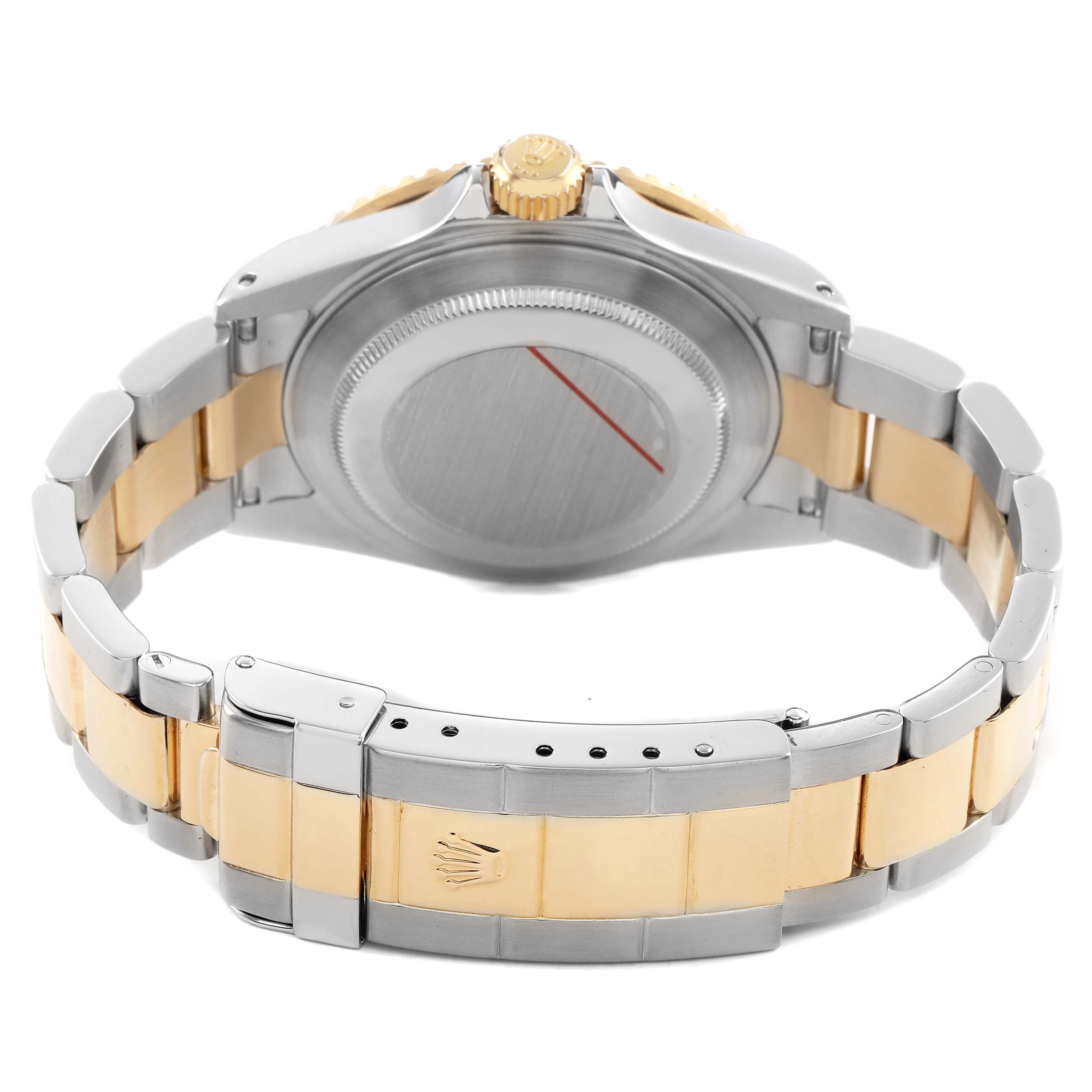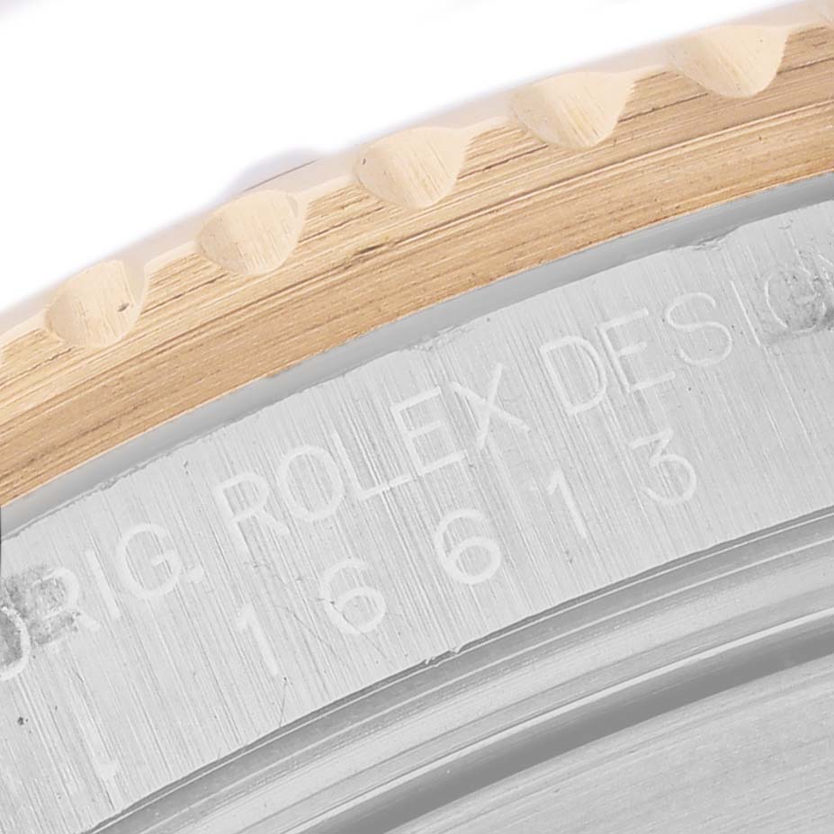 Rolex Submariner Blue Dial Steel Yellow Gold Mens Watch 16613 Box Papers. Officially certified chronometer automatic self-winding movement. Stainless steel and 18k yellow gold oyster case 40.0 mm in diameter. Rolex logo on the 18k yellow gold crown. Pointed crown guards. Special time-lapse unidirectional 18k yellow gold rotating blue insert bezel with a 60 minute graduation coated in gold. Scratch resistant sapphire crystal with a cyclops magnifier. Blue dial with luminescent yellow gold outlined Mercedes hands and dot hour markers. Outer stick minute markers. Date calendar at the 3 o'clock aperture. Stainless steel and 18k yellow gold oyster bracelet with a flip-lock clasp. Fits a 7 1/4" wrist.