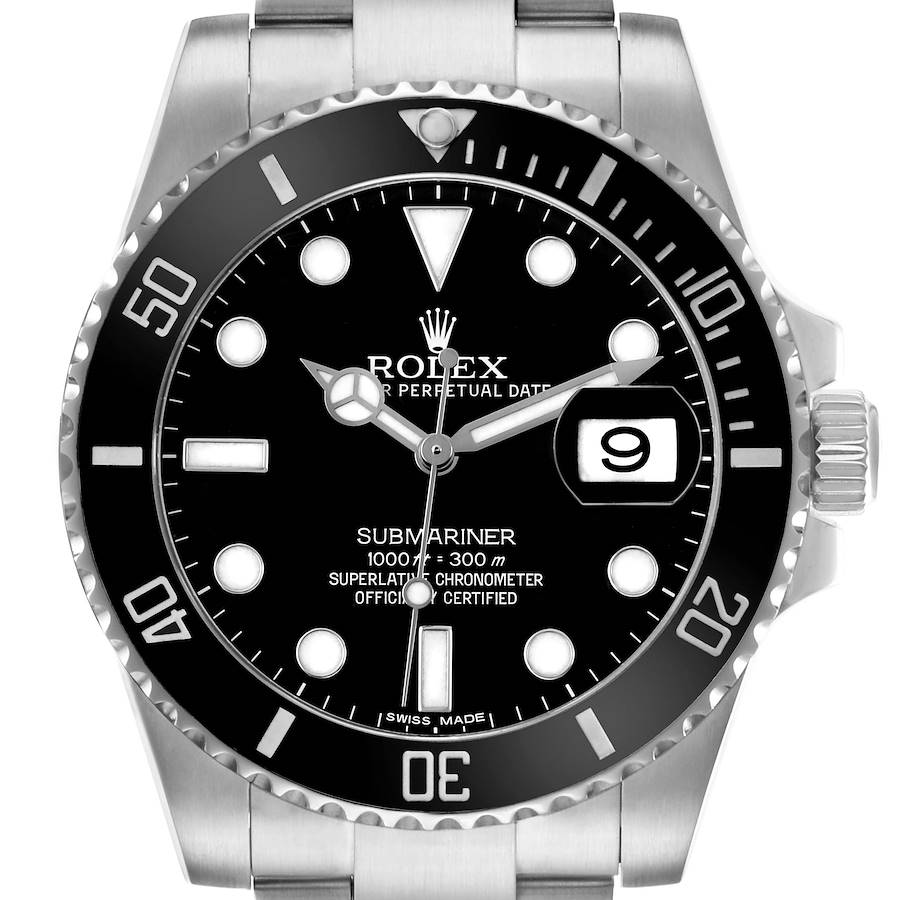 Rolex Submariner Date Ceramic Bezel Black Dial Steel Mens Watch 116610 Card. Officially certified chronometer automatic self-winding movement. Stainless steel oyster case 40.0 mm in diameter. Pointed crown guards. Rolex logo on the crown. Black Cerachrom ceramic unidirectional rotating time-lapse bezel engraved with 60-minute graduation. Scratch resistant sapphire crystal with a cyclops magnifier. Black dial with luminescent Mercedes hands and dot hour markers. Luminescent central lollipop-tipped seconds hand. Date calendar at the 3 o'clock aperture. Outer stick minute markers. Stainless steel oyster bracelet with a flip-lock clasp. Fits a 7 3/4" wrist.