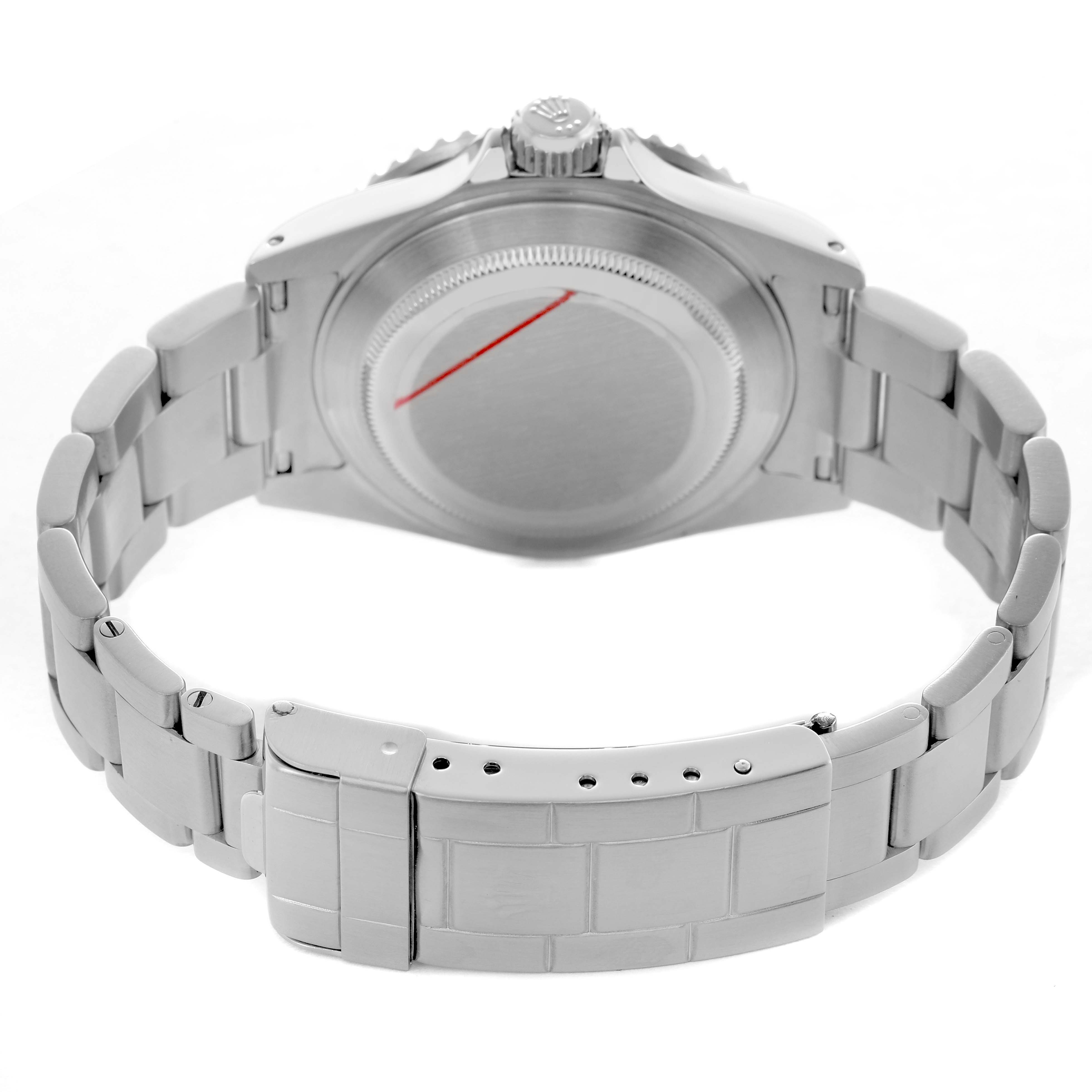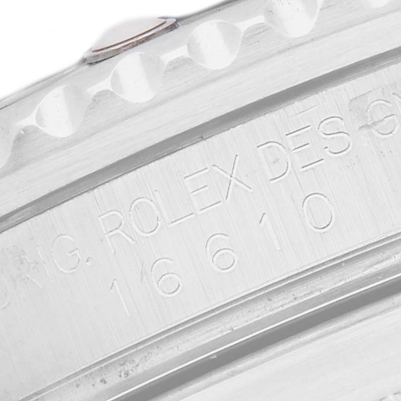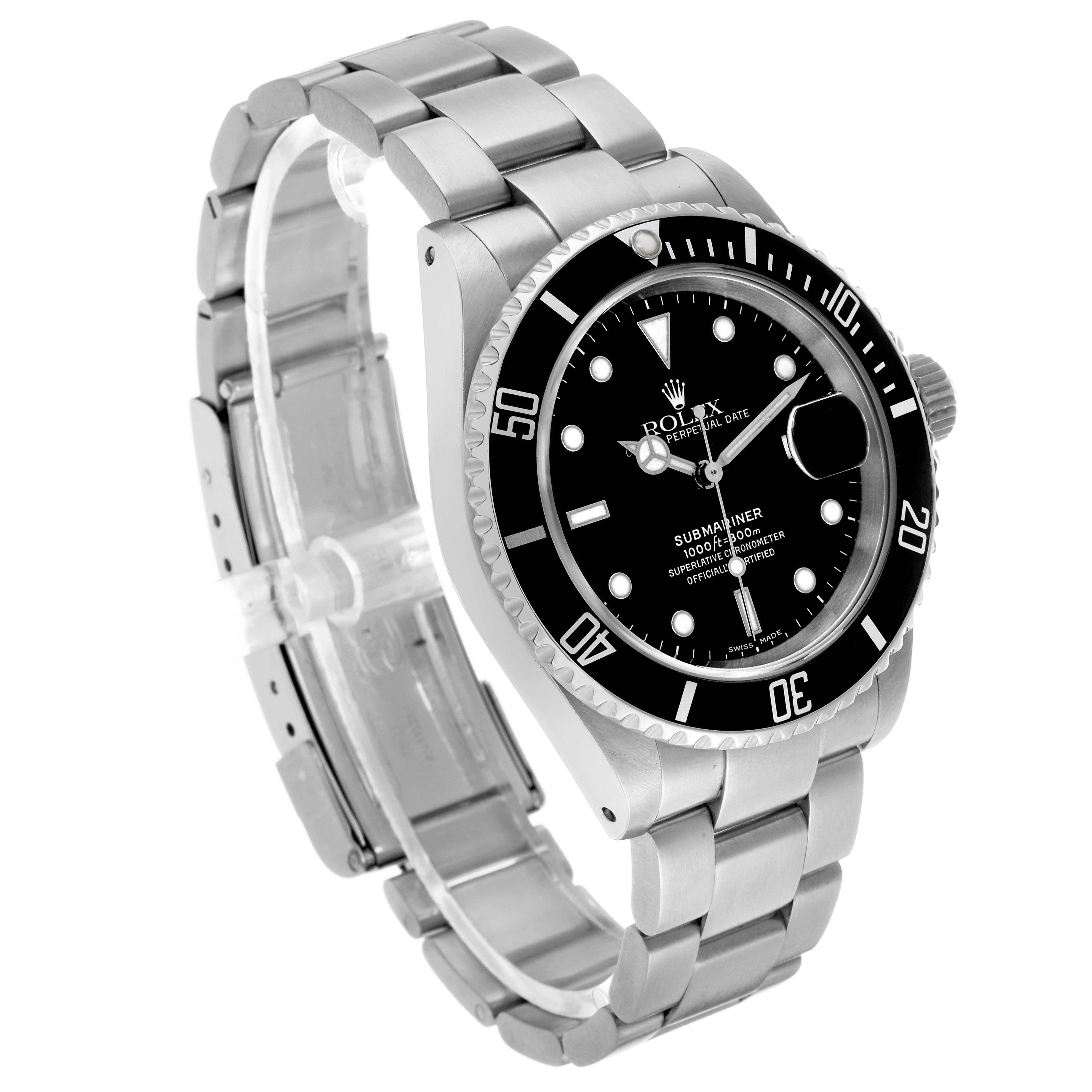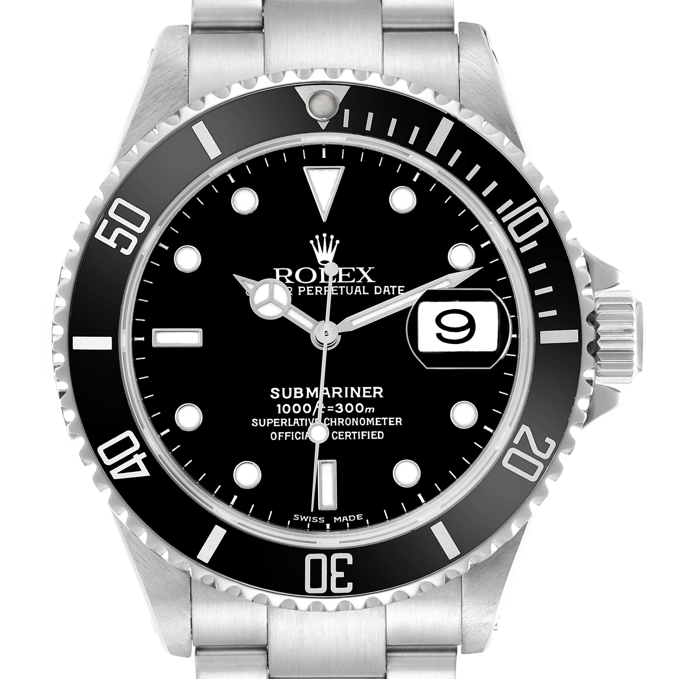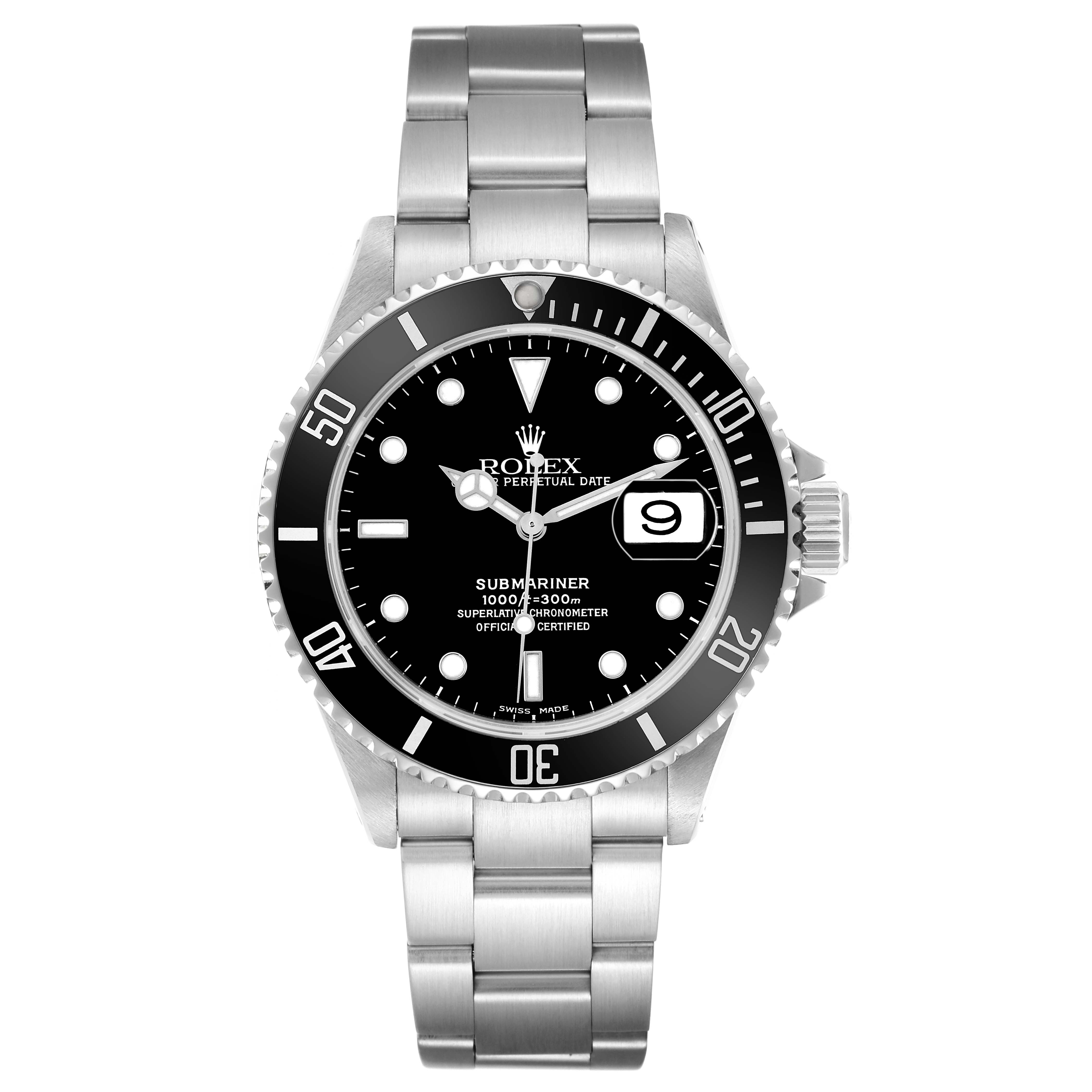 Rolex Submariner Date Steel Black Bezel Mens Watch 16610. Officially certified chronometer automatic self-winding movement. Stainless steel oyster case 40.0 mm in diameter. Pointed crown guards. Rolex logo on the crown. Black unidirectional rotating time-lapse bezel engraved with 60-minute graduation. Scratch-resistant sapphire crystal with a cyclops magnifier. Black dial with luminescent Mercedes hands and dot hour markers. Date calendar at the 3 o'clock aperture. Outer stick minute markers. Stainless steel oyster bracelet with a flip-lock clasp. Fits a 7 3/4" wrist.
