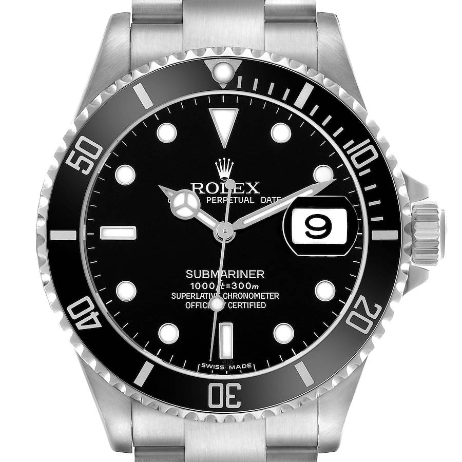 Rolex Submariner Date Steel Black Bezel Mens Watch 16610. Officially certified chronometer automatic self-winding movement. Stainless steel oyster case 40.0 mm in diameter. Pointed crown guards. Rolex logo on the crown. Black unidirectional rotating time-lapse bezel engraved with 60-minute graduation. Scratch-resistant sapphire crystal with a cyclops magnifier. Black dial with luminescent Mercedes hands and dot hour markers. Date calendar at the 3 o'clock aperture. Outer stick minute markers. Stainless steel oyster bracelet with a flip-lock clasp. Fits a 7 1/4" wrist.