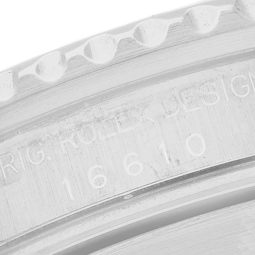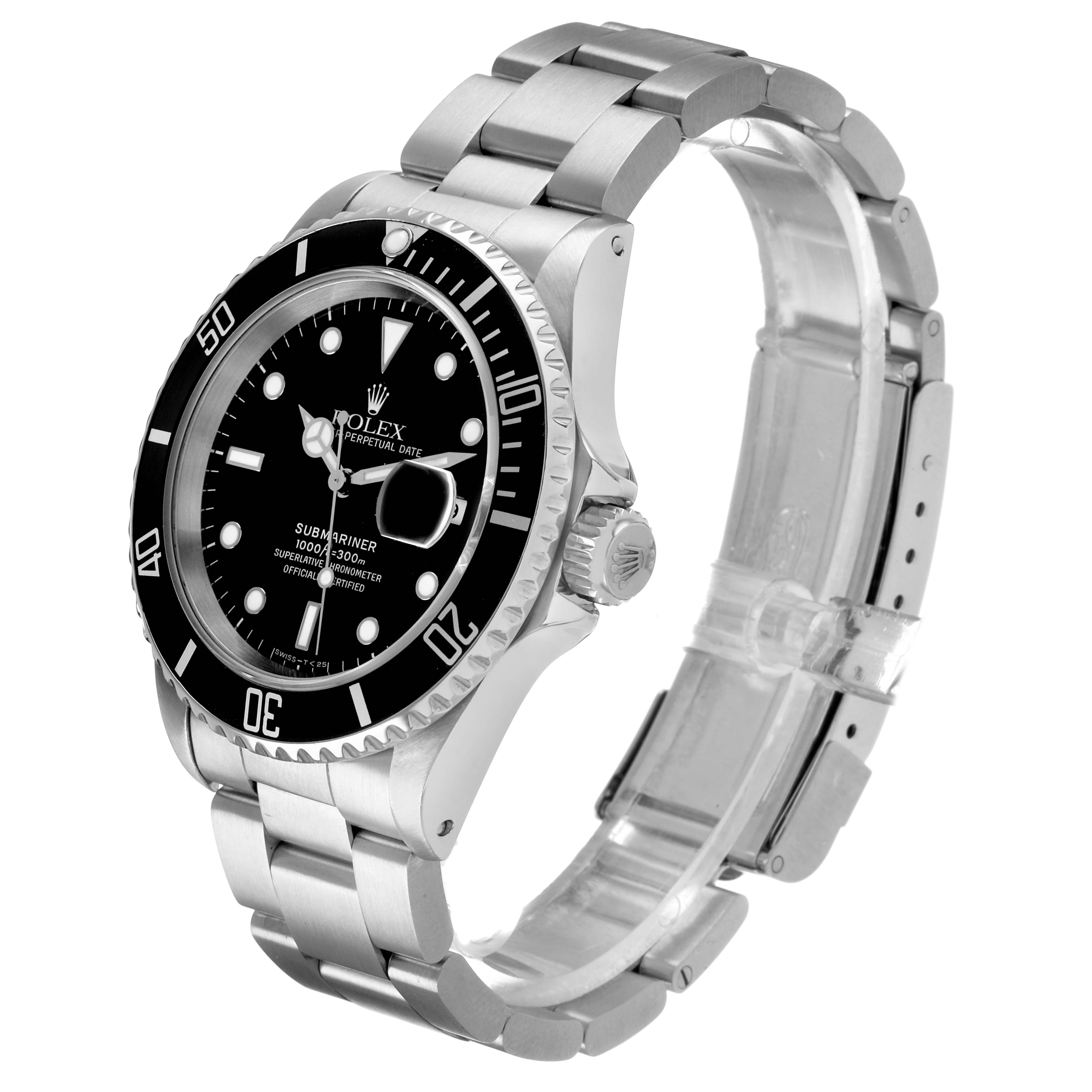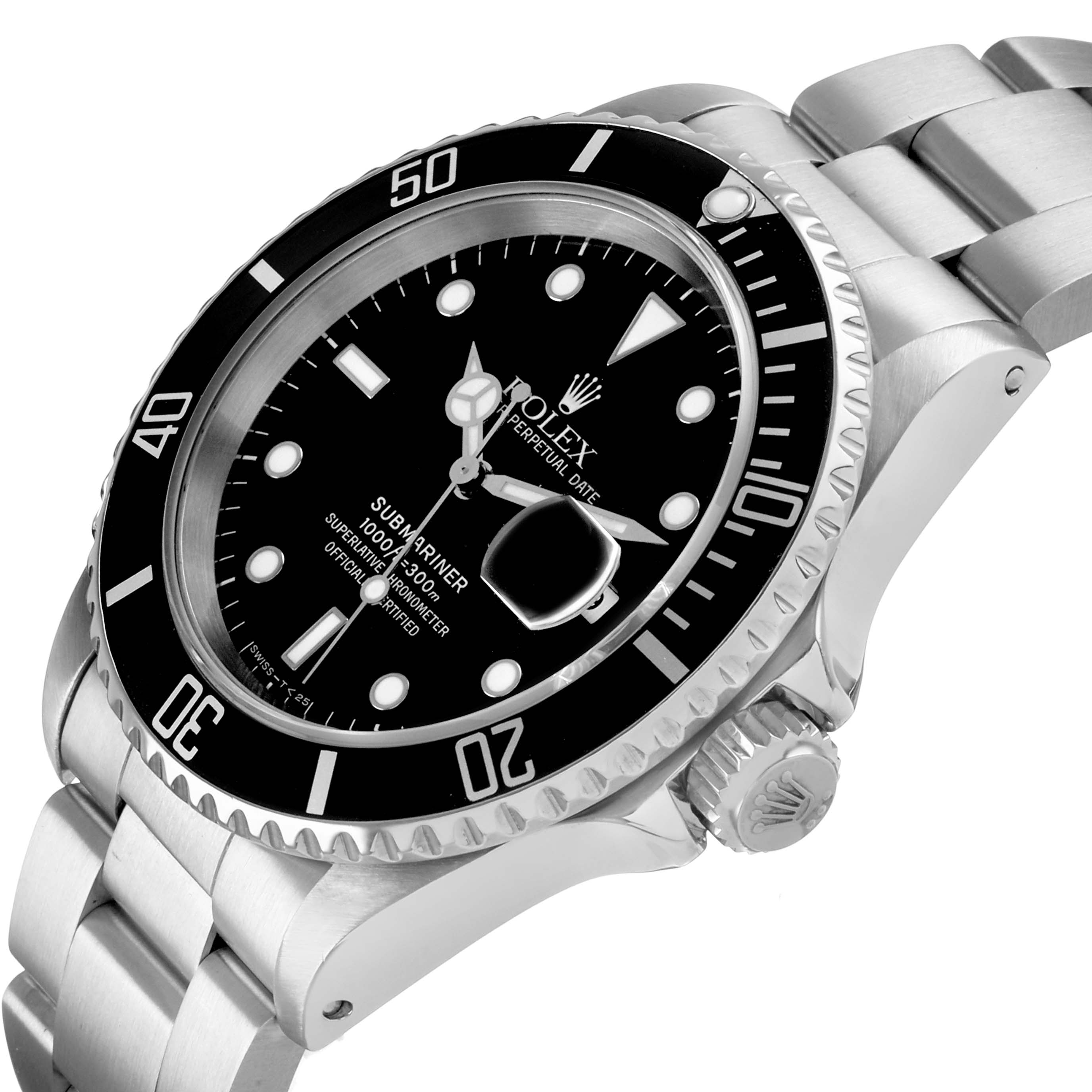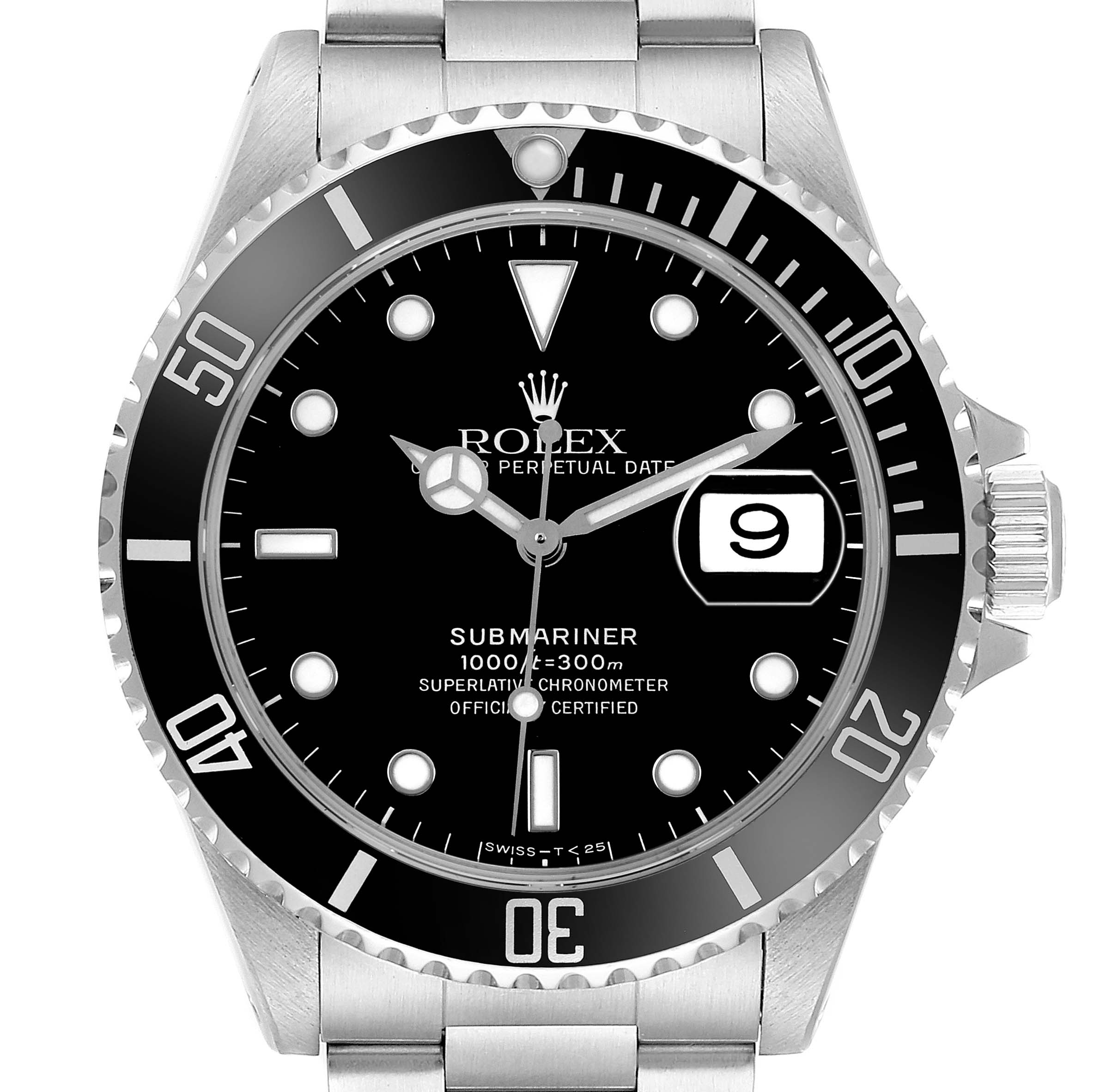 Rolex Submariner Date Steel Black Dial Mens Watch 16610. Officially certified chronometer automatic self-winding movement. Stainless steel oyster case 40.0 mm in diameter. Pointed crown guards. Rolex logo on the crown. Black unidirectional rotating time-lapse bezel engraved with 60-minute graduation. Scratch-resistant sapphire crystal with a cyclops magnifier. Black dial with luminescent Mercedes hands and dot hour markers. Date calendar at the 3 o'clock aperture. Outer stick minute markers. Stainless steel oyster bracelet with a flip-lock clasp. Fits a 7 1/2" wrist.