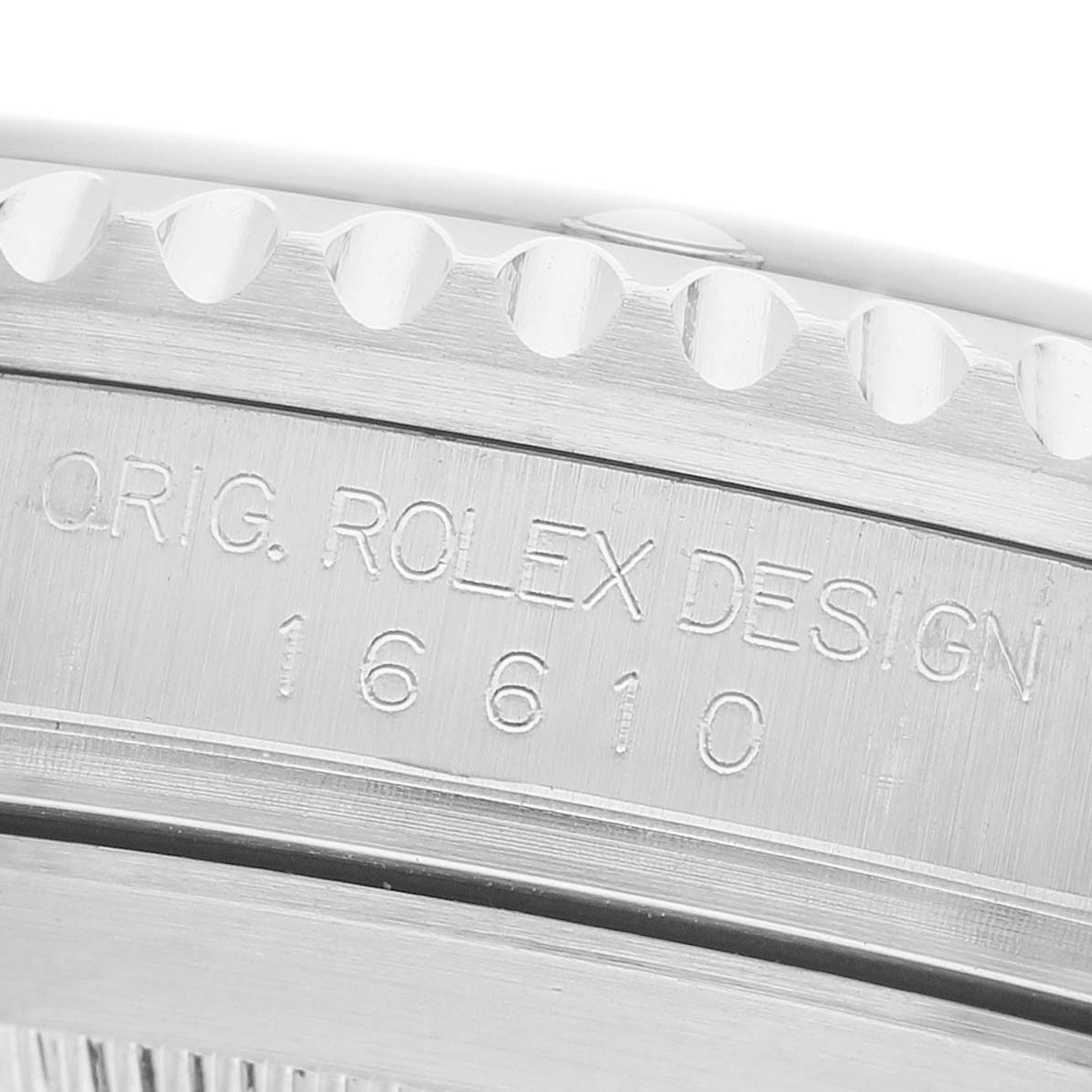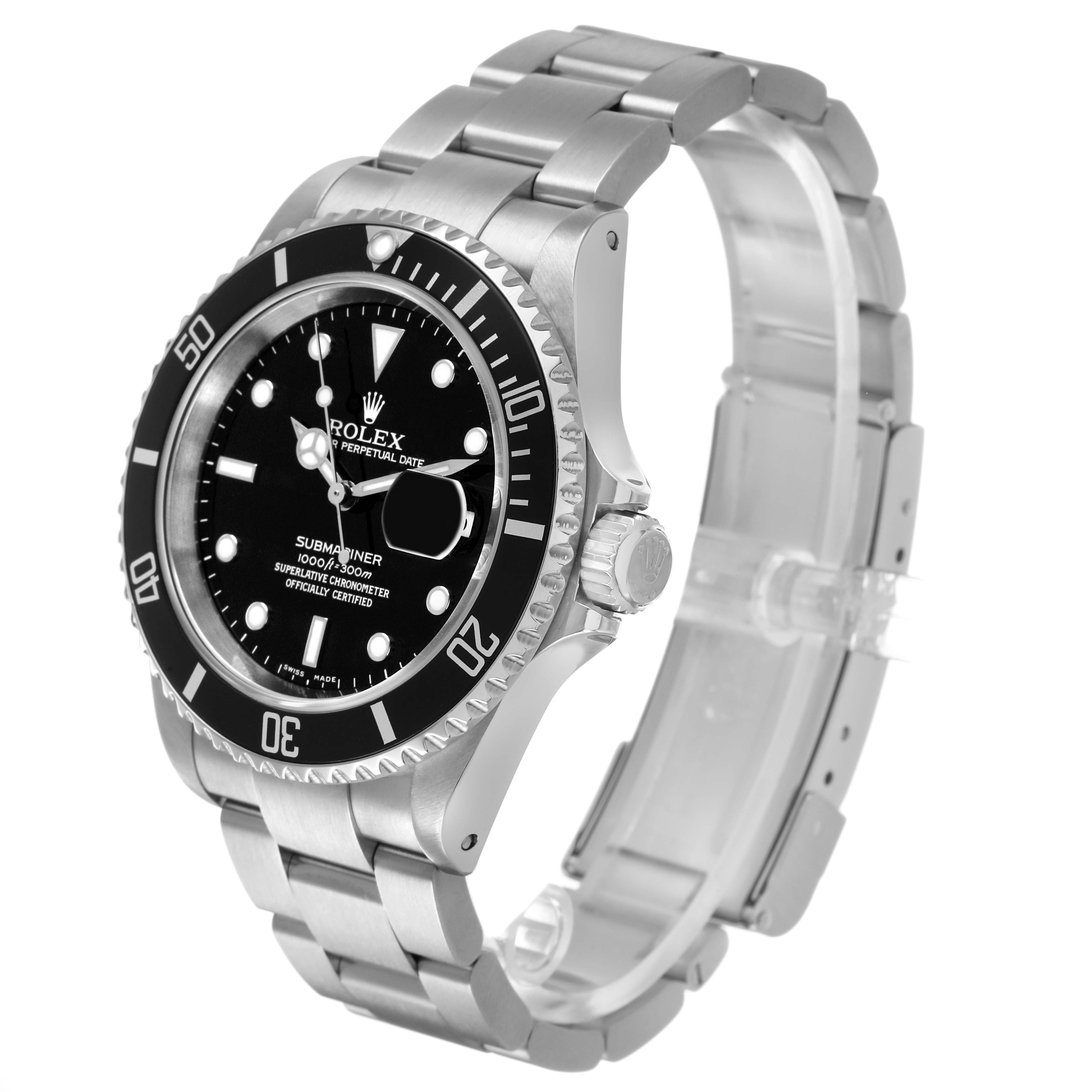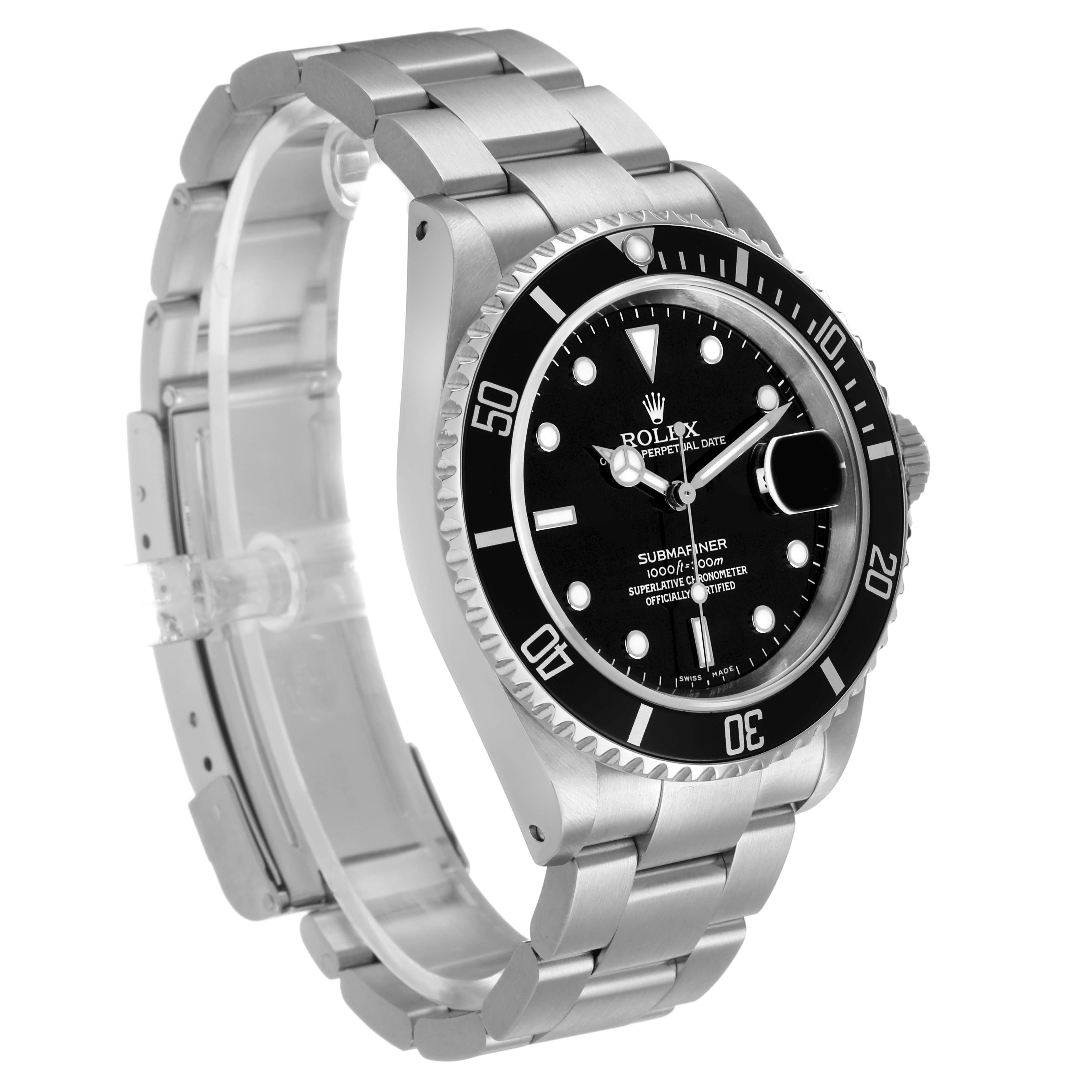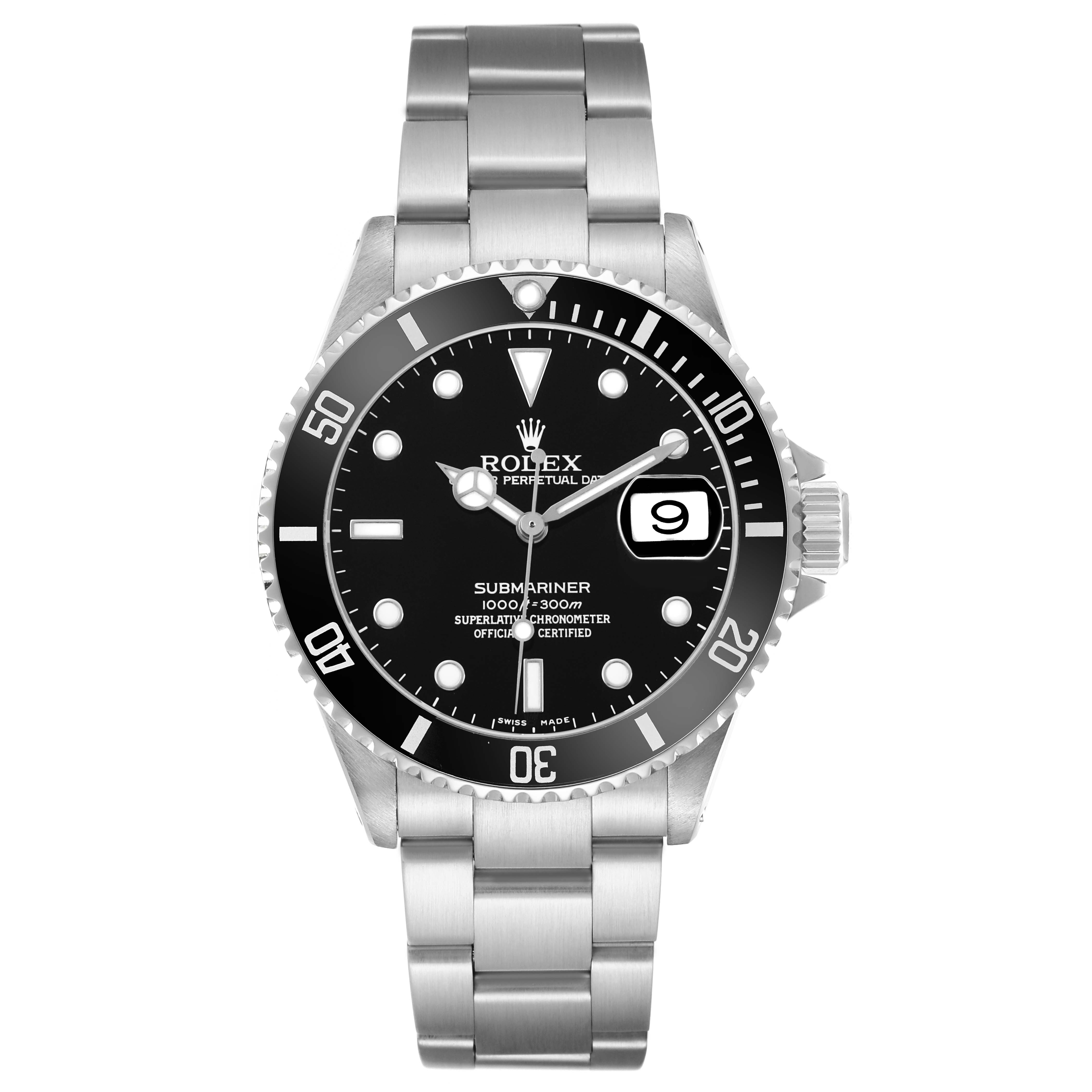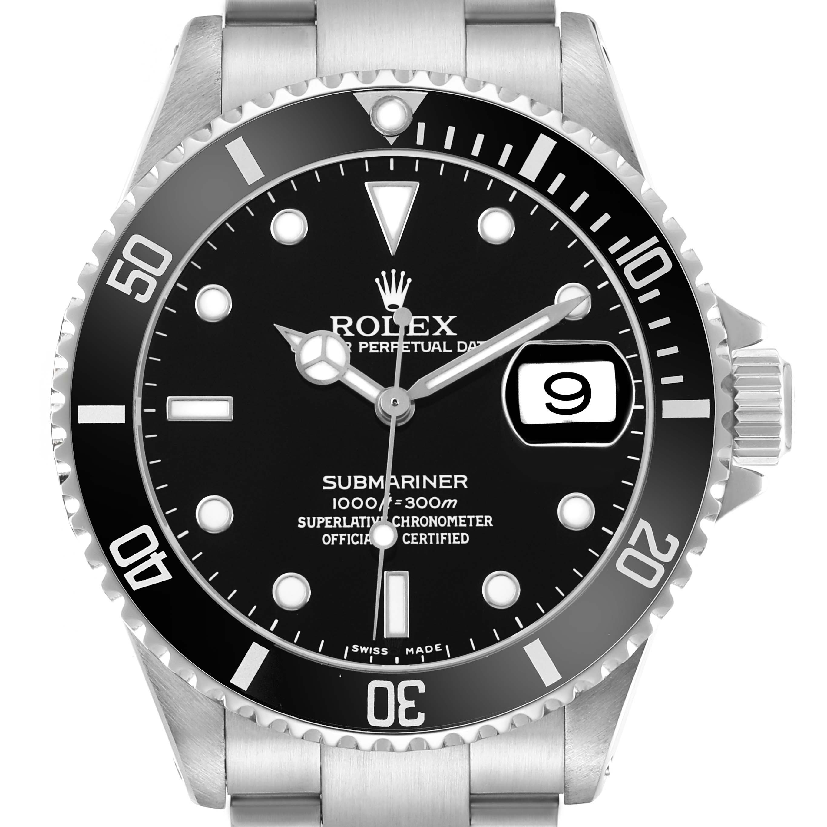 Rolex Submariner Date Steel Black Dial Mens Watch 16610. Officially certified chronometer automatic self-winding movement. Stainless steel oyster case 40.0 mm in diameter. Pointed crown guards. Rolex logo on the crown. Black unidirectional rotating time-lapse bezel engraved with 60-minute graduation. Scratch-resistant sapphire crystal with a cyclops magnifier. Black dial with luminescent Mercedes hands and dot hour markers. Date calendar at the 3 o'clock aperture. Outer stick minute markers. Stainless steel oyster bracelet with a flip-lock clasp. Fits a 7.5" wrist.