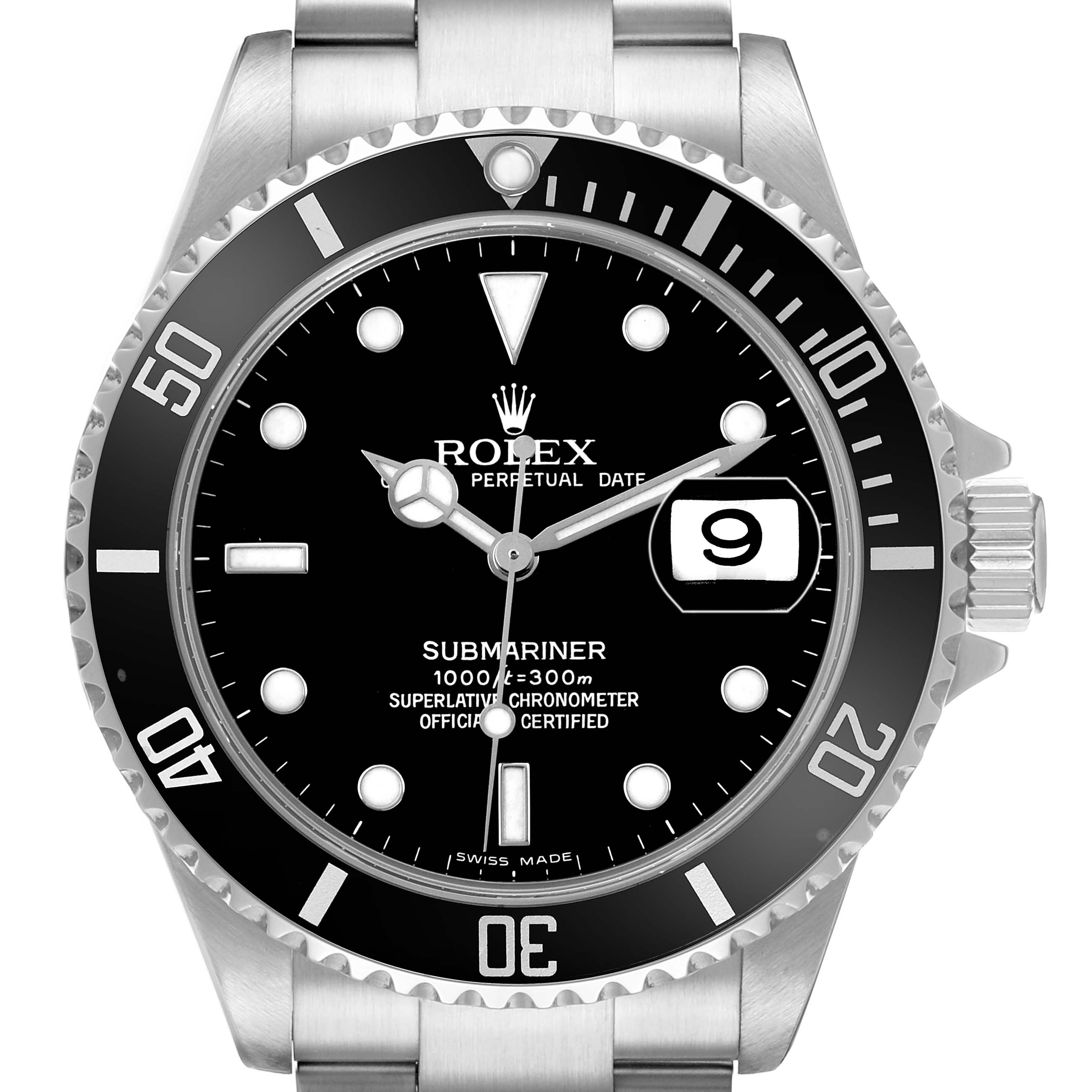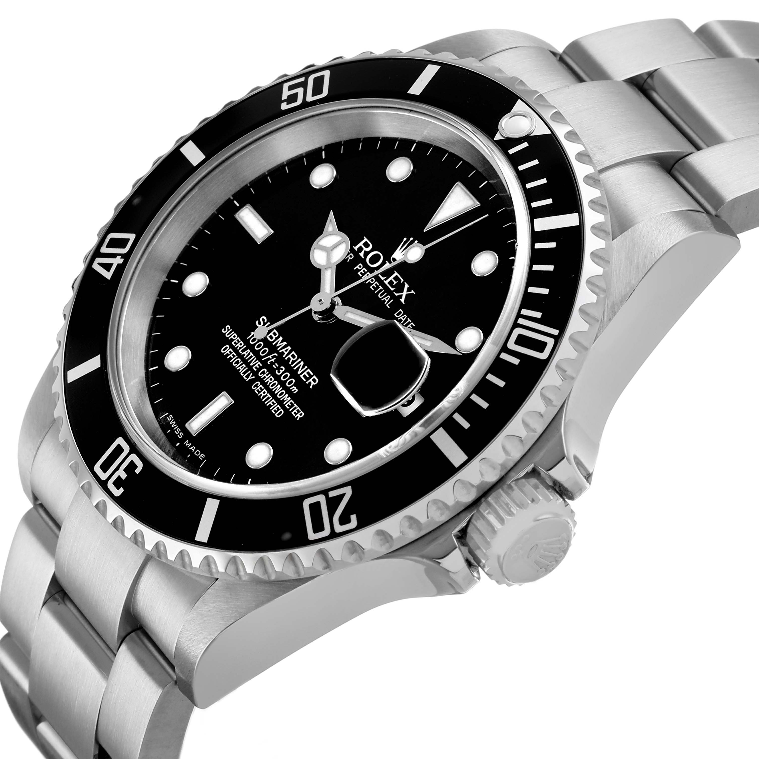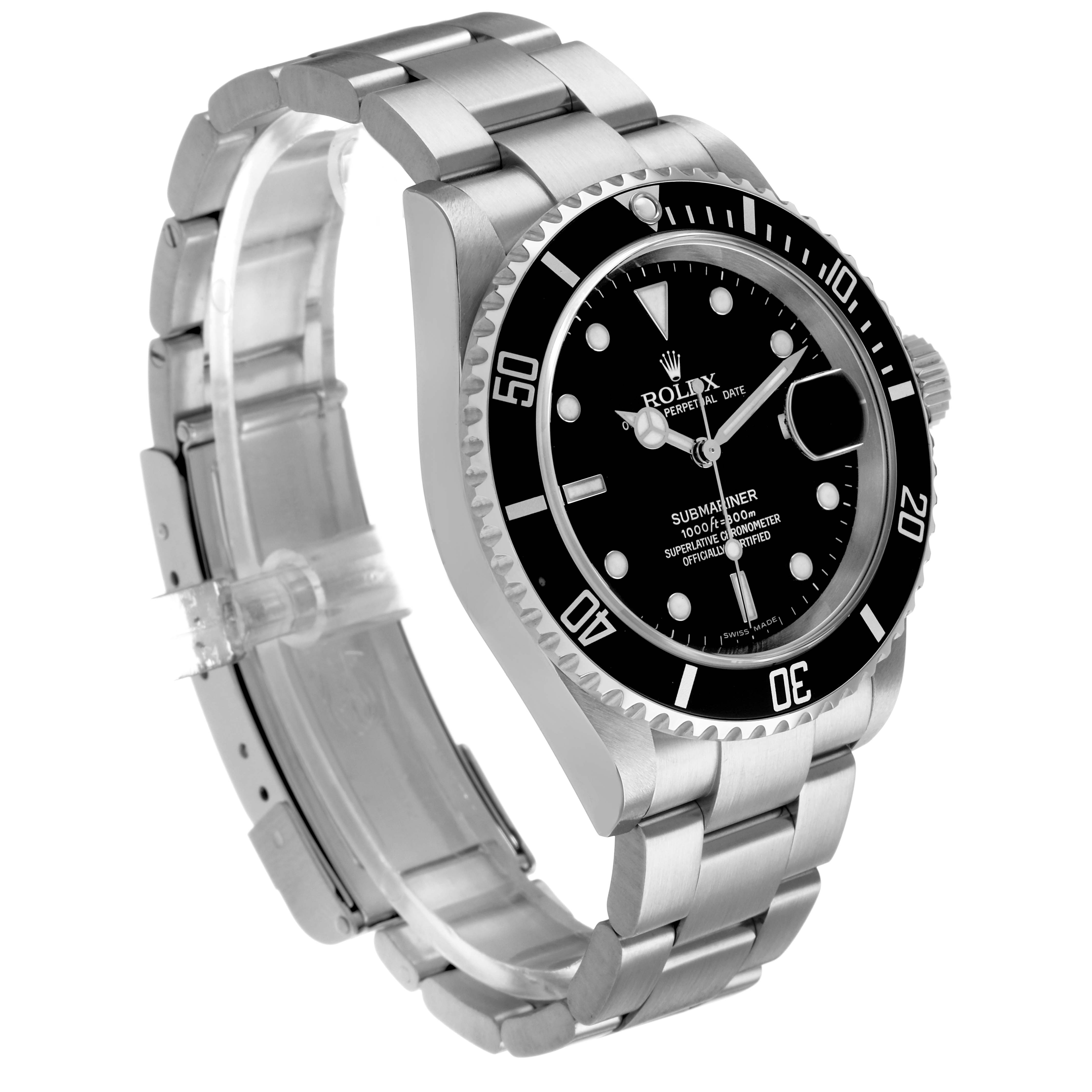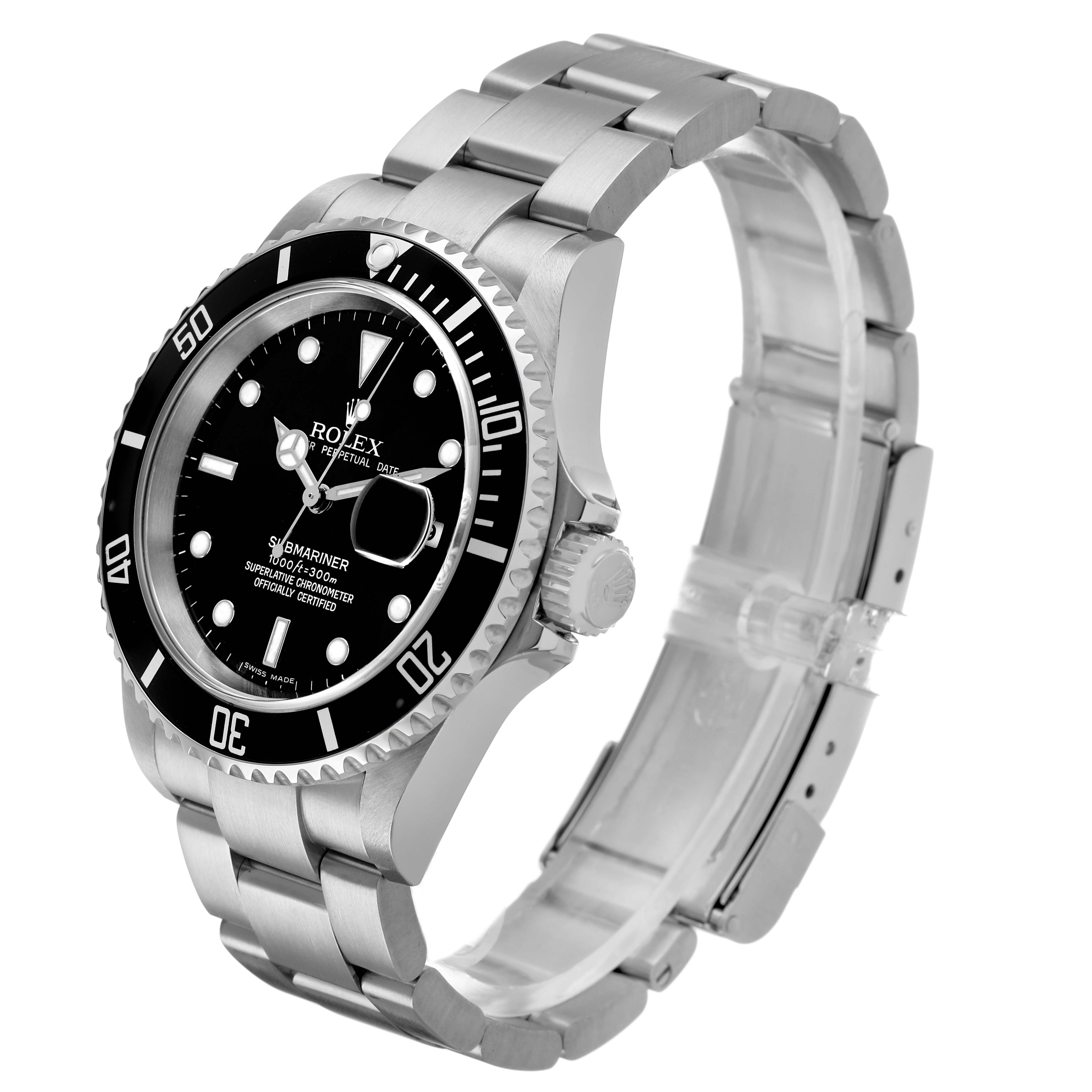 Rolex Submariner Date Steel Black Dial Mens Watch 16610. Officially certified chronometer automatic self-winding movement. Stainless steel oyster case 40.0 mm in diameter. Pointed crown guards. Rolex logo on the crown. Black unidirectional rotating time-lapse bezel engraved with 60-minute graduation. Scratch-resistant sapphire crystal with a cyclops magnifier. Black dial with luminescent Mercedes hands and dot hour markers. Date calendar at the 3 o'clock aperture. Outer stick minute markers. Stainless steel oyster bracelet with a flip-lock clasp. Fits a 7 1/2" wrist.