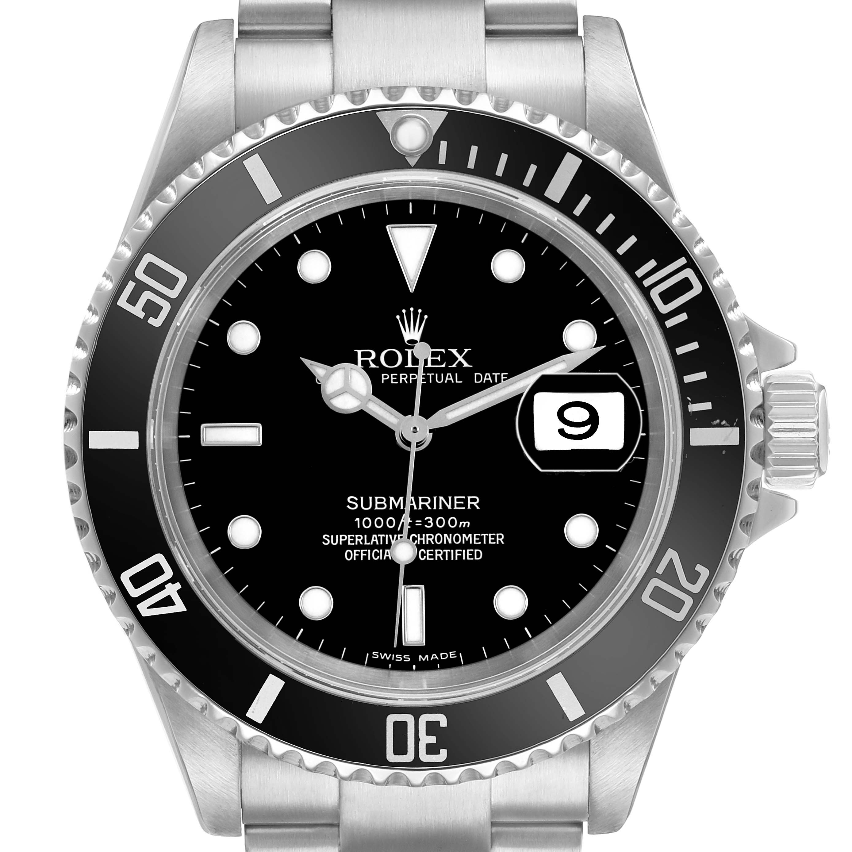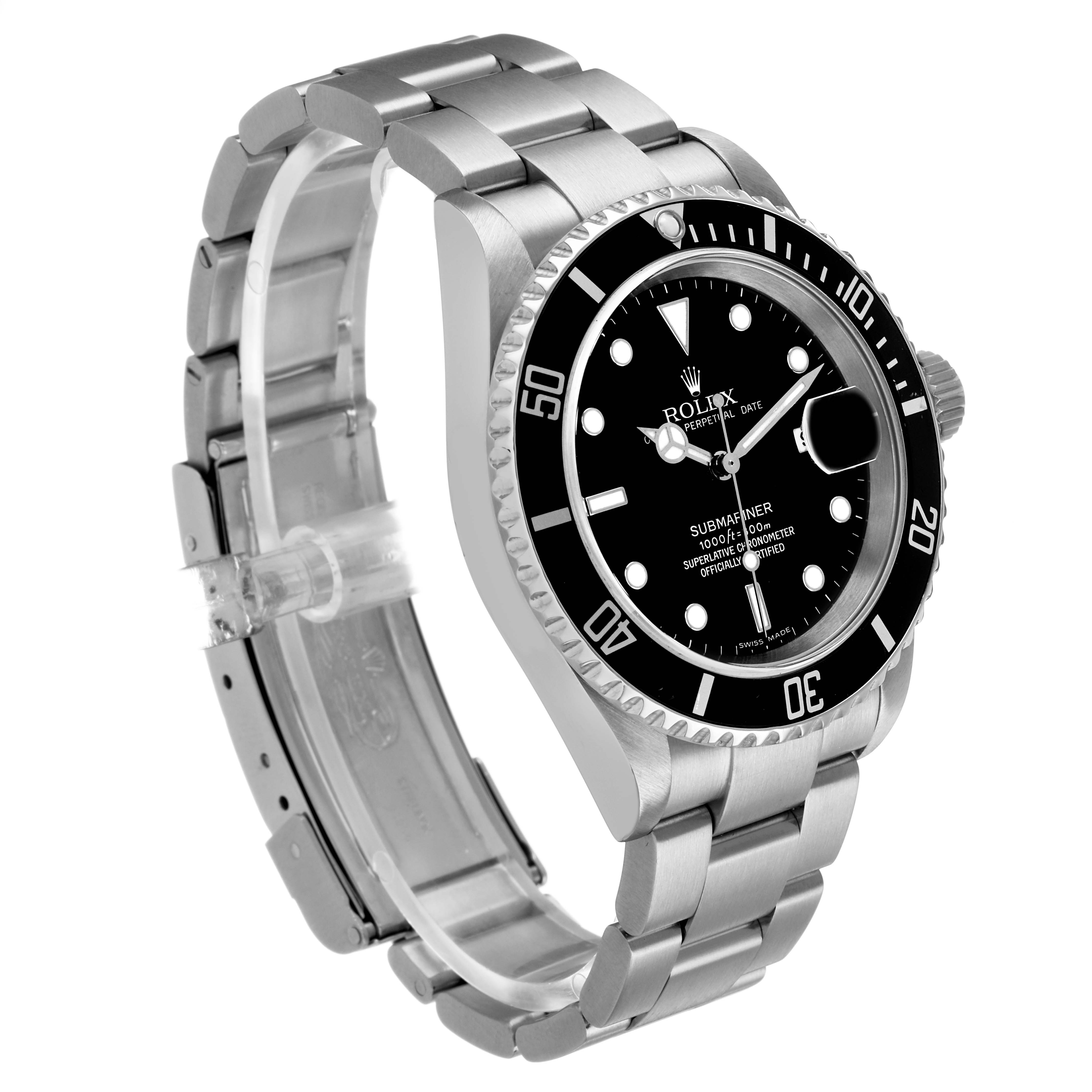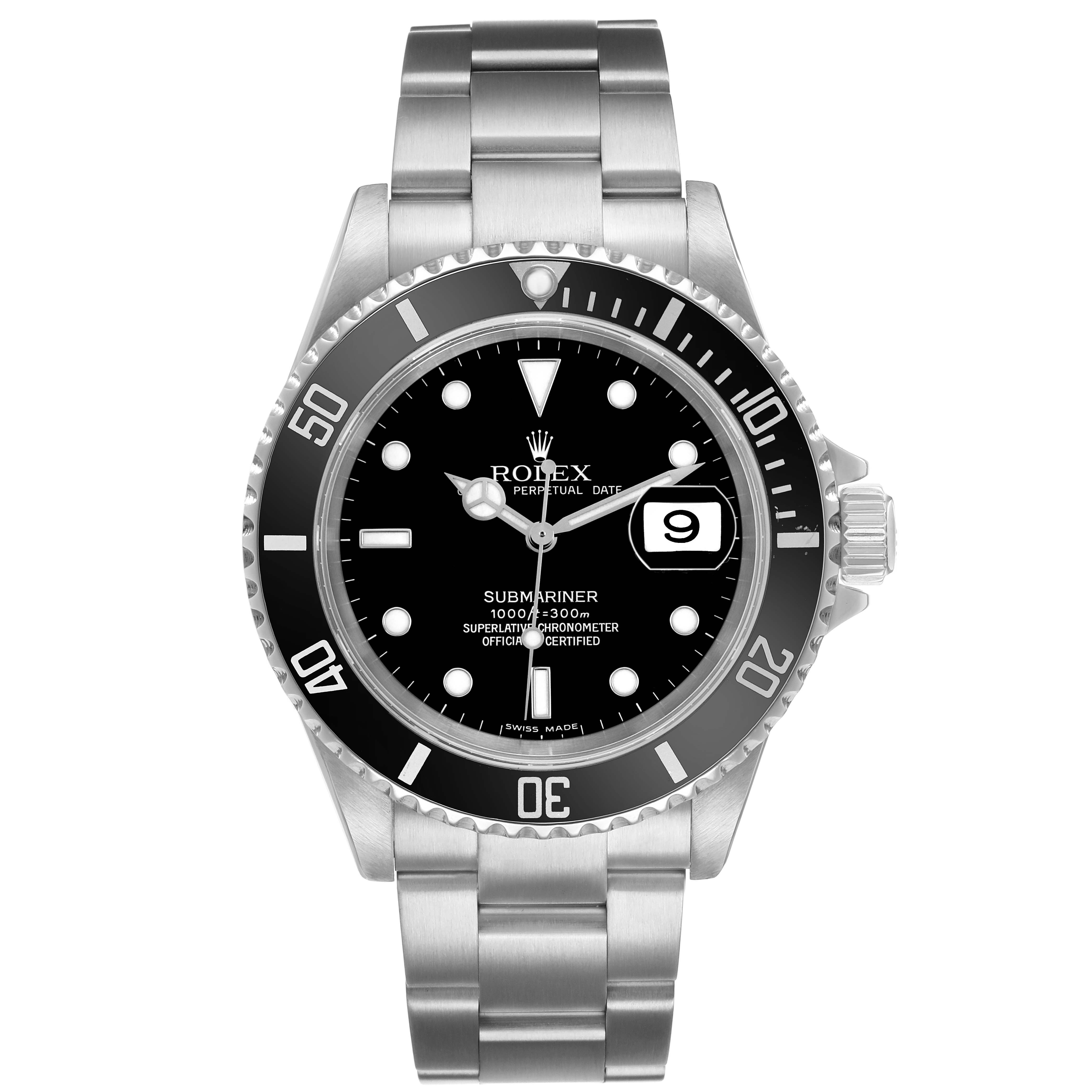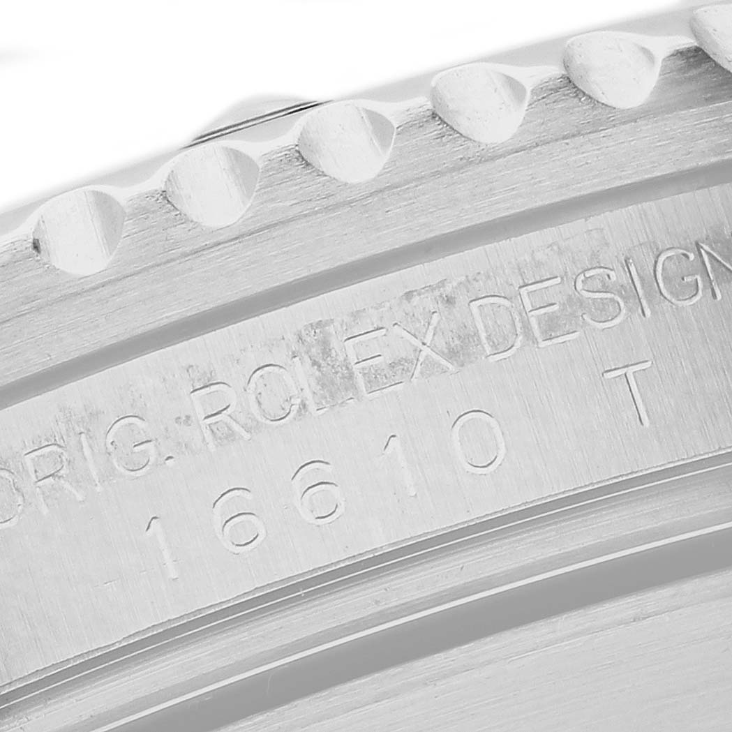Rolex Submariner Date Steel Black Dial Mens Watch 16610. Officially certified chronometer automatic self-winding movement. Stainless steel oyster case 40.0 mm in diameter. Pointed crown guards. Rolex logo on the crown. Black unidirectional rotating time-lapse bezel engraved with 60-minute graduation. Scratch-resistant sapphire crystal with a cyclops magnifier. Black dial with luminescent Mercedes hands and dot hour markers. Date calendar at the 3 o'clock aperture. Outer stick minute markers. Stainless steel oyster bracelet with a flip-lock clasp. Fits a 7.5" wrist.