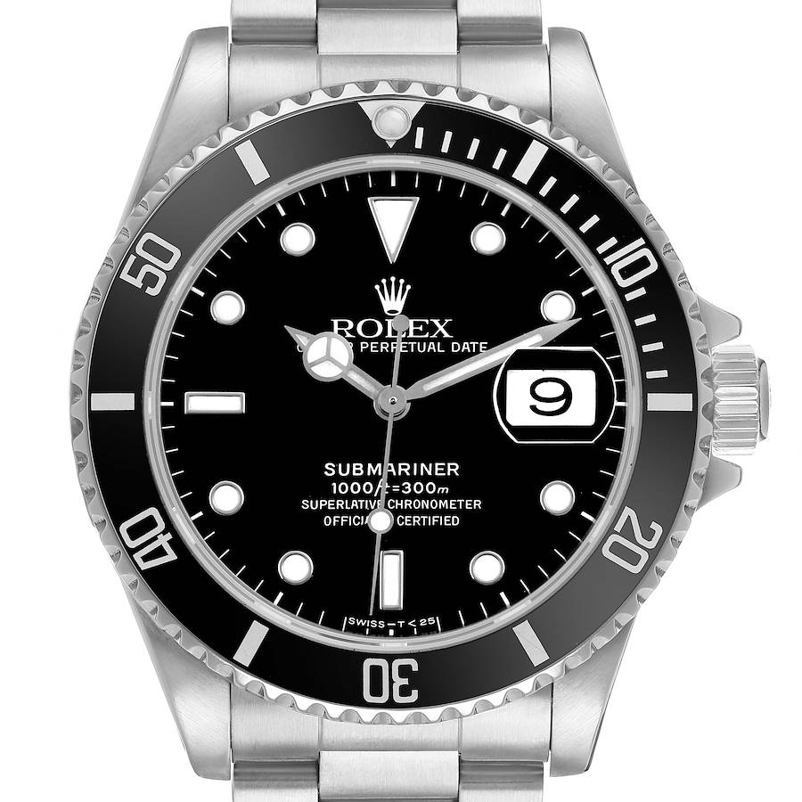 Rolex Submariner Date Steel Black Dial Mens Watch 16610. Officially certified chronometer automatic self-winding movement. Stainless steel oyster case 40.0 mm in diameter. Rolex logo on the crown. Special time-lapse unidirectional rotating bezel. Scratch resistant sapphire crystal with a cyclops magnifier. Black dial with luminescent Mercedes hands and round hour markers. Date calendar at the 3 o'clock aperture. Stainless steel oyster bracelet with a flip-lock clasp. Fits an 7 1/2" wrist.