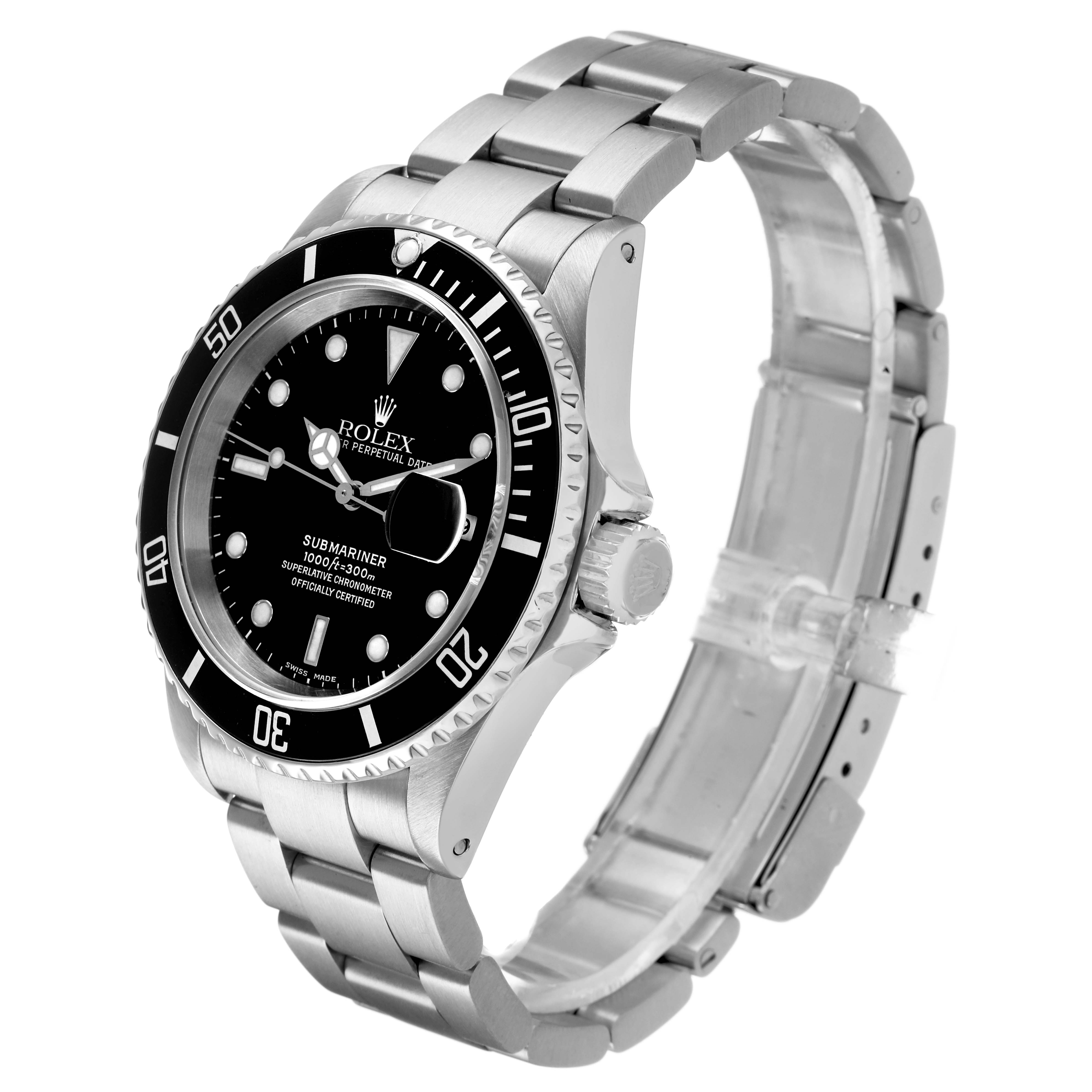 Rolex Submariner Date Steel Ceramic Bezel Black Dial Mens Watch 116610. Officially certified chronometer automatic self-winding movement. Stainless steel oyster case 40.0 mm in diameter. Pointed crown guards. Rolex logo on the crown. Black Cerachrom ceramic unidirectional rotating time-lapse bezel engraved with 60-minute graduation. Scratch resistant sapphire crystal with a cyclops magnifier. Black dial with luminescent Mercedes hands and dot hour markers. Luminescent central lollipop-tipped seconds hand. Date calendar at the 3 o'clock aperture. Outer stick minute markers. Stainless steel oyster bracelet with a flip-lock clasp. Fits a 7 1/2" wrist.