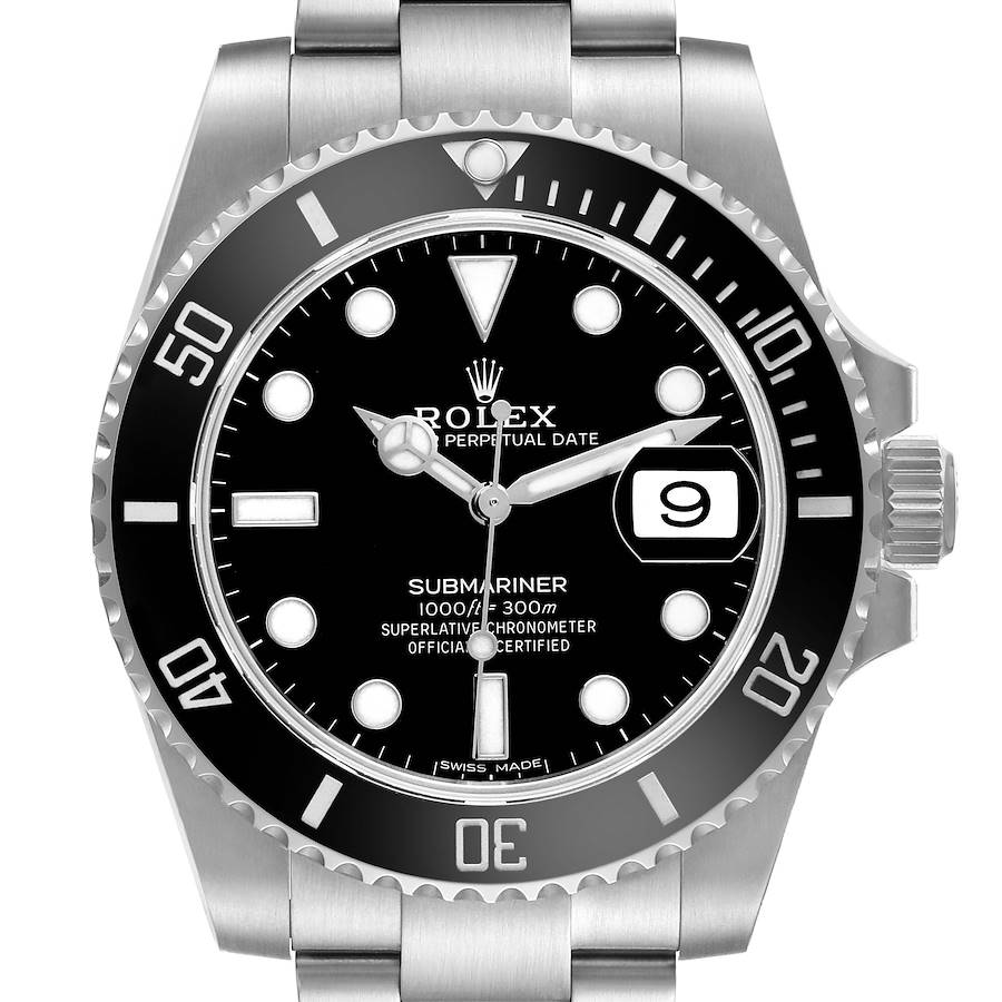 Rolex Submariner Date Steel Ceramic Bezel Black Dial Mens Watch 116610 Box Card. Officially certified chronometer automatic self-winding movement. Stainless steel oyster case 40.0 mm in diameter. Pointed crown guards. Rolex logo on the crown. Black Cerachrom ceramic unidirectional rotating time-lapse bezel engraved with 60-minute graduation. Scratch resistant sapphire crystal with a cyclops magnifier. Black dial with luminescent Mercedes hands and dot hour markers. Luminescent central lollipop-tipped seconds hand. Date calendar at the 3 o'clock aperture. Outer stick minute markers. Stainless steel oyster bracelet with a flip-lock clasp. Fits an 7 3/4" wrist.