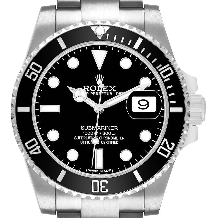 Rolex Submariner Date Steel Ceramic Bezel Black Dial Mens Watch 116610 Card. Officially certified chronometer automatic self-winding movement. Stainless steel oyster case 40.0 mm in diameter. Pointed crown guards. Rolex logo on the crown. Black Cerachrom ceramic unidirectional rotating time-lapse bezel engraved with 60-minute graduation. Scratch resistant sapphire crystal with a cyclops magnifier. Black dial with luminescent Mercedes hands and dot hour markers. Luminescent central lollipop-tipped seconds hand. Date calendar at the 3 o'clock aperture. Outer stick minute markers. Stainless steel oyster bracelet with a flip-lock clasp. Fits an 8" wrist.