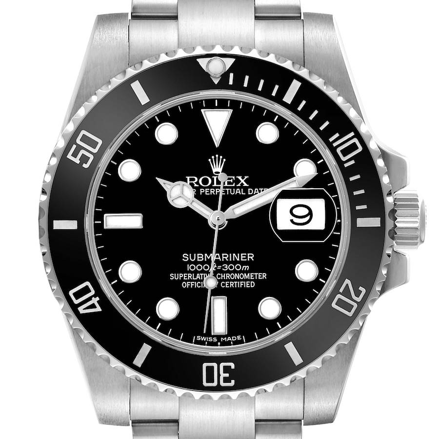 Rolex Submariner Date Steel Ceramic Bezel Black Dial Mens Watch 116610 Card. Officially certified chronometer automatic self-winding movement. Stainless steel oyster case 40.0 mm in diameter. Pointed crown guards. Rolex logo on the crown. Black Cerachrom ceramic unidirectional rotating time-lapse bezel engraved with 60-minute graduation. Scratch resistant sapphire crystal with a cyclops magnifier. Black dial with luminescent Mercedes hands and dot hour markers. Luminescent central lollipop-tipped seconds hand. Date calendar at the 3 o'clock aperture. Outer stick minute markers. Stainless steel oyster bracelet with a flip-lock clasp. Fits an 8" wrist.