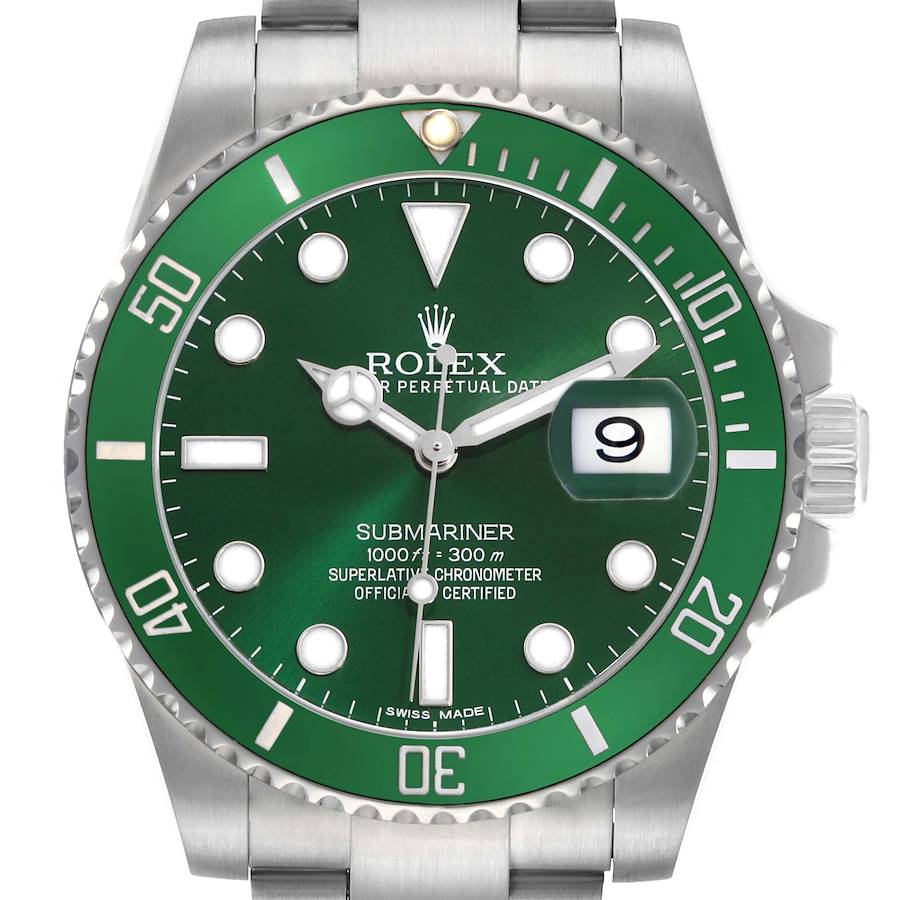 Rolex Submariner Hulk Green Dial Bezel Steel Mens Watch 116610LV. Officially certified chronometer automatic self-winding movement. Stainless steel oyster case 40.0 mm in diameter. Rolex logo on the crown. Special time-lapse unidirectional rotating green ceramic bezel. Scratch resistant sapphire crystal with a cyclops magnifier. Green dial with white luminescent Mercedes hands and maxi hour markers. Date calendar at the 3 o'clock aperture. Stainless steel oyster bracelet with a flip-lock clasp. Fits an 8 1/4" wrist.