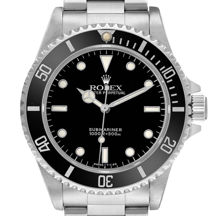 Rolex Submariner No Date 2 Liner Steel Automatic Mens Watch 14060. Officially certified chronometer automatic self-winding movement. Stainless steel oyster case 40.0 mm in diameter. Rolex logo on the crown. Pointed crown guards. Special time-lapse unidirectional rotating black bezel. Scratch resistant sapphire crystal. Black dial with luminescent Mercedes hands and dot hour markers. Luminescent lollipop-tipped centre seconds hand. Outer stick minute markers. Stainless steel oyster bracelet with a flip-lock clasp. Fits a 7.5" wrist.