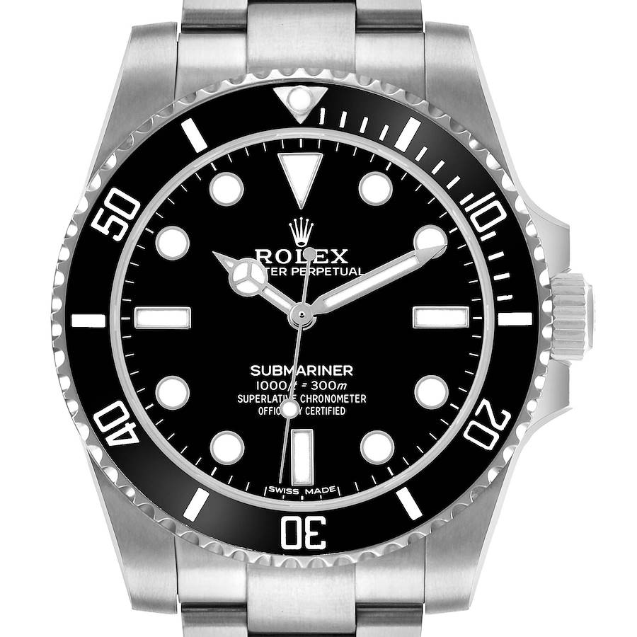 Rolex Submariner No Date Steel Ceramic Bezel Mens Watch 114060 Card. Officially certified chronometer automatic self-winding movement. Stainless steel oyster case 40.0 mm in diameter. Rolex logo on the crown. Stainless steel unidirectional rotating time-lapse bezel with Cerachrom ceramic insert. Scratch resistant sapphire crystal. Black dial with white luminescent inlay Mercedes hands and dot, baton, and dagger hour markers. Stainless steel oyster bracelet with a flip-lock clasp. Fits an 8" wrist.