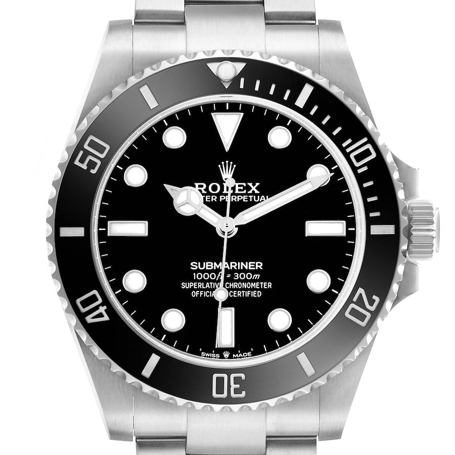 Rolex Submariner No Date Steel Ceramic Bezel Mens Watch 124060 Box Card. Officially certified chronometer automatic self-winding movement. Stainless steel case 41.0 mm in diameter. Rolex logo on the crown. Special time-lapse unidirectional rotating Cerachrom ceramic bezel. Scratch resistant sapphire crystal. Black dial with white luminescent inlay hands and hour markers. Stainless steel oyster bracelet with a flip-lock clasp. Fits a 8 1/4" wrist.