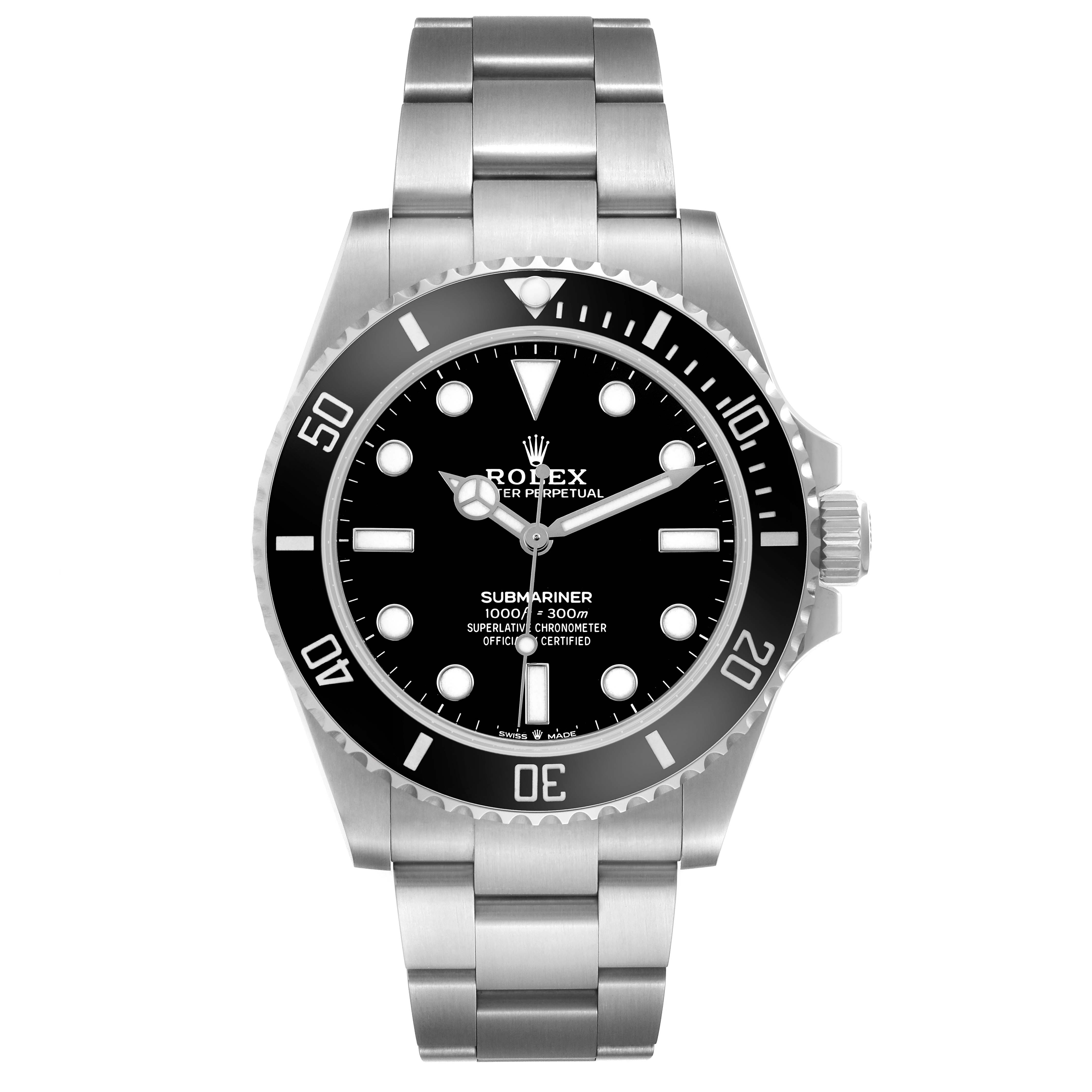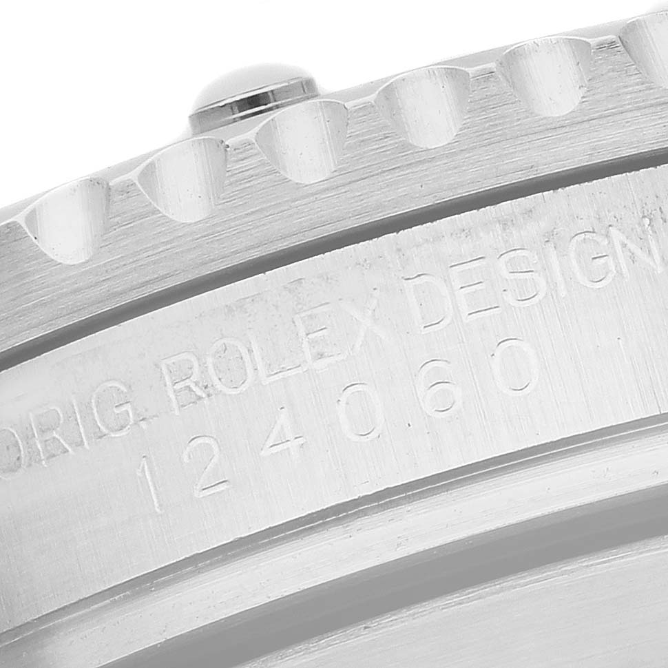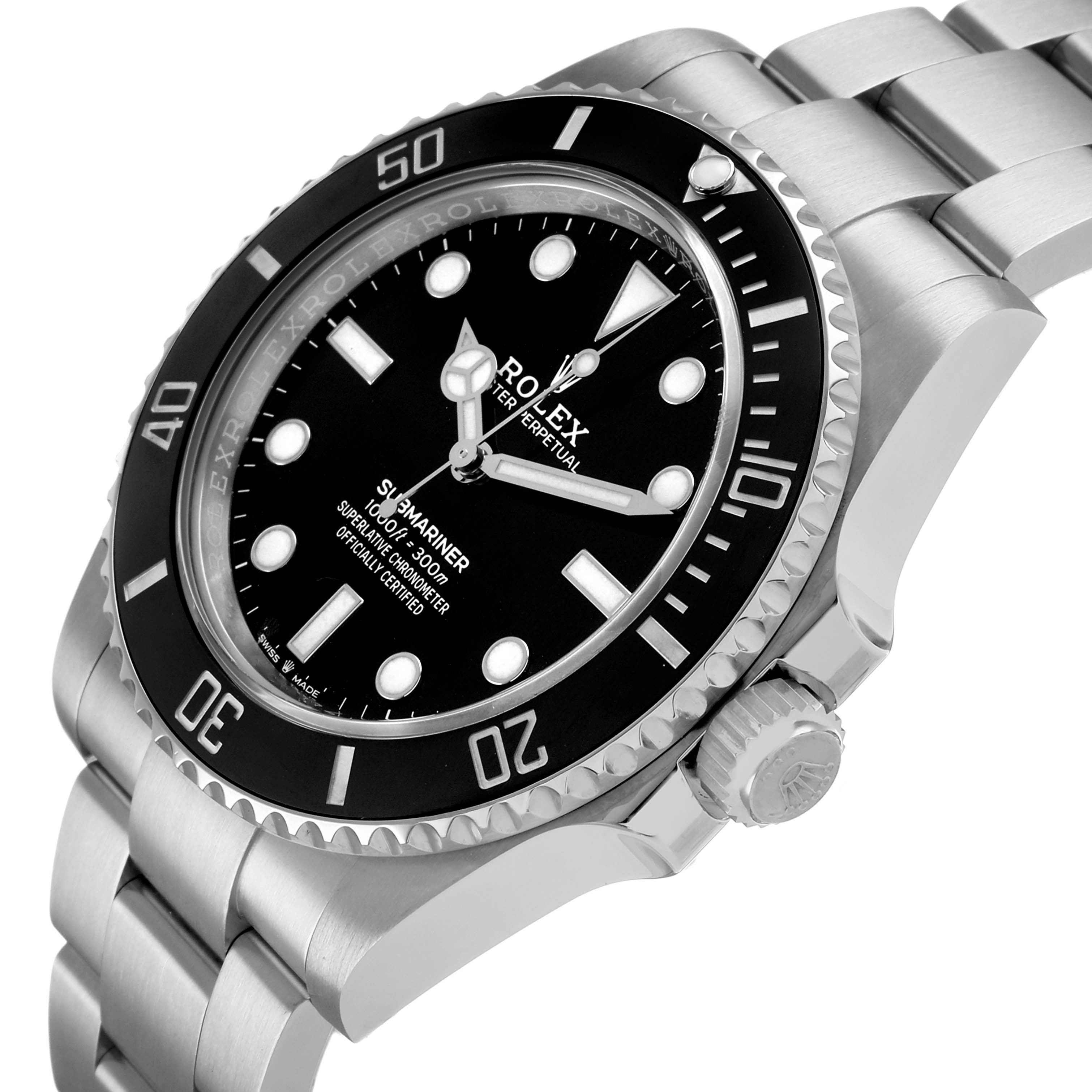 Rolex Submariner No Date Steel Ceramic Bezel Mens Watch 124060 Card. Officially certified chronometer automatic self-winding movement. Stainless steel case 41.0 mm in diameter. Rolex logo on the crown. Special time-lapse unidirectional rotating Cerachrom ceramic bezel. Scratch resistant sapphire crystal. Black dial with white luminescent inlay hands and hour markers. Stainless steel oyster bracelet with a flip-lock clasp. Fits an 8 1/4" wrist.