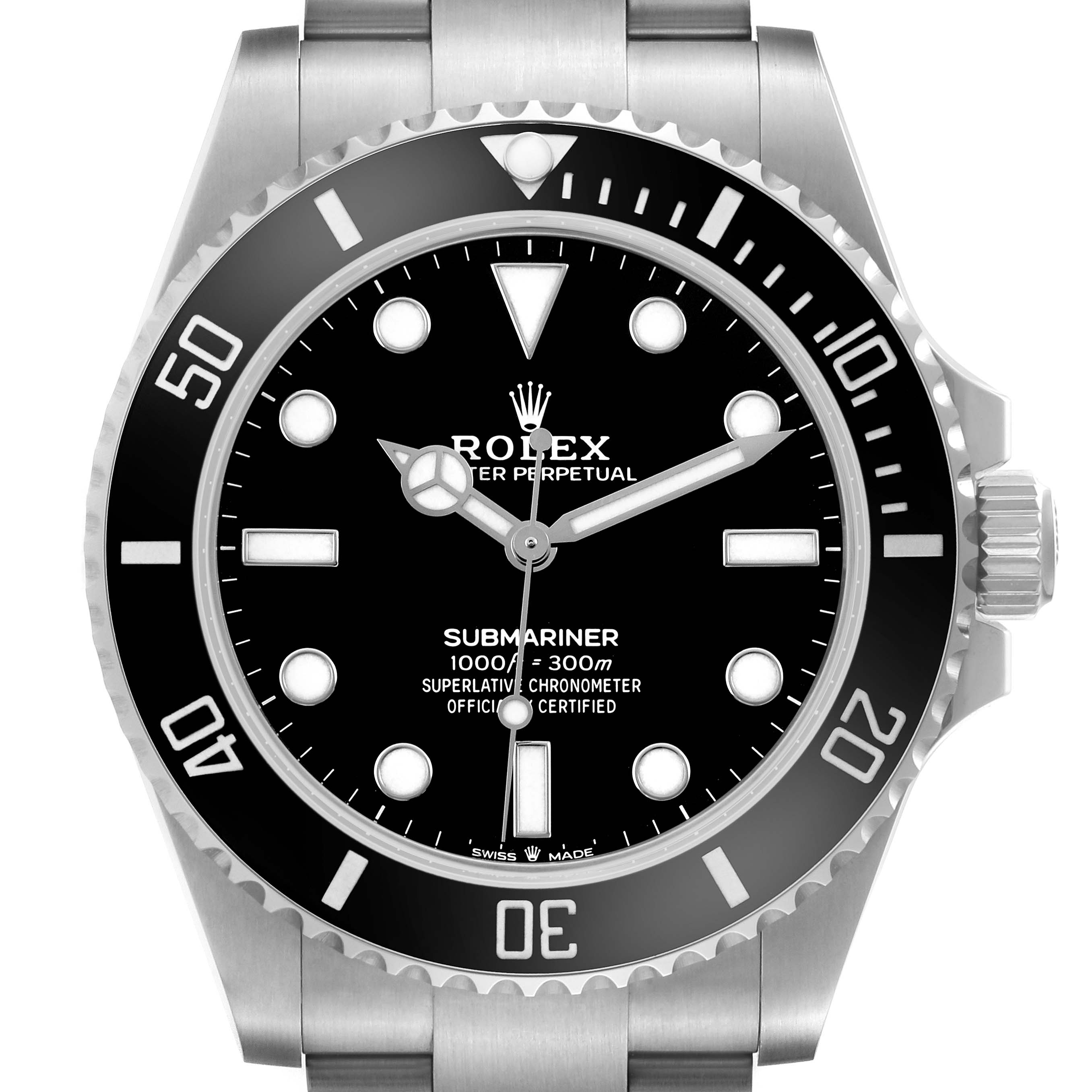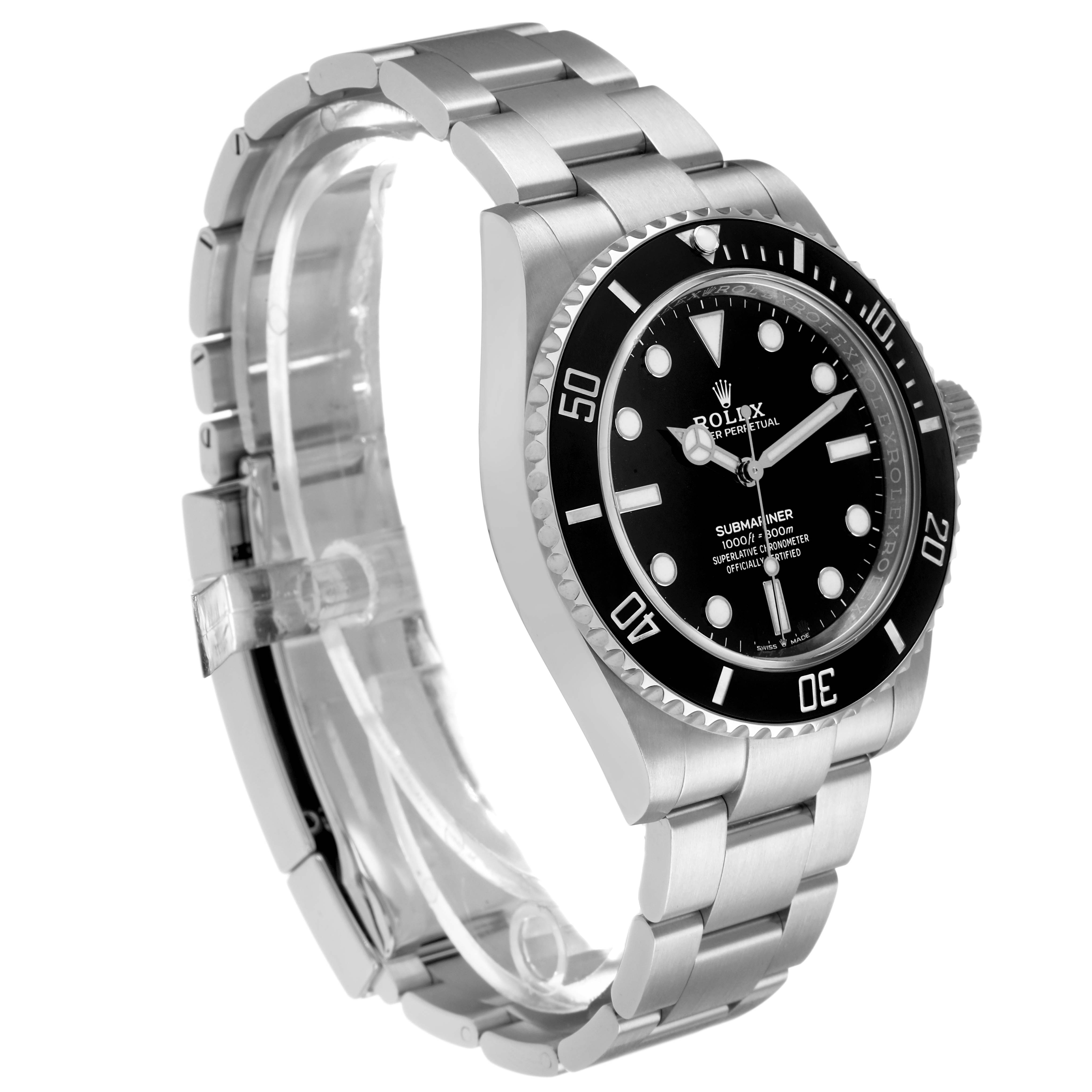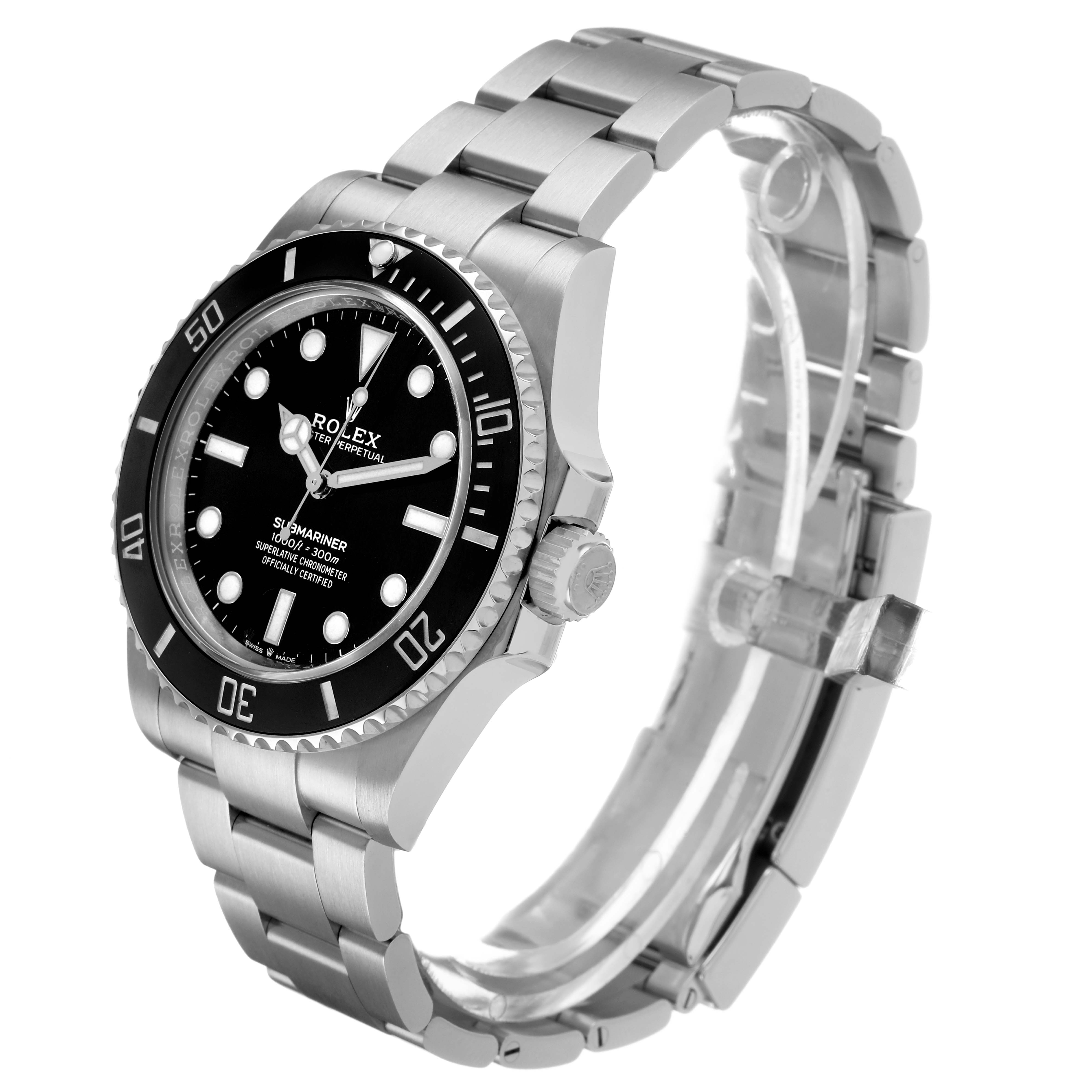 Rolex Submariner No Date Steel Ceramic Bezel Mens Watch 124060 Card. Officially certified chronometer automatic self-winding movement. Stainless steel case 41.0 mm in diameter. Rolex logo on the crown. Special time-lapse unidirectional rotating Cerachrom ceramic bezel. Scratch resistant sapphire crystal. Black dial with white luminescent inlay hands and hour markers. Stainless steel oyster bracelet with a flip-lock clasp. Fits an 8 1/4" wrist.