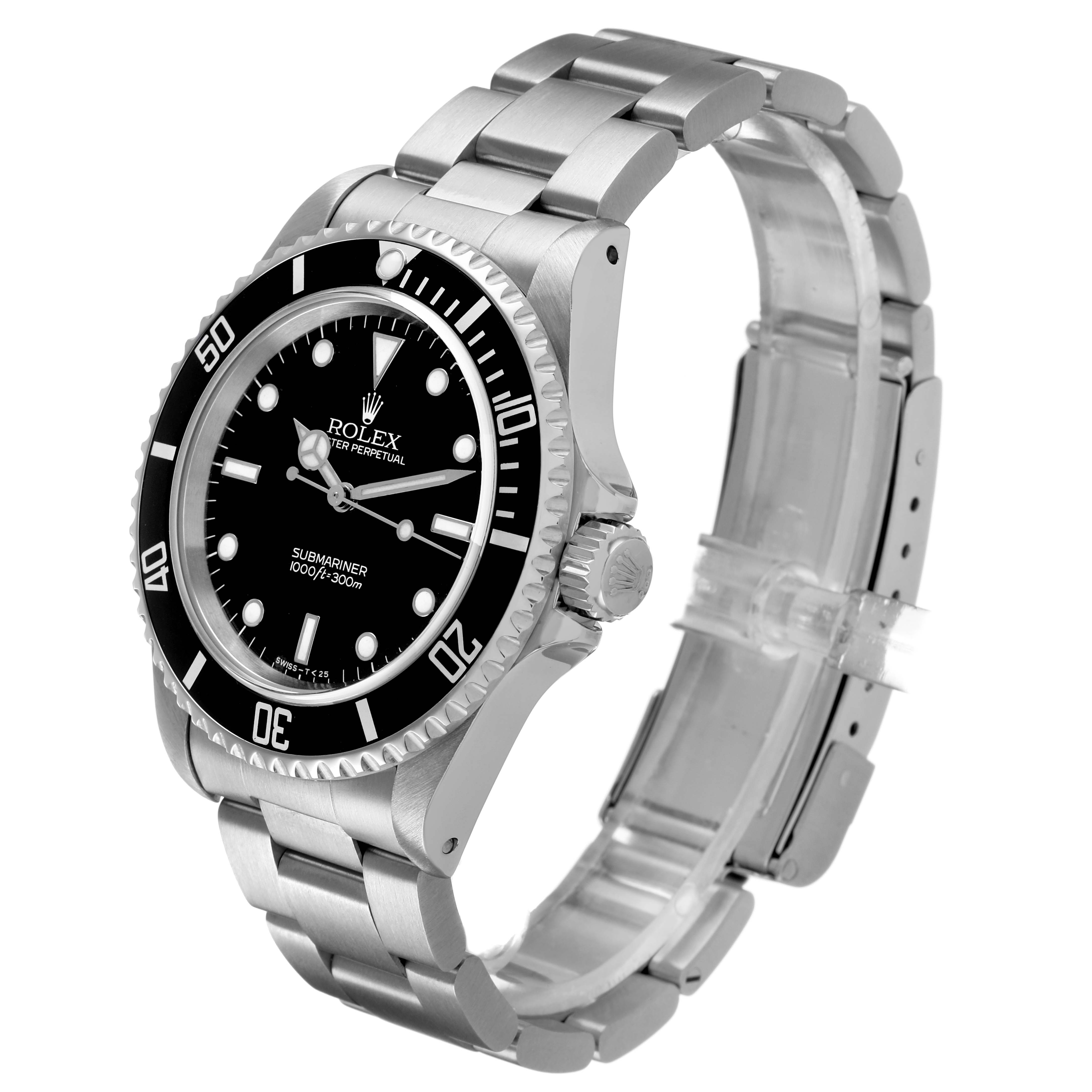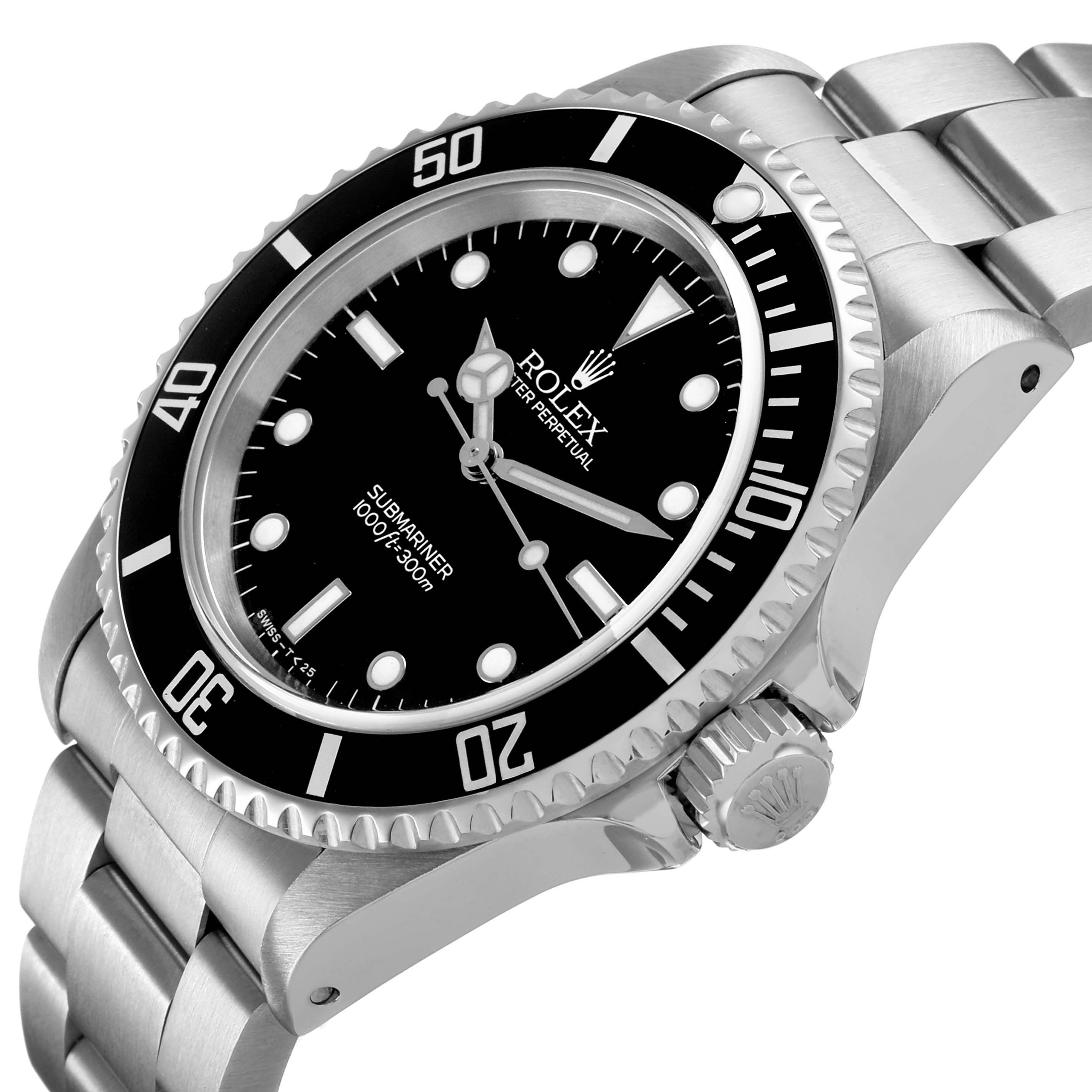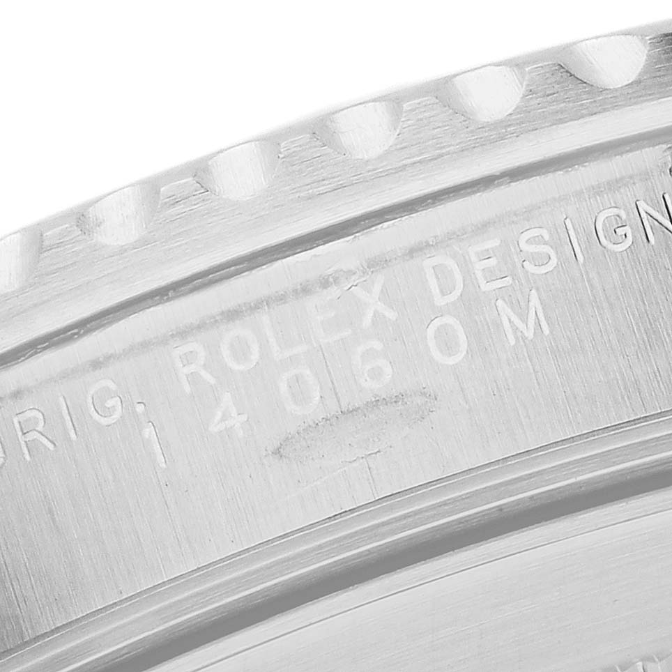 Rolex Submariner No Date Steel Ceramic Bezel Mens Watch 14060. Officially certified chronometer automatic self-winding movement. Stainless steel oyster case 40.0 mm in diameter. Rolex logo on the crown. Stainless steel unidirectional rotating time-lapse bezel with Cerachrom ceramic insert. Scratch resistant sapphire crystal. Black dial with white luminescent inlay Mercedes hands and dot, baton, and dagger hour markers. Stainless steel oyster bracelet with a flip-lock clasp. Fits a 7 1/2" wrist.