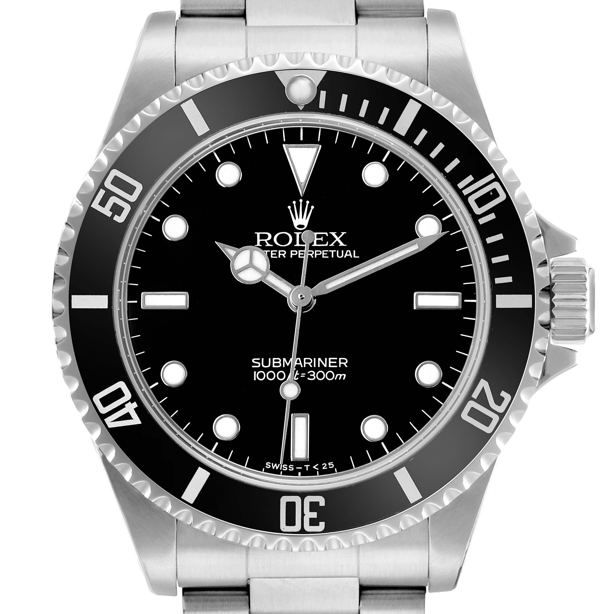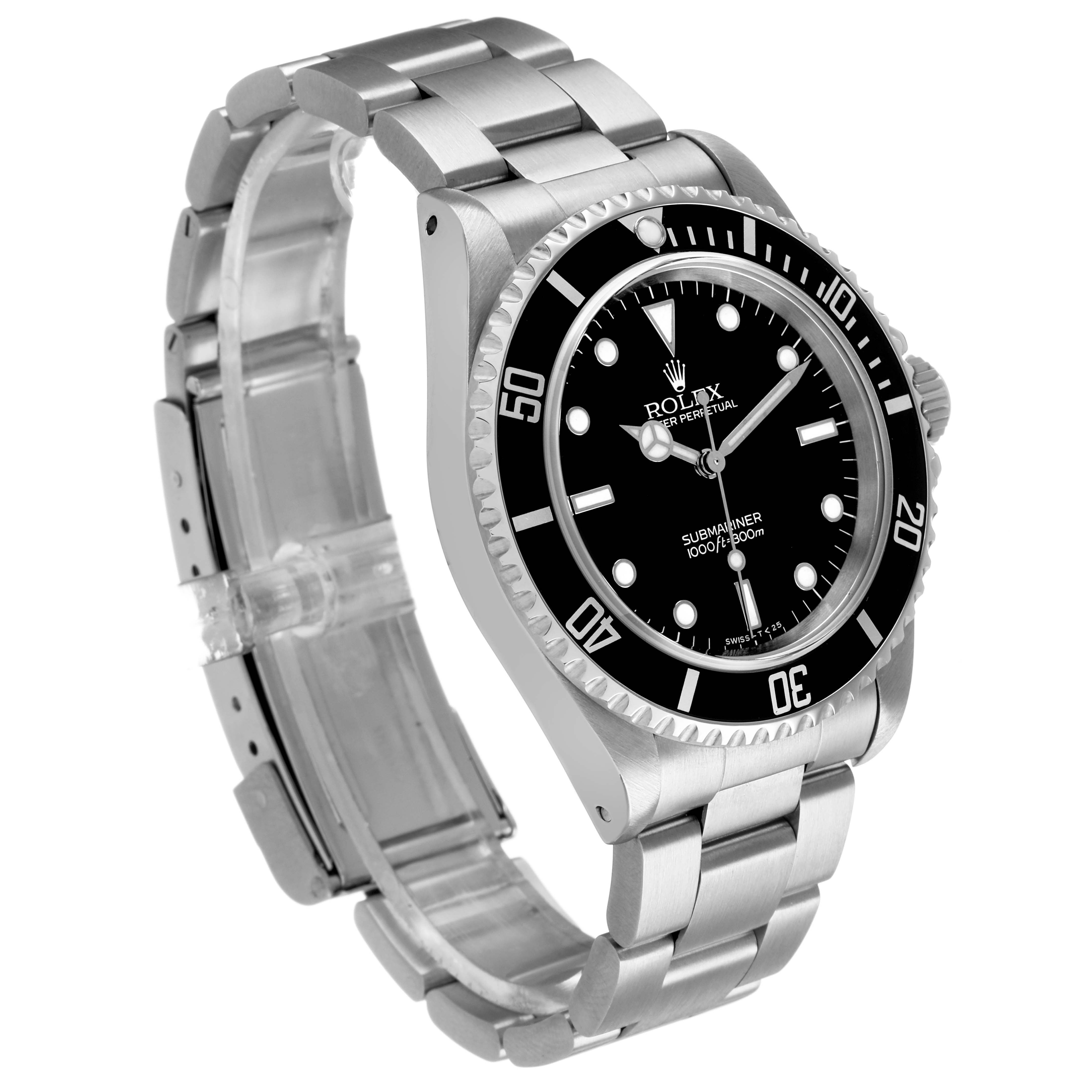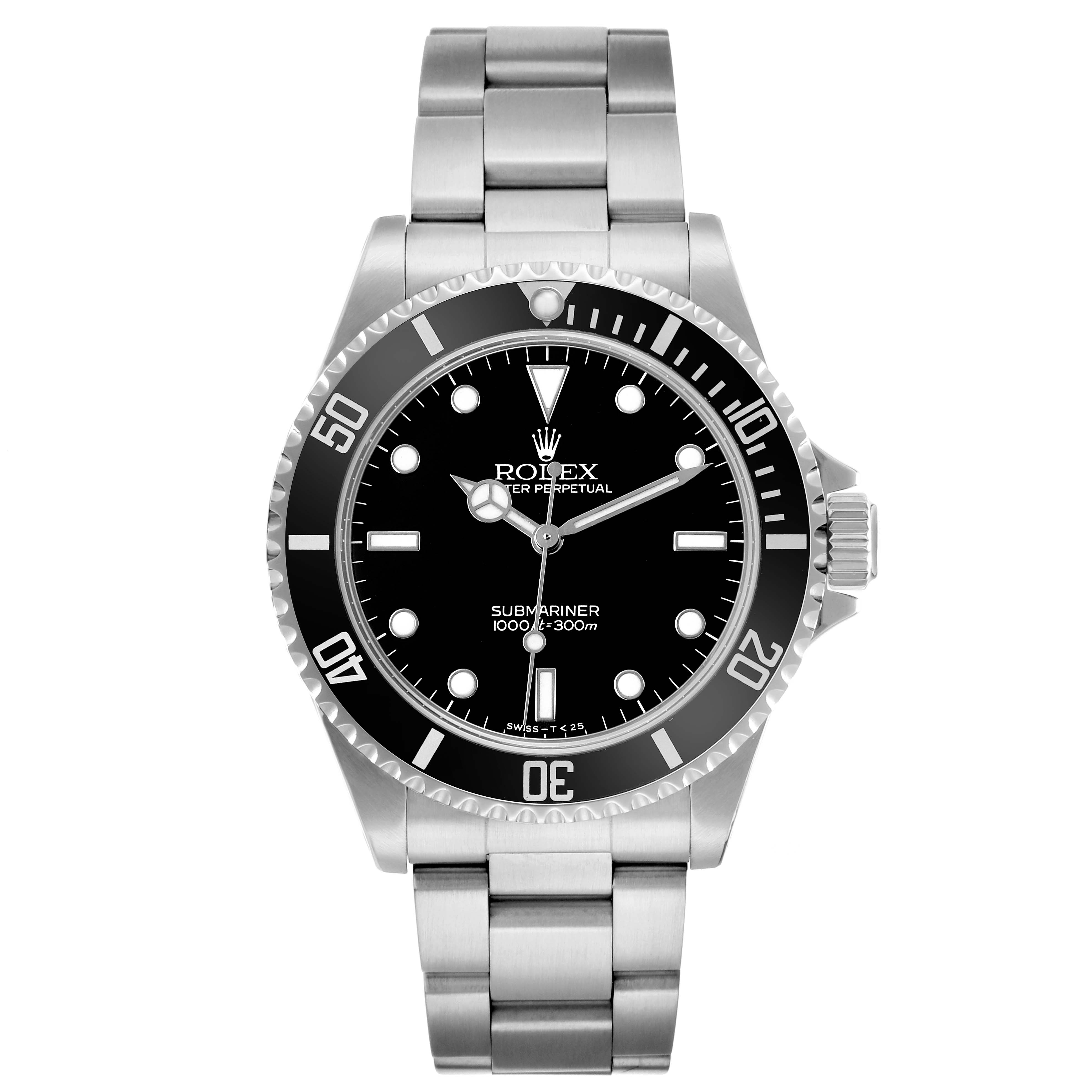 Rolex Submariner No Date Steel Ceramic Bezel Mens Watch 14060. Officially certified chronometer automatic self-winding movement. Stainless steel oyster case 40.0 mm in diameter. Rolex logo on the crown. Stainless steel unidirectional rotating time-lapse bezel with Cerachrom ceramic insert. Scratch resistant sapphire crystal. Black dial with white luminescent inlay Mercedes hands and dot, baton, and dagger hour markers. Stainless steel oyster bracelet with a flip-lock clasp. Fits a 7 1/2" wrist.