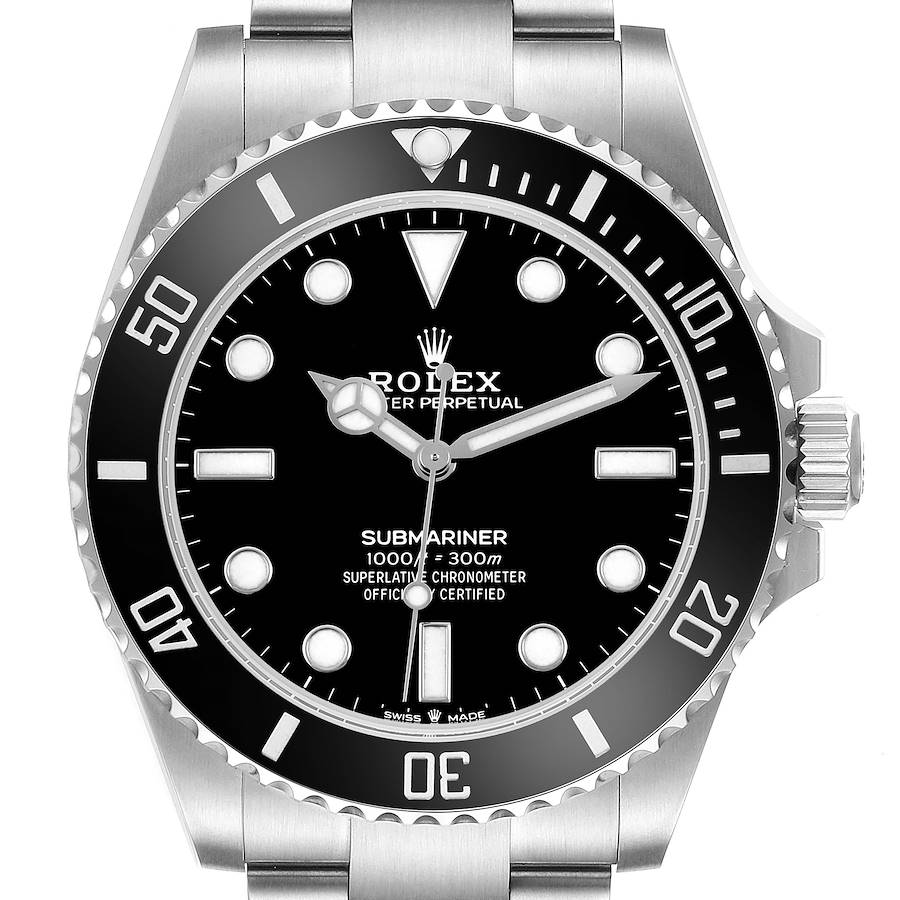 Rolex Submariner Non-Date Ceramic Bezel Steel Mens Watch 124060. Officially certified chronometer automatic self-winding movement. Stainless steel case 41.0 mm in diameter. Rolex logo on the crown. Special time-lapse unidirectional rotating Cerachrom ceramic bezel. Scratch resistant sapphire crystal. Black dial with white luminescent inlay hands and hour markers. Stainless steel oyster bracelet with a flip-lock clasp. Fits an 7 3/4" wrist.