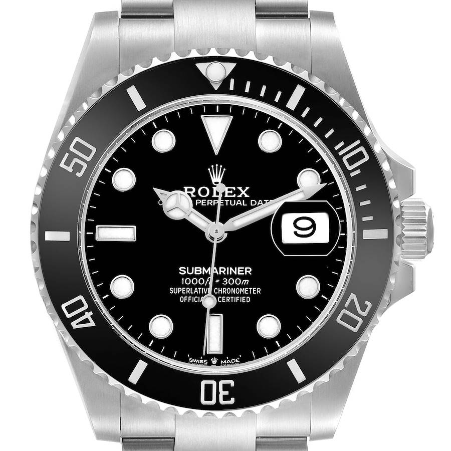 Rolex Submariner Steel Black Ceramic Bezel Mens Watch 126610. Officially certified chronometer automatic self-winding movement. Stainless steel oyster case 41.0 mm in diameter. Rolex logo on the crown. Pointed crown guards. Unidirectional rotating time-lapse black ceramic bezel with 60-minute graduation. Scratch-resistant sapphire crystal with a cyclops magnifier. Black dial with white luminescent inlay Mercedes hands and dot hour markers. Luminescent lollipop-tipped sweeping seconds hand. Date calendar at the 3 o'clock aperture. Outer stick minute markers. Stainless steel oyster bracelet with a flip-lock clasp. Fits a 8" wrist.