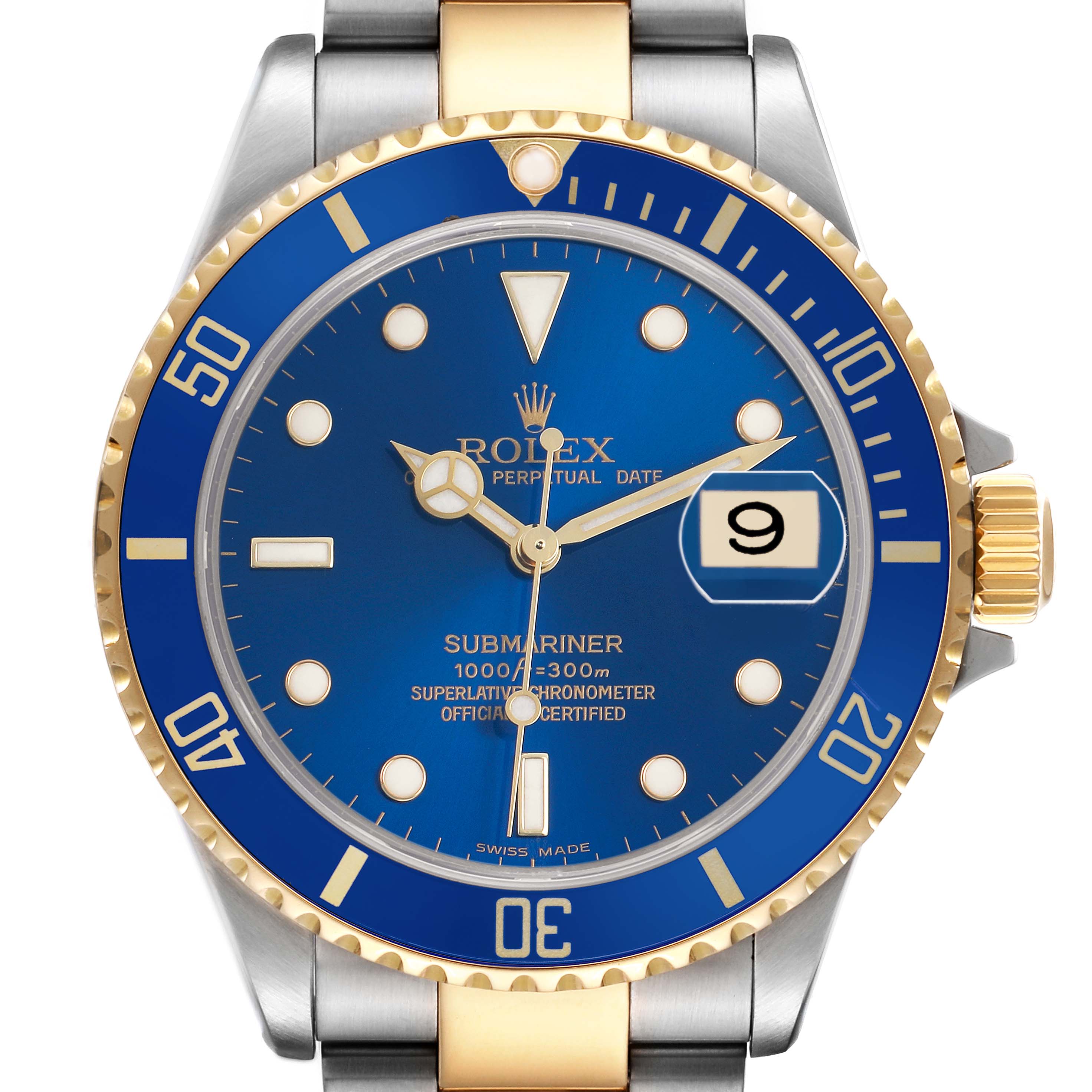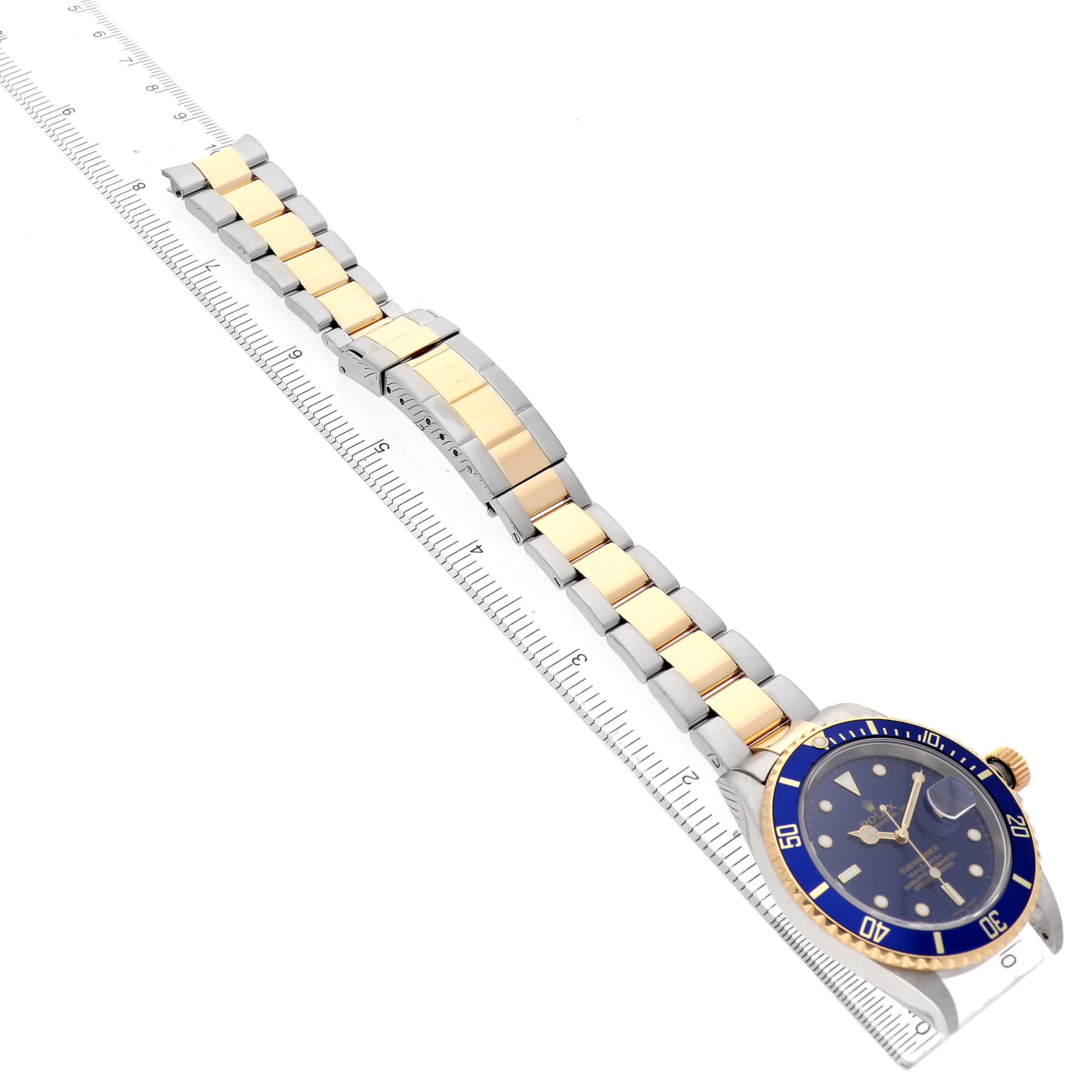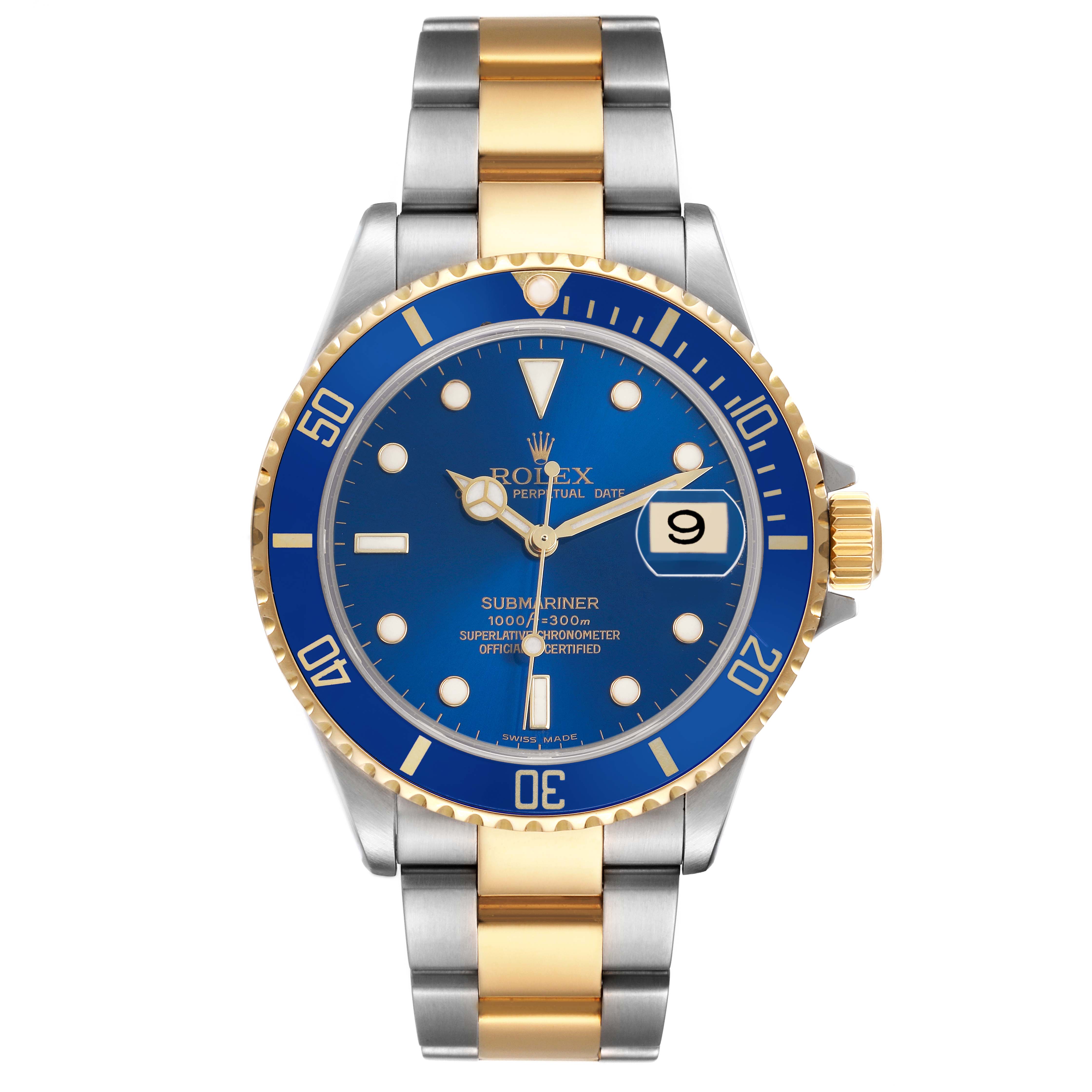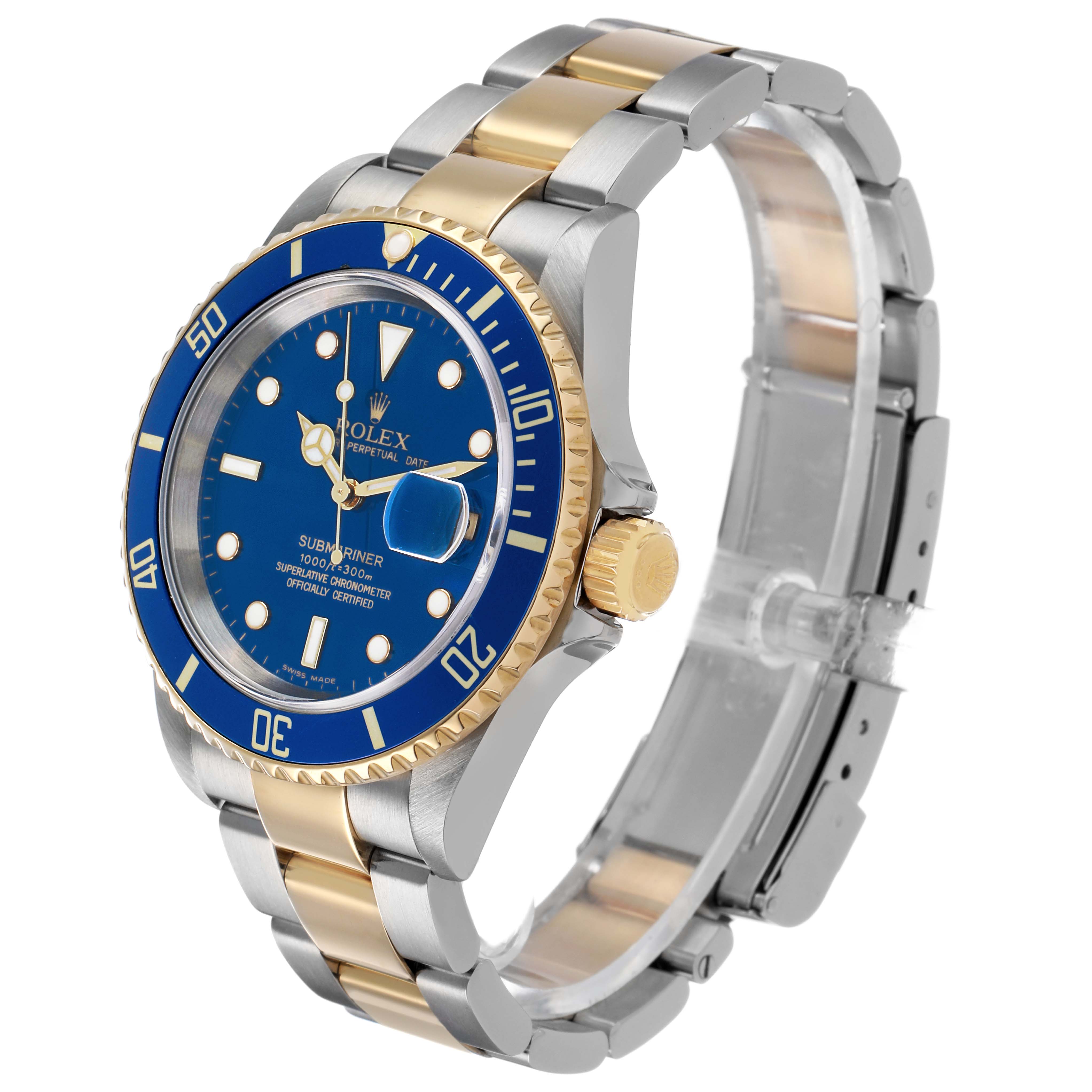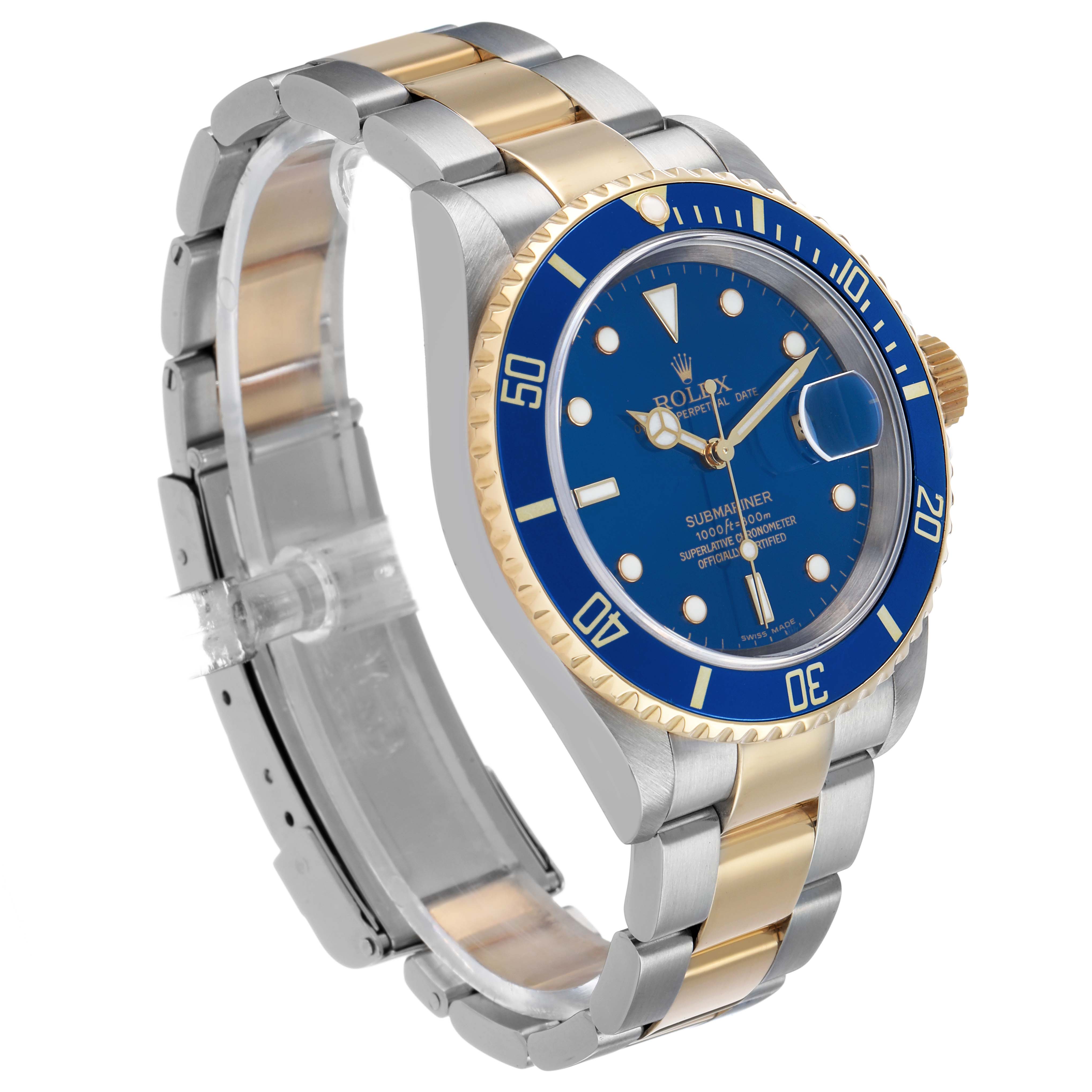 Rolex Submariner Steel Yellow Gold Blue Dial Mens Watch 16613. Officially certified chronometer automatic self-winding movement. Stainless steel and 18k yellow gold oyster case 40.0 mm in diameter. Rolex logo on the 18k yellow gold crown. Pointed crown guards. Special time-lapse unidirectional 18k yellow gold rotating blue insert bezel with a 60 minute graduation coated in gold. Scratch resistant sapphire crystal with a cyclops magnifier. Blue dial with luminescent yellow gold outlined Mercedes hands and dot hour markers. Outer stick minute markers. Date calendar at the 3 o'clock aperture. Stainless steel and 18k yellow gold oyster bracelet with a flip-lock clasp. Fits a 7 1/2" wrist.