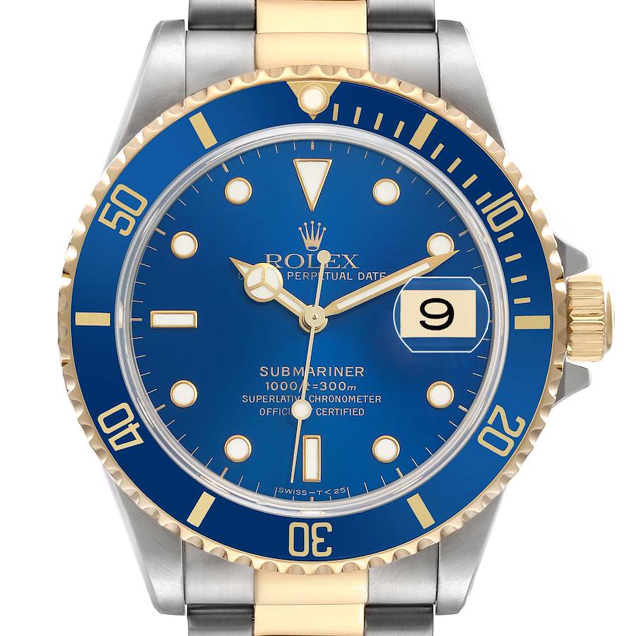 Rolex Submariner Steel Yellow Gold Blue Dial Mens Watch 16613 Box Papers. Officially certified chronometer automatic self-winding movement. Stainless steel and 18k yellow gold oyster case 40.0 mm in diameter. Rolex logo on the 18k yellow gold crown. Pointed crown guards. Special time-lapse unidirectional 18k yellow gold rotating blue insert bezel with a 60 minute graduation coated in gold. Scratch resistant sapphire crystal with a cyclops magnifier. Blue dial with luminescent yellow gold outlined Mercedes hands and dot hour markers. Outer stick minute markers. Date calendar at the 3 o'clock aperture. Stainless steel and 18k yellow gold oyster bracelet with a flip-lock clasp. Fits a 7 3/4" wrist.