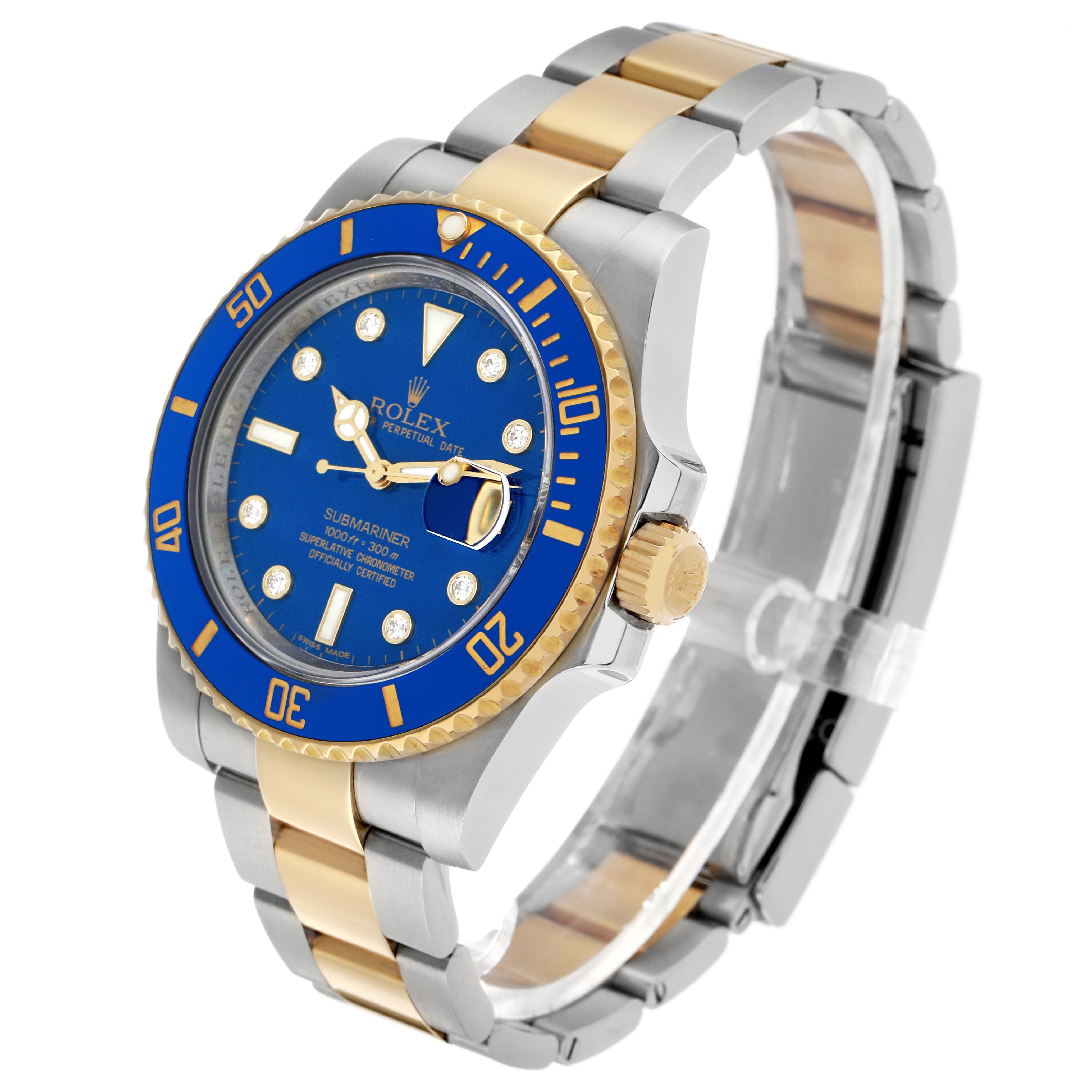 | Model Name: | Rolex Submariner Steel Yellow Gold Blue Diamond Dial Bezel Mens Watch 116613 |