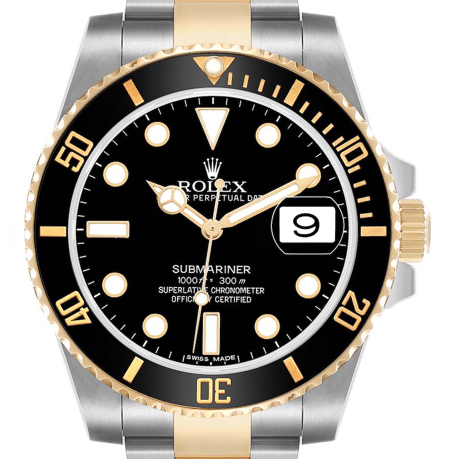 Rolex Submariner Steel Yellow Gold Diamond Mens Watch 116613 Card. Officially certified chronometer automatic self-winding movement. Stainless steel and 18k yellow gold oyster case 40.0 mm in diameter. Rolex logo on the 18k yellow gold crown. Pointed crown guards. Ceramic black ion-plated special time-lapse unidirectional rotating 18k yellow gold bezel. Scratch resistant sapphire crystal with cyclops magnifier. Black dial with yellow gold-outlined Mercedes hands and original Rolex factory diamond dot hour markers. Luminescent lollipop-tipped yellow gold centre seconds hand. Outer stick minute markers. Date calendar at the 3 o'clock aperture. Stainless steel and 18K yellow gold oyster bracelet with a flip-lock clasp. Fits a 7.5" wrist.