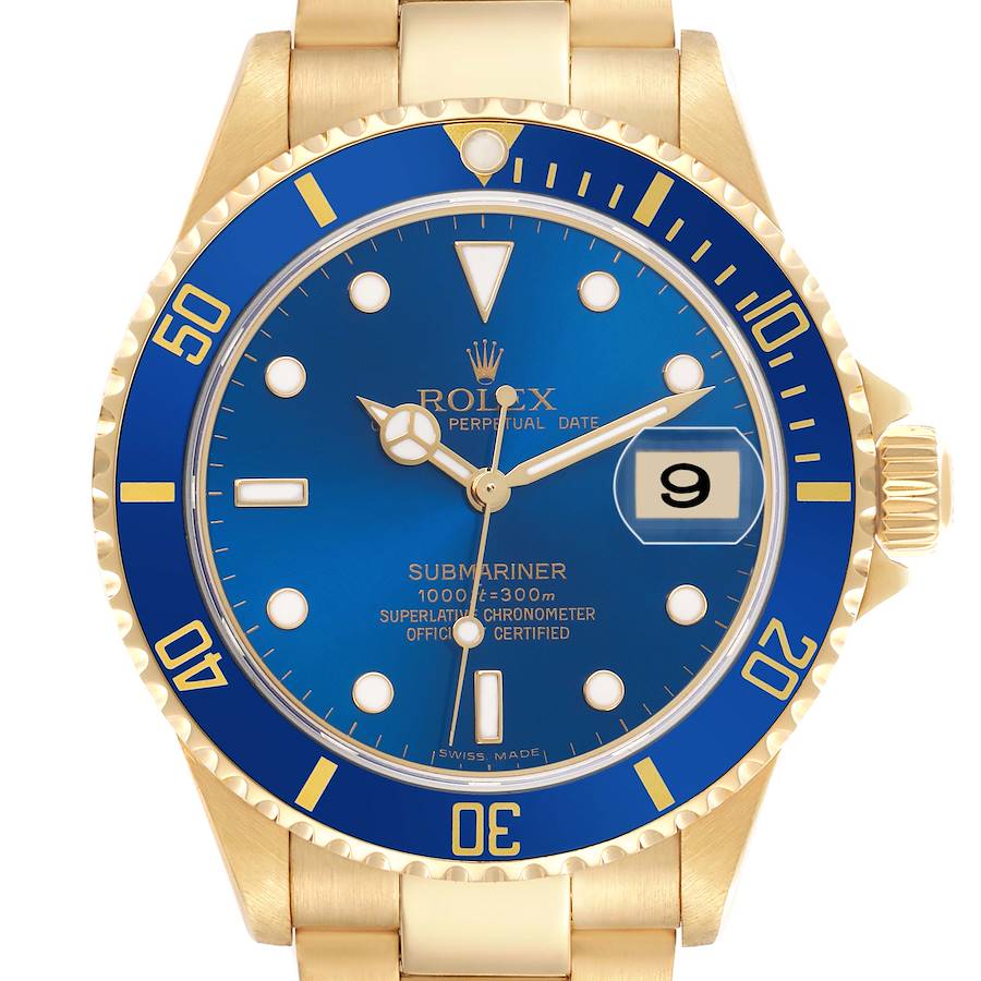 Rolex Submariner Yellow Gold Blue Dial 40mm Automatic Mens Watch 16618. Officially certified chronometer automatic self-winding movement. 18k yellow gold oyster case 40.0 mm in diameter. Pointed crown guards. Rolex logo on the crown. Blue insert special time-lapse unidirectional rotating 18k yellow gold bezel. Scratch resistant sapphire crystal with a cyclops magnifyer. Blue dial with yellow gold-outlined luminescent dot hour markers and Mercedes hands. Date calendar at the 3 o'clock aperture. 18k yellow gold oyster bracelet with a flip-lock clasp. Fits a 7 1/4" wrist.