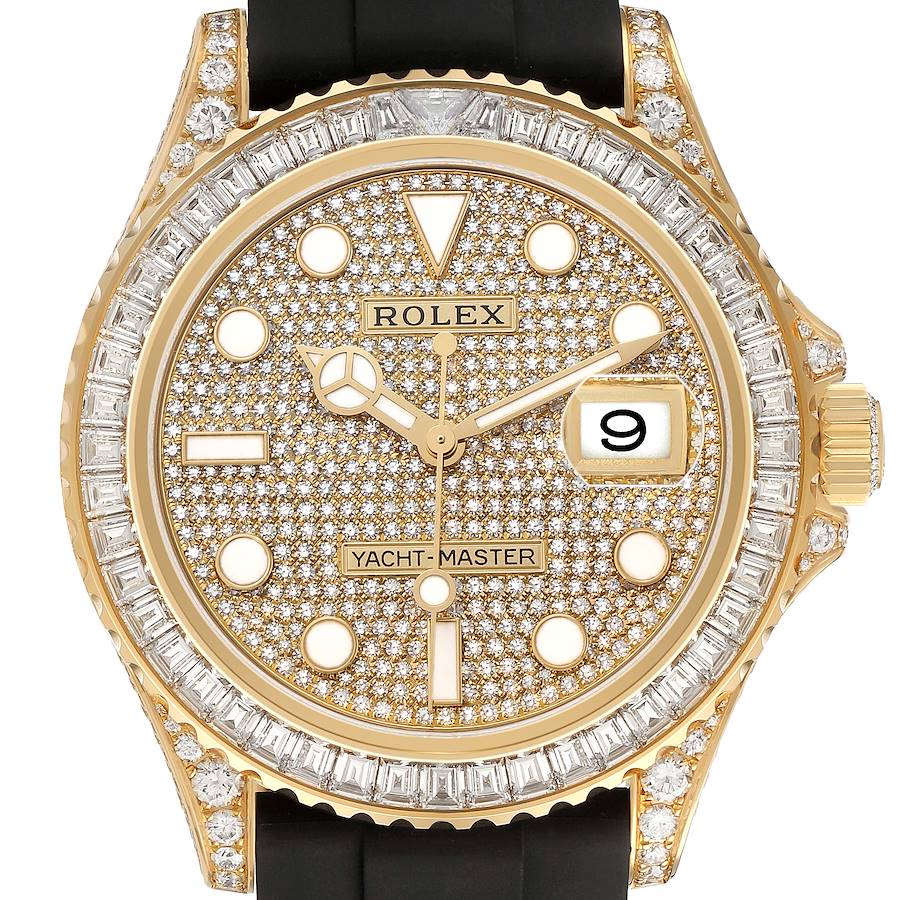 Rolex Yacht-Master 42 Yellow Gold Pave Baguette Diamond Watch 226668 Box Card. Officially certified chronometer automatic self-winding movement. 18K yellow gold case 42.0 mm in diameter. Rolex logo on the 18k yellow gold crown. Original Rolex factory Diamond set lugs and crown guards. 18K yellow gold bidirectional rotating bezel set with baguette-cut original Rolex factory diamonds. Scratch resistant sapphire crystal with cyclops magnifier. Original Rolex factory pave diamond dial with applied luminous yellow gold outlined dot and baton hour markers. Gilt Mercedes hands with luminous inserts and lollipop tipped centre seconds. Date calendar at 3 o'clock aperture. Black Oysterflex rubber bracelet with 18k yellow gold flip-lock deployant clasp set in original Rolex factory pave diamonds.