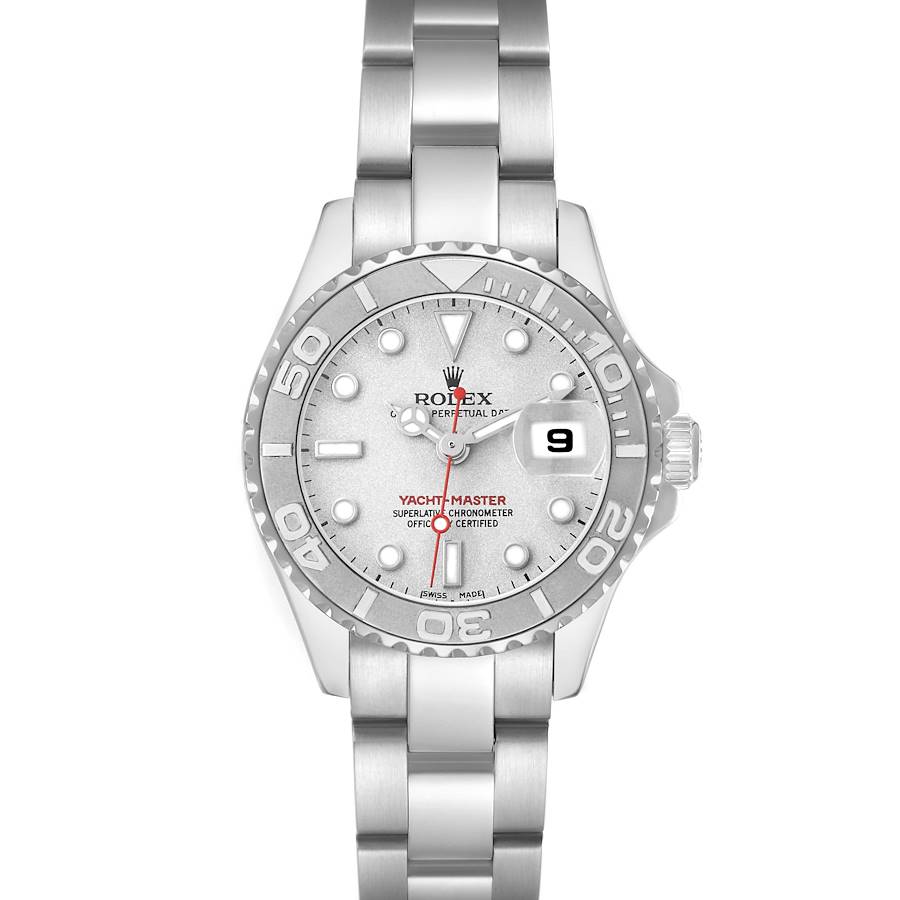 Rolex Yachtmaster 29 Steel Platinum Dial Bezel Ladies Watch 169622. Officially certified chronometer automatic self-winding movement. Stainless steel oyster case 29.0 mm in diameter. Pointed crown guards. Rolex logo on the crown. Platinum special time-lapse bidirectional rotating bezel with raised numerals 60-minute graduation. Scratch resistant sapphire crystal with a cyclops magnifier. Platinum dial with luminescent dot hour markers and Mercedes hands. Luminescent red lollipop-tipped center seconds hand. Date calendar at the 3 o'clock aperture. Outer stick minute markers. Stainless steel oyster bracelet with a flip-lock clasp. Fits a 6.5" wrist.