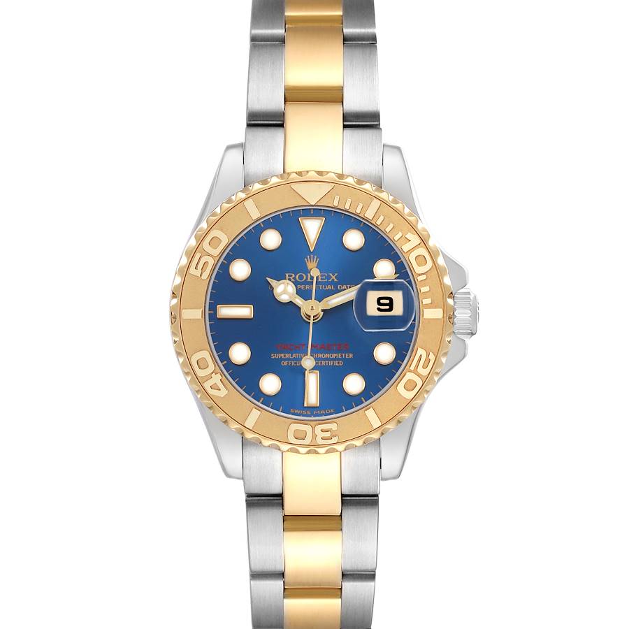 Rolex Yachtmaster 29 Steel Yellow Gold Blue Dial Ladies Watch 169623. Officially certified chronometer automatic self-winding movement. Stainless steel and 18K yellow gold oyster case 29.0 mm in diameter. Rolex logo on the crown. 18K yellow gold special time-lapse bidirectional rotating bezel. Scratch resistant sapphire crystal with a cyclops magnifier. Blue dial with luminescent yellow gold baton hands and hour markers. Date calendar at the 3 o'clock aperture. Stainless steel and 18K yellow gold oyster bracelet with a flip-lock clasp. Fits a 7" wrist.