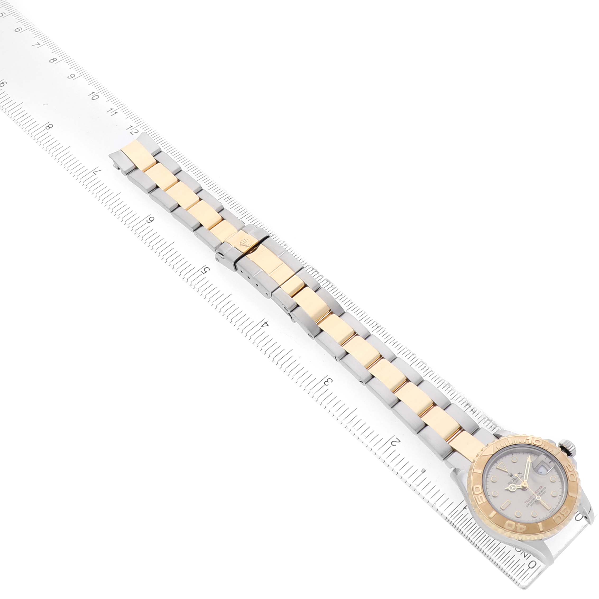 | Bracelet: | Stainless steel and 18K yellow gold oyster bracelet with a flip-lock clasp. Fits a 6 1/2" wrist. |