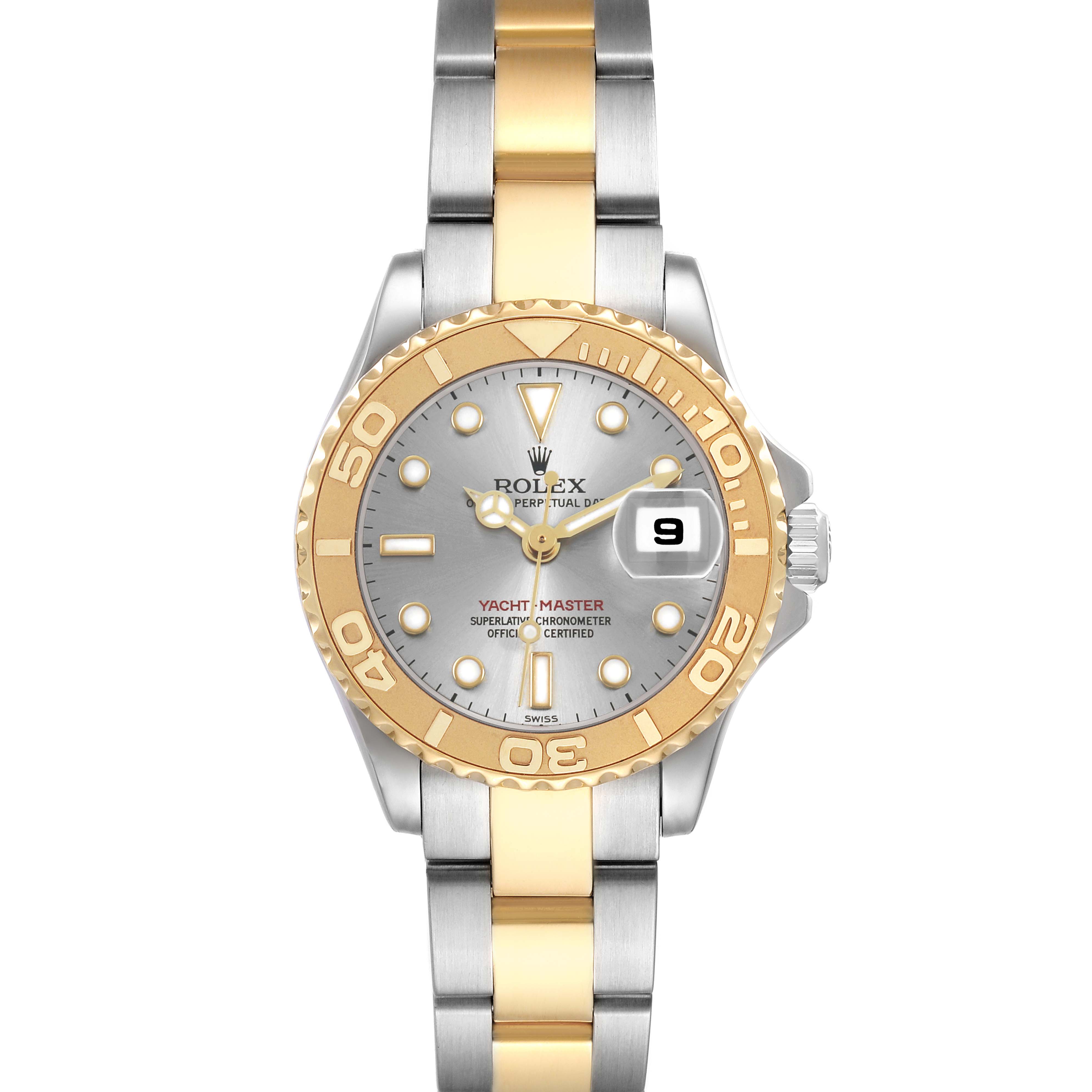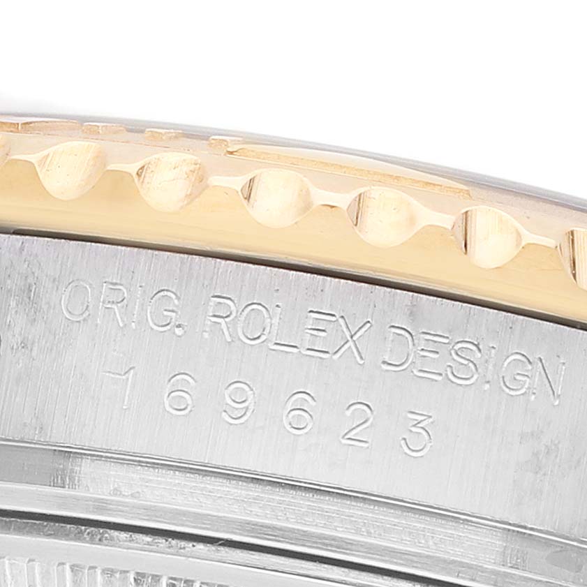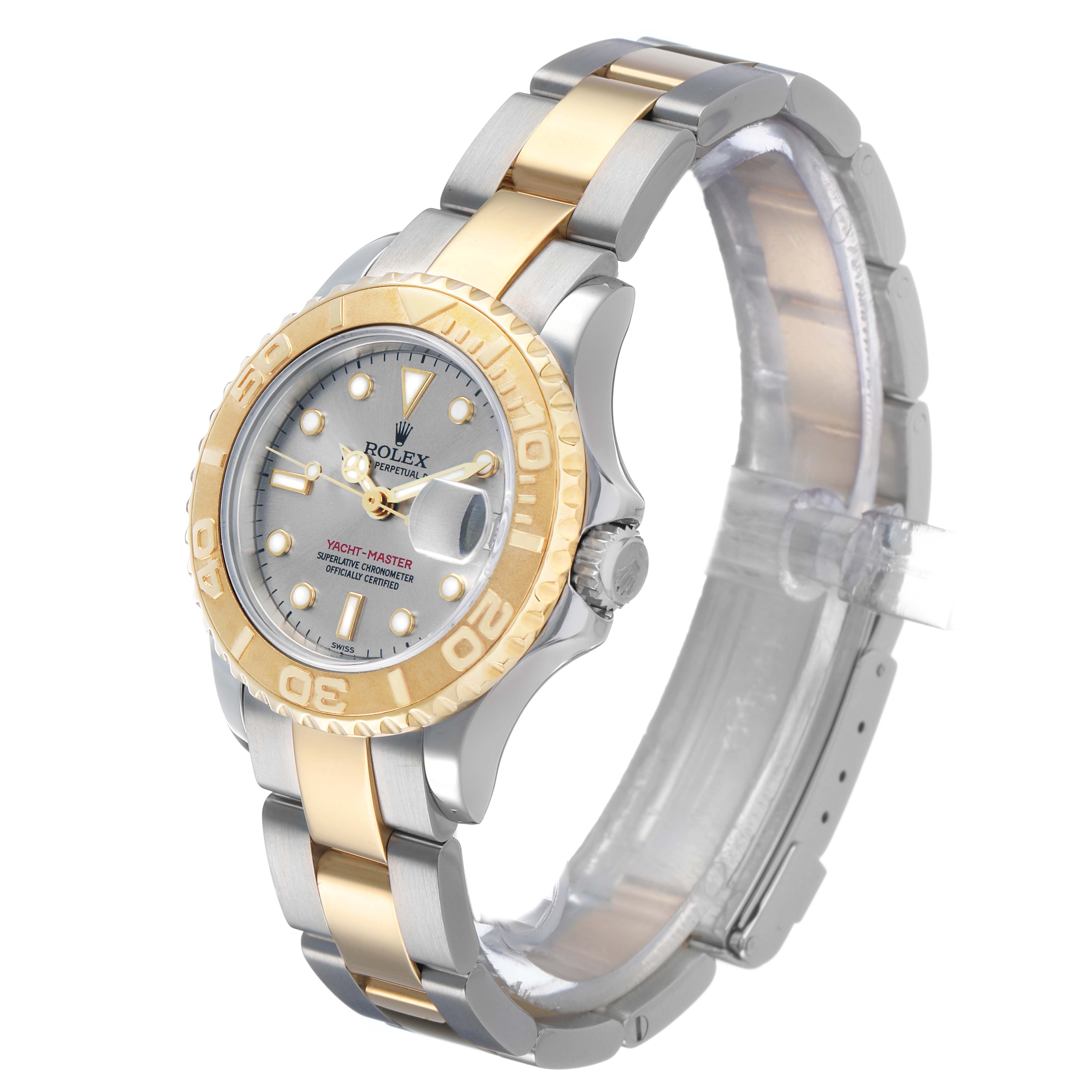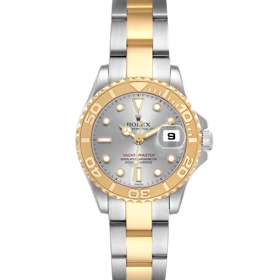 Rolex Yachtmaster 29 Steel Yellow Gold Ladies Watch 169623. Officially certified chronometer automatic self-winding movement. Stainless steel and 18K yellow gold oyster case 29.0 mm in diameter. Rolex logo on the crown. 18K yellow gold special time-lapse bidirectional rotating bezel. Scratch resistant sapphire crystal with a cyclops magnifier. Slate dial with luminescent baton, triangular, and round hour markers. Date calendar at the 3 o'clock aperture. Stainless steel and 18K yellow gold oyster bracelet with a flip-lock clasp. Fits a 6 1/2" wrist.
