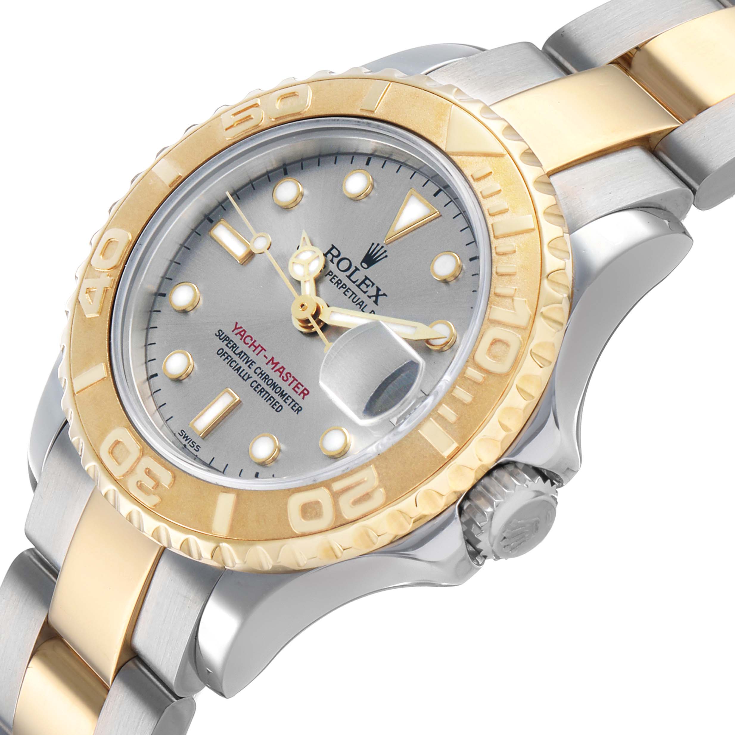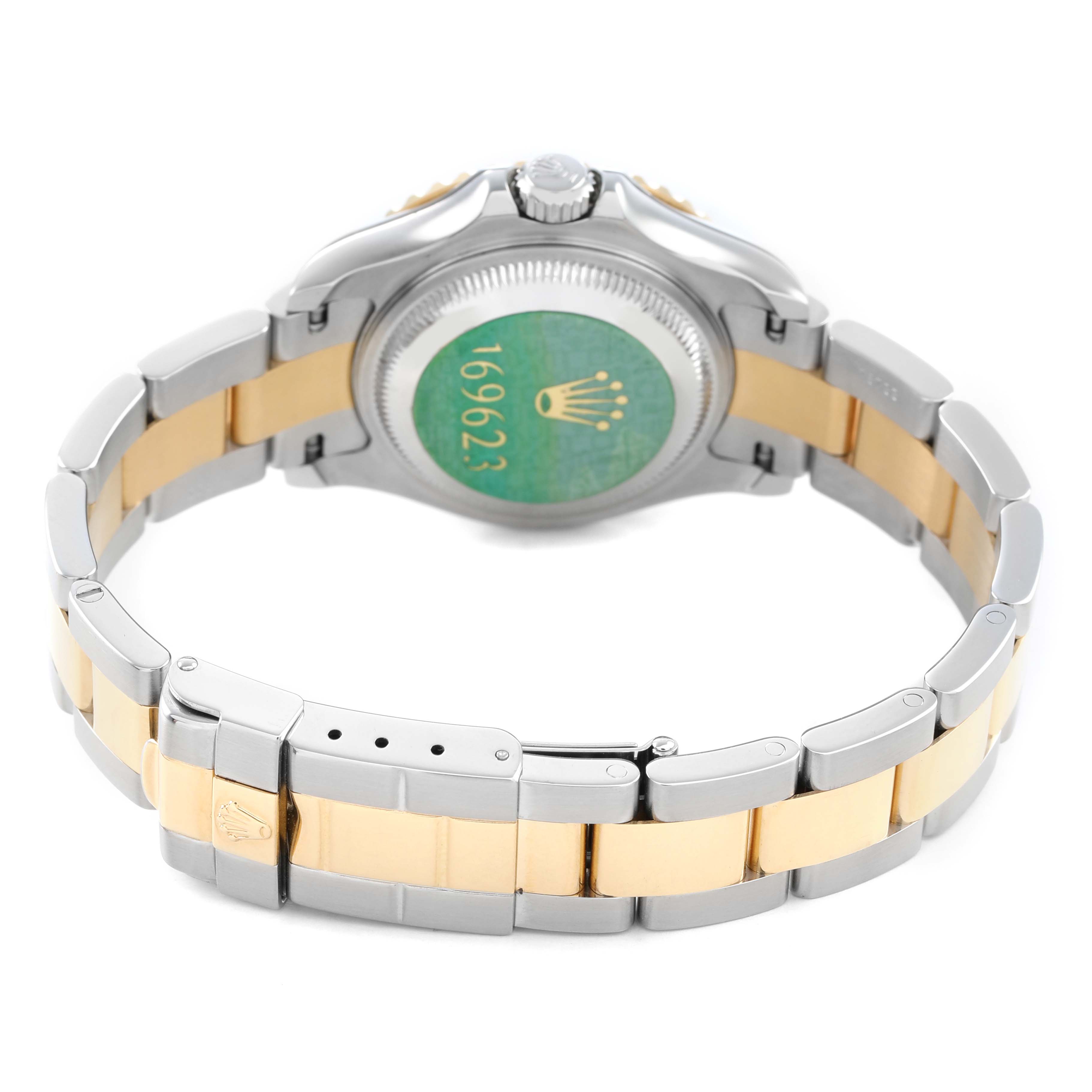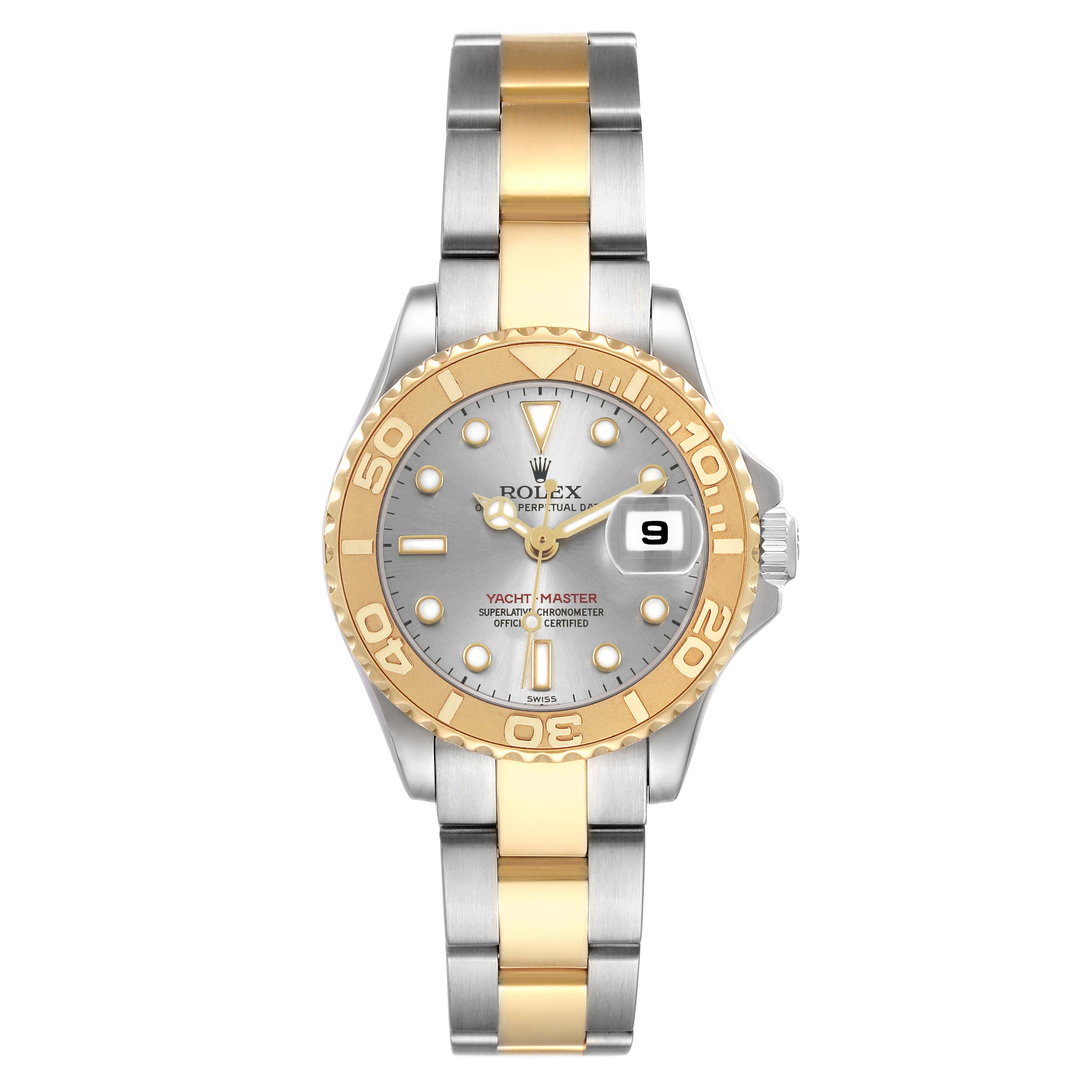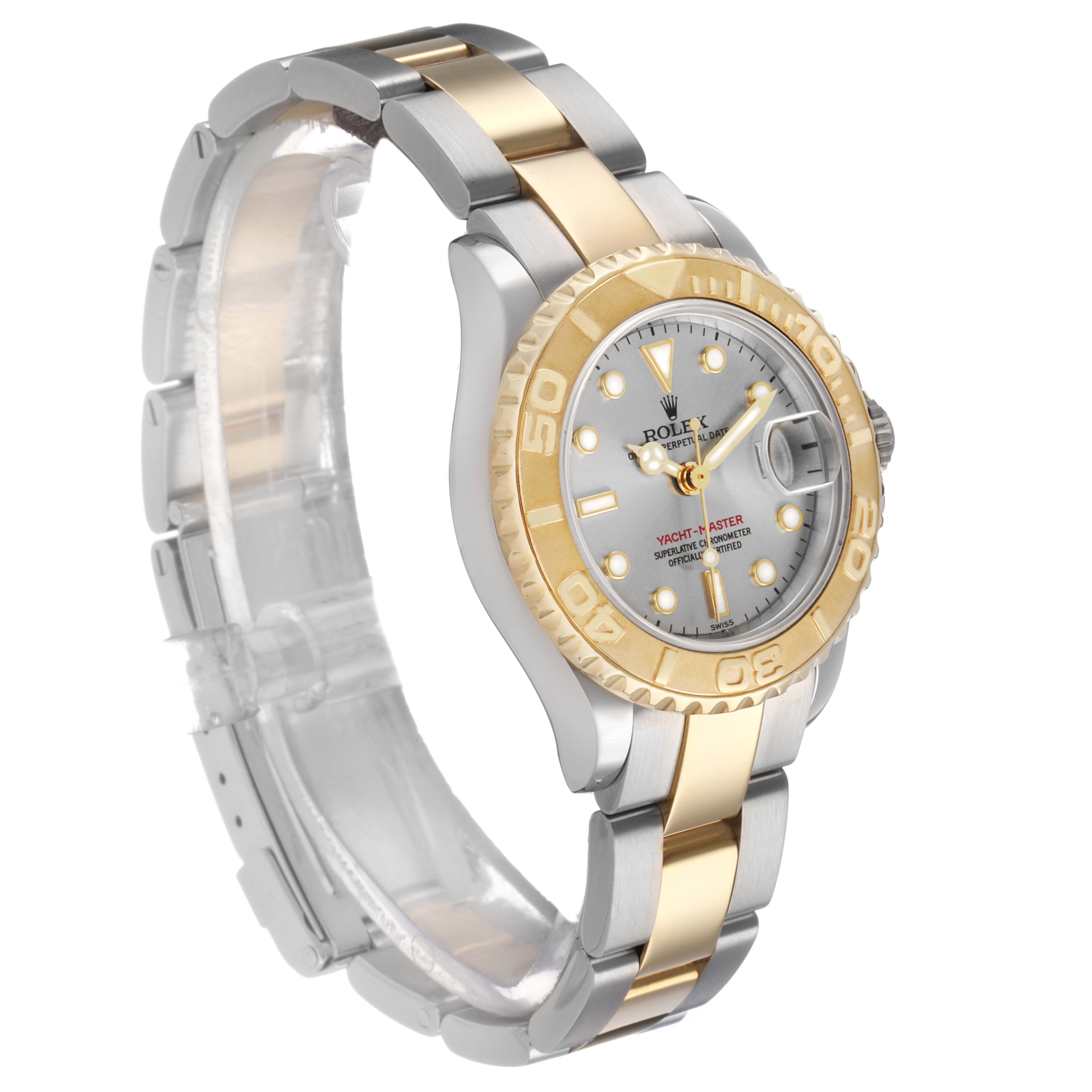 Rolex Yachtmaster 29 Steel Yellow Gold Ladies Watch 169623. Officially certified chronometer automatic self-winding movement. Stainless steel and 18K yellow gold oyster case 29.0 mm in diameter. Rolex logo on the crown. 18K yellow gold special time-lapse bidirectional rotating bezel. Scratch resistant sapphire crystal with a cyclops magnifier. Slate dial with luminescent baton, triangular, and round hour markers. Date calendar at the 3 o'clock aperture. Stainless steel and 18K yellow gold oyster bracelet with a flip-lock clasp. Fits a 6 1/2" wrist.