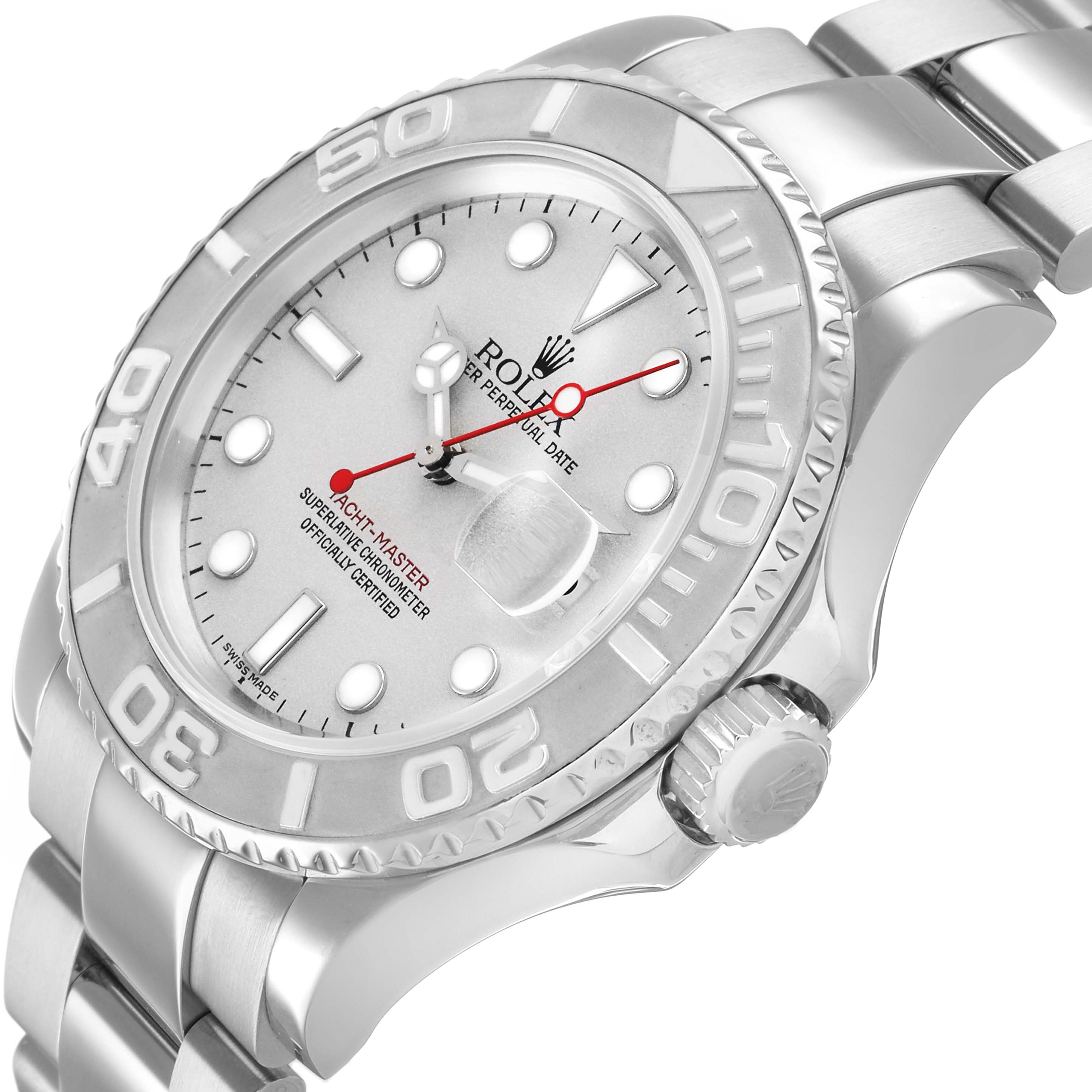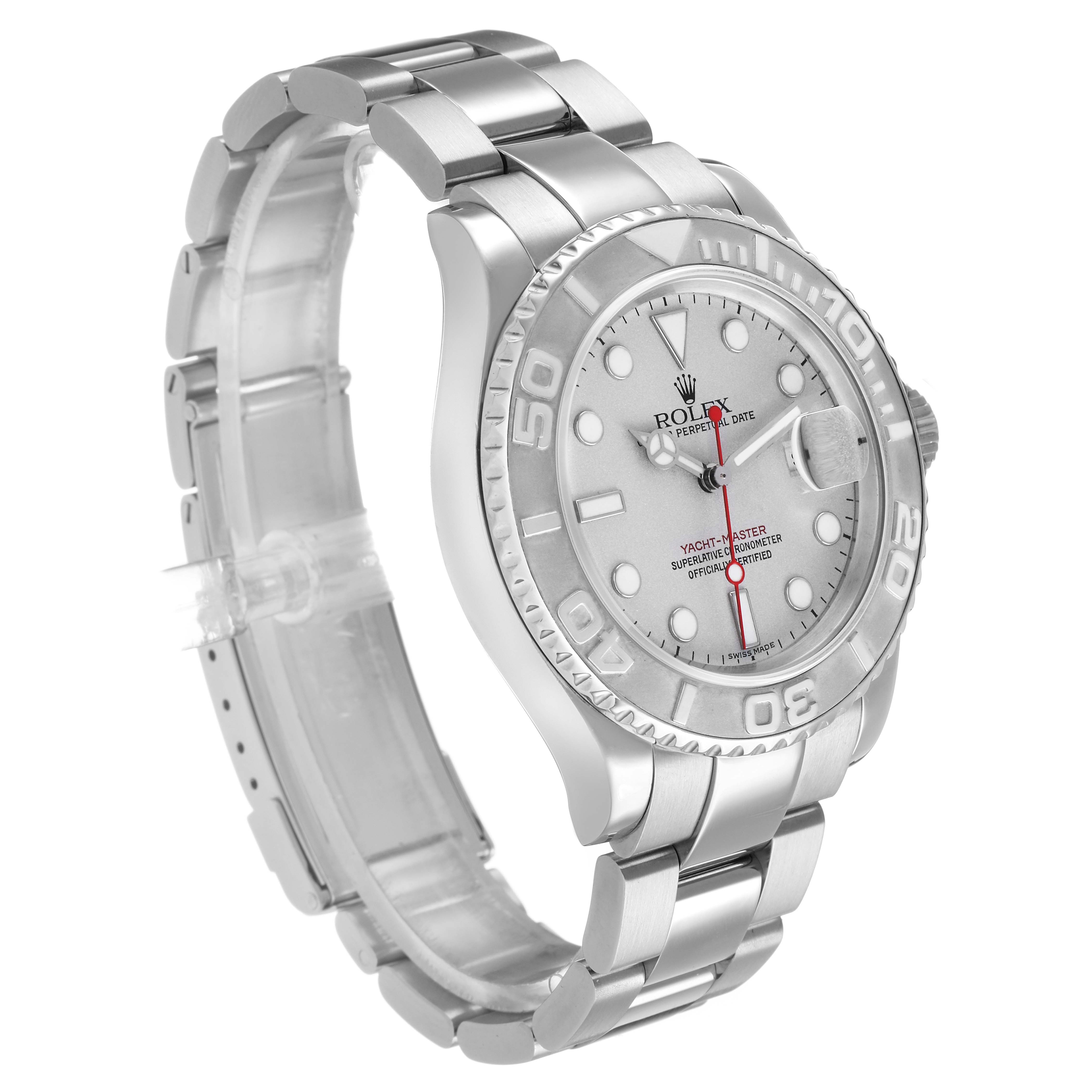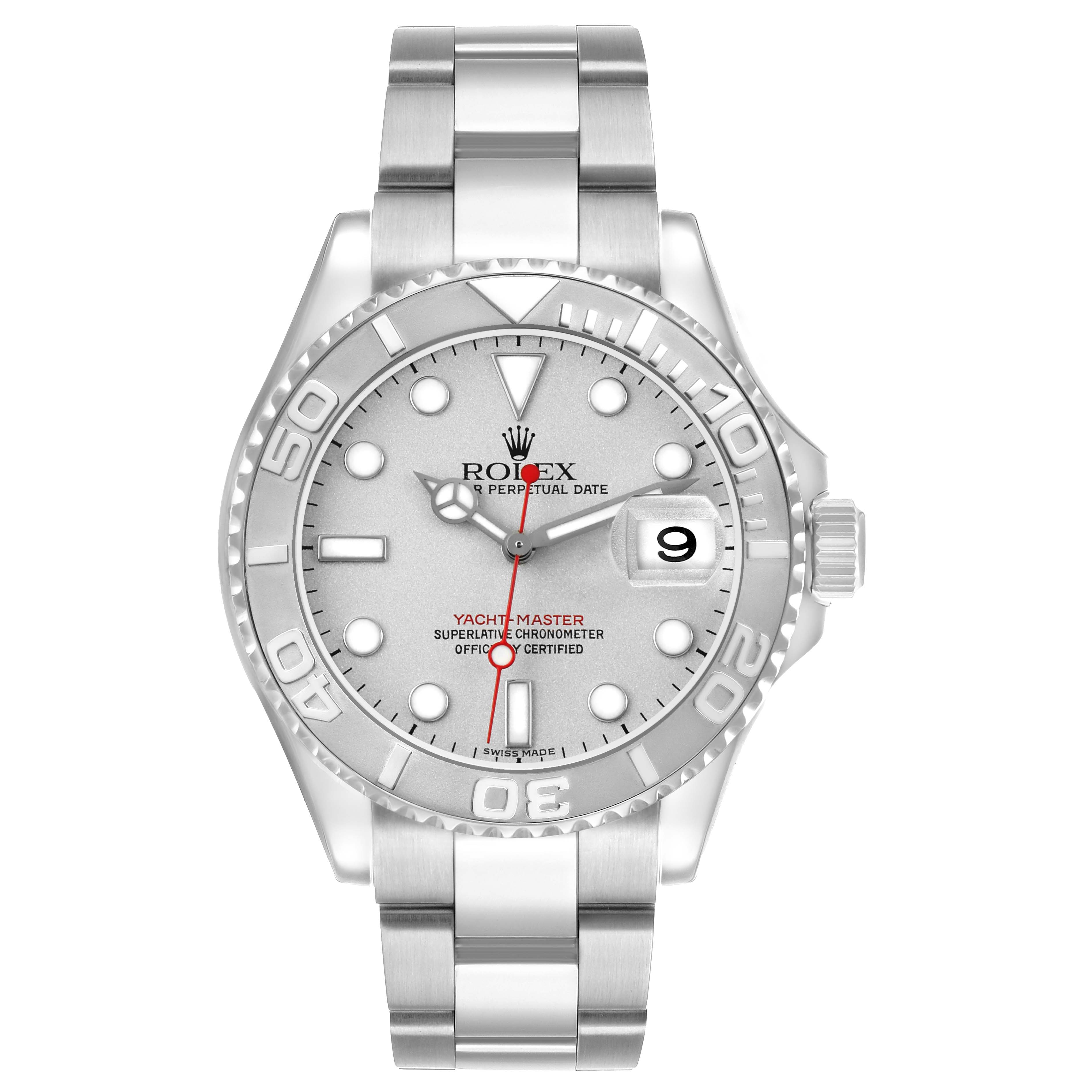 Rolex Yachtmaster 40 Steel Platinum Dial Bezel Mens Watch 16622. Officially certified chronometer automatic self-winding movement. Stainless steel oyster case 40.0 mm in diameter. Pointed crown guards. Rolex logo on the crown. Platinum special time-lapse bidirectional rotating bezel. Scratch resistant sapphire crystal with a cyclops magnifier. Platinum dial with luminescent dot hour markers and Mercedes hands. Luminescent red lollipop-tipped centre seconds hand. Stick minute markers around the outer rim. Date calendar at the 3 o'clock aperture. Stainless steel oyster bracelet with a flip-lock clasp. Fits a 7 1/2" wrist.