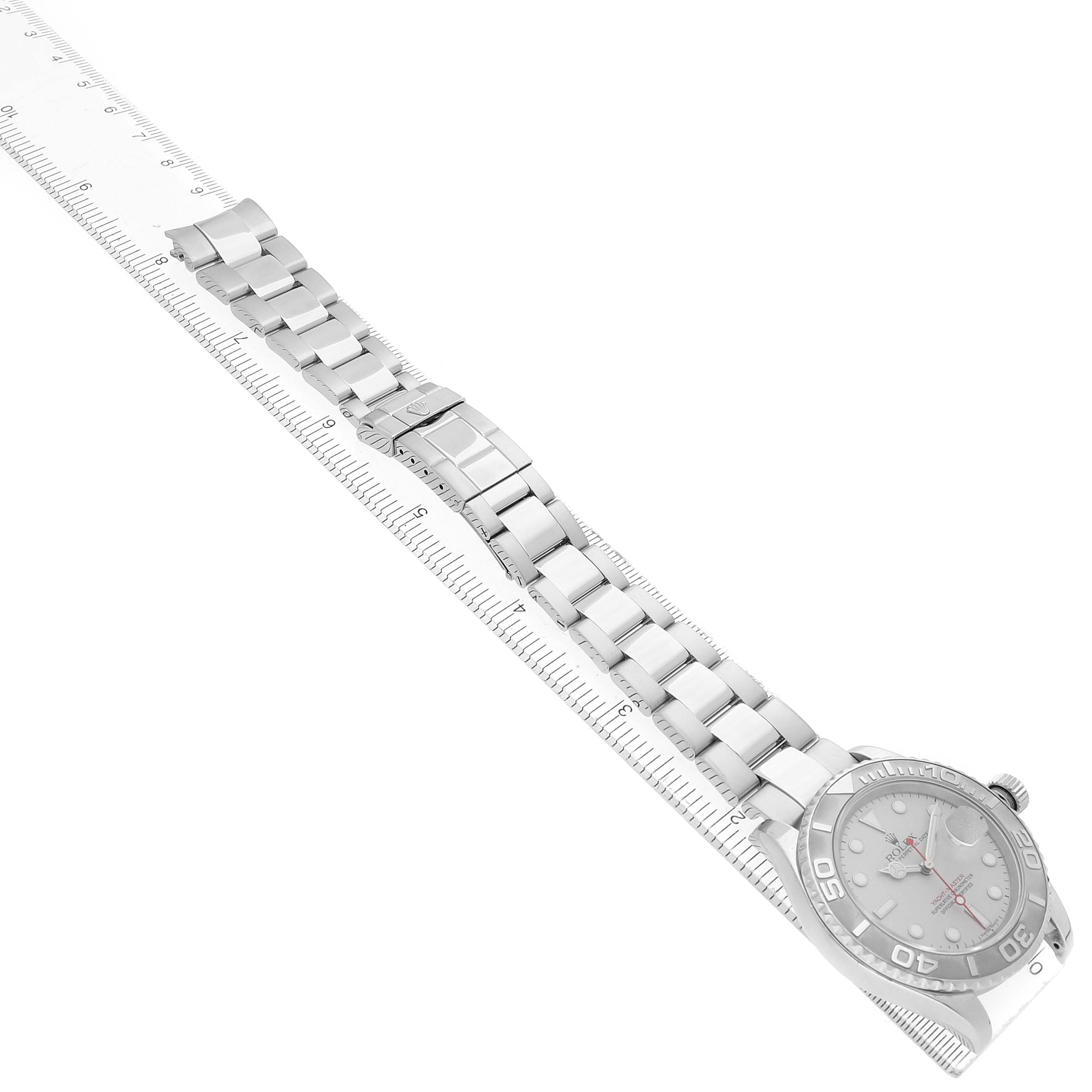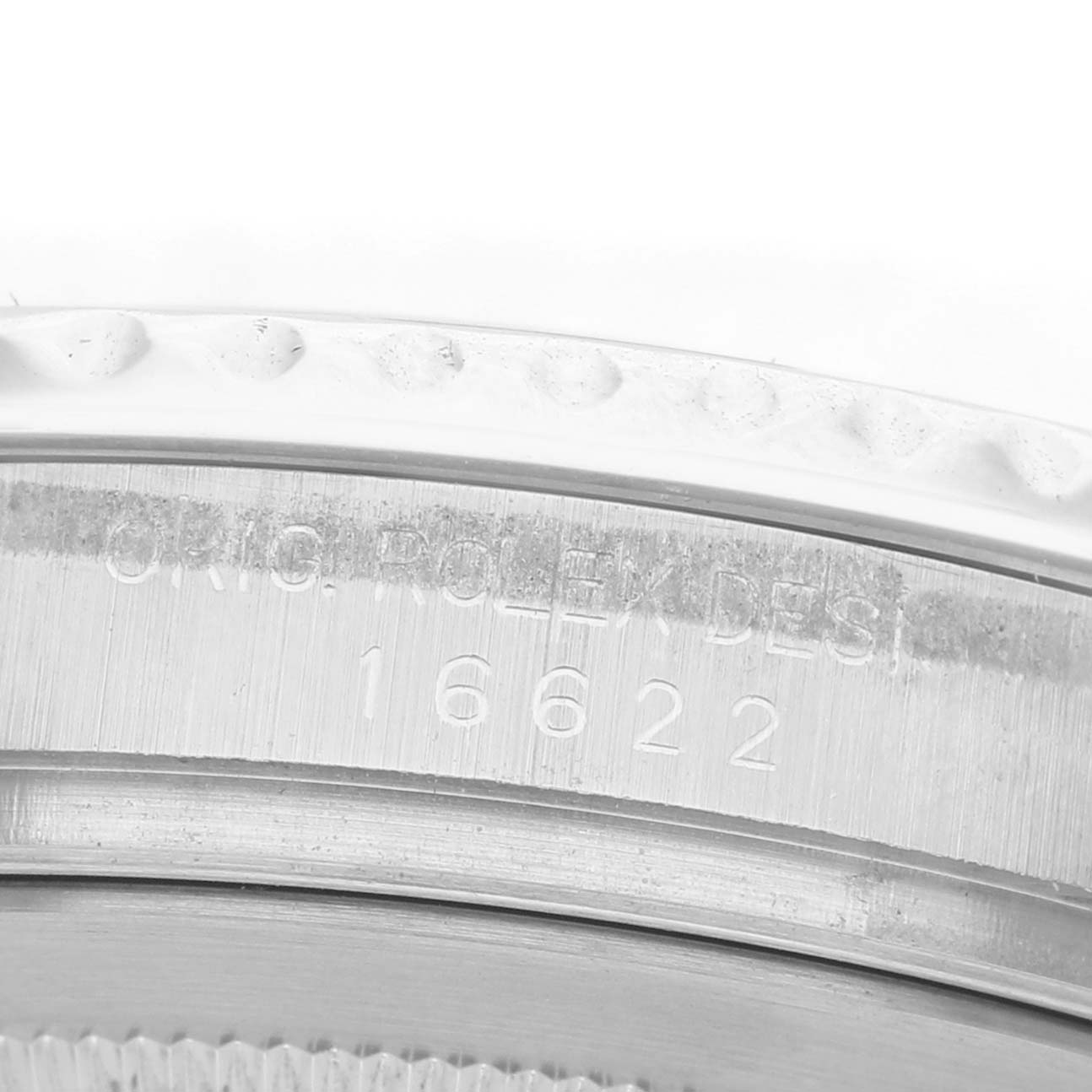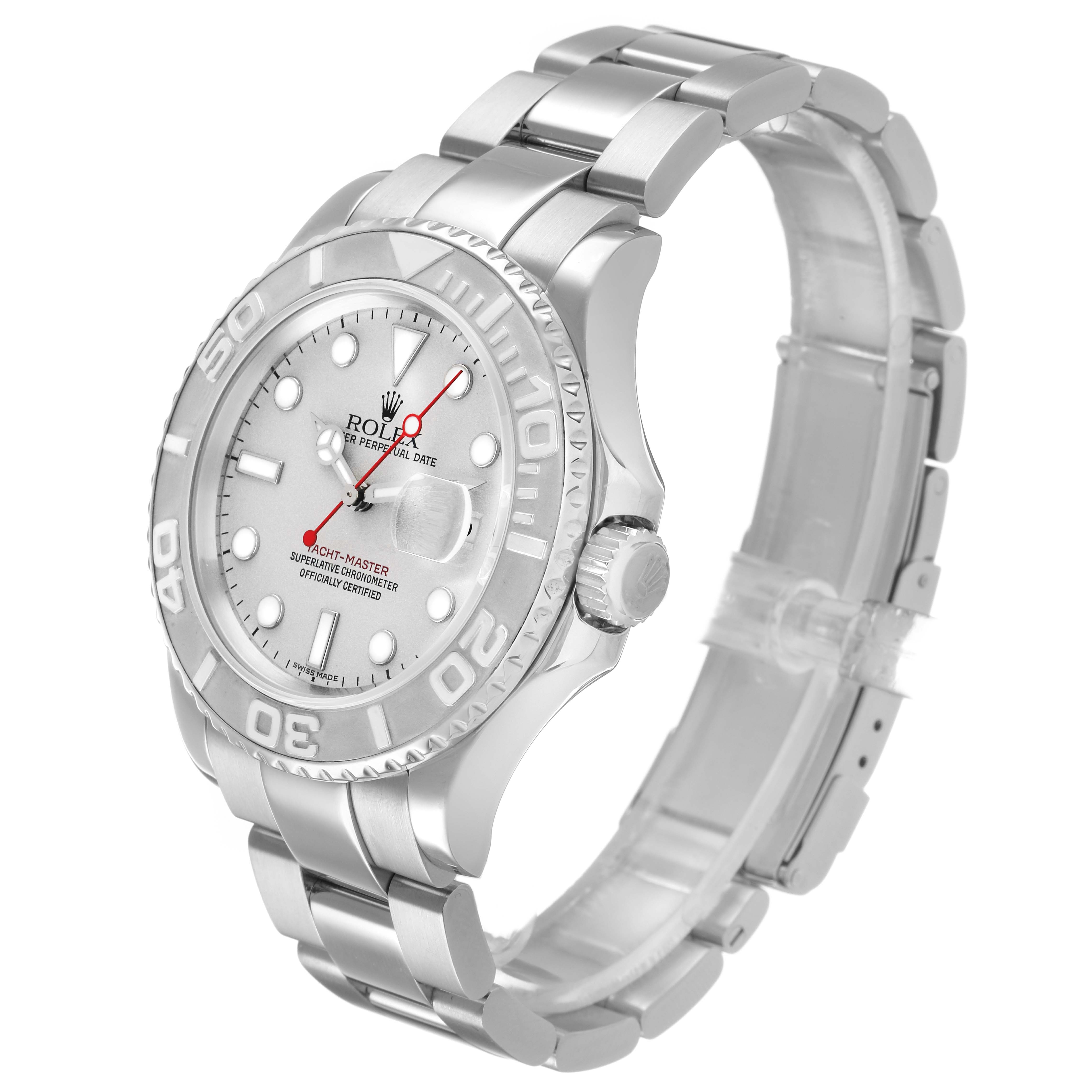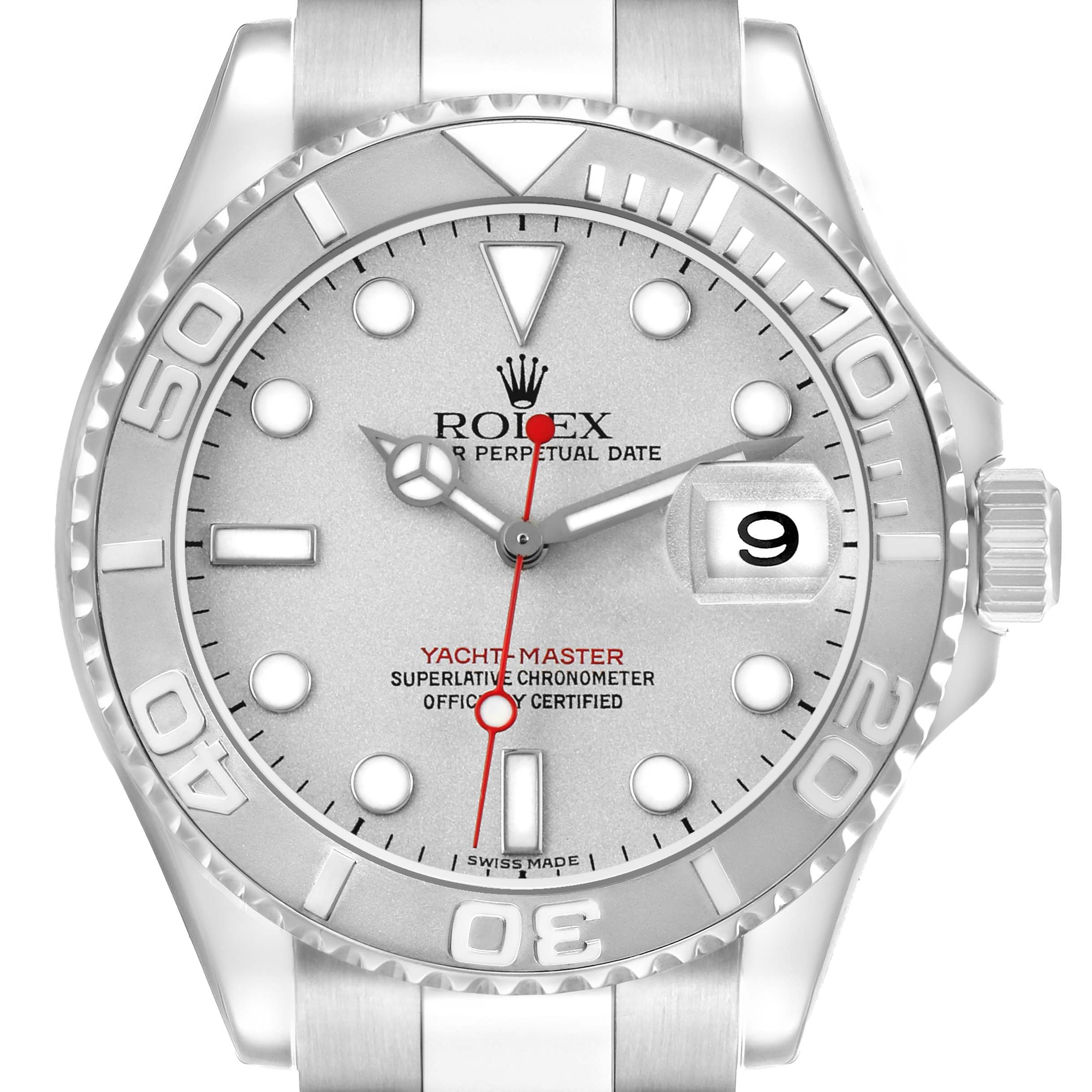 Rolex Yachtmaster 40 Steel Platinum Dial Bezel Mens Watch 16622. Officially certified chronometer automatic self-winding movement. Stainless steel oyster case 40.0 mm in diameter. Pointed crown guards. Rolex logo on the crown. Platinum special time-lapse bidirectional rotating bezel. Scratch resistant sapphire crystal with a cyclops magnifier. Platinum dial with luminescent dot hour markers and Mercedes hands. Luminescent red lollipop-tipped centre seconds hand. Stick minute markers around the outer rim. Date calendar at the 3 o'clock aperture. Stainless steel oyster bracelet with a flip-lock clasp. Fits a 7 1/2" wrist.