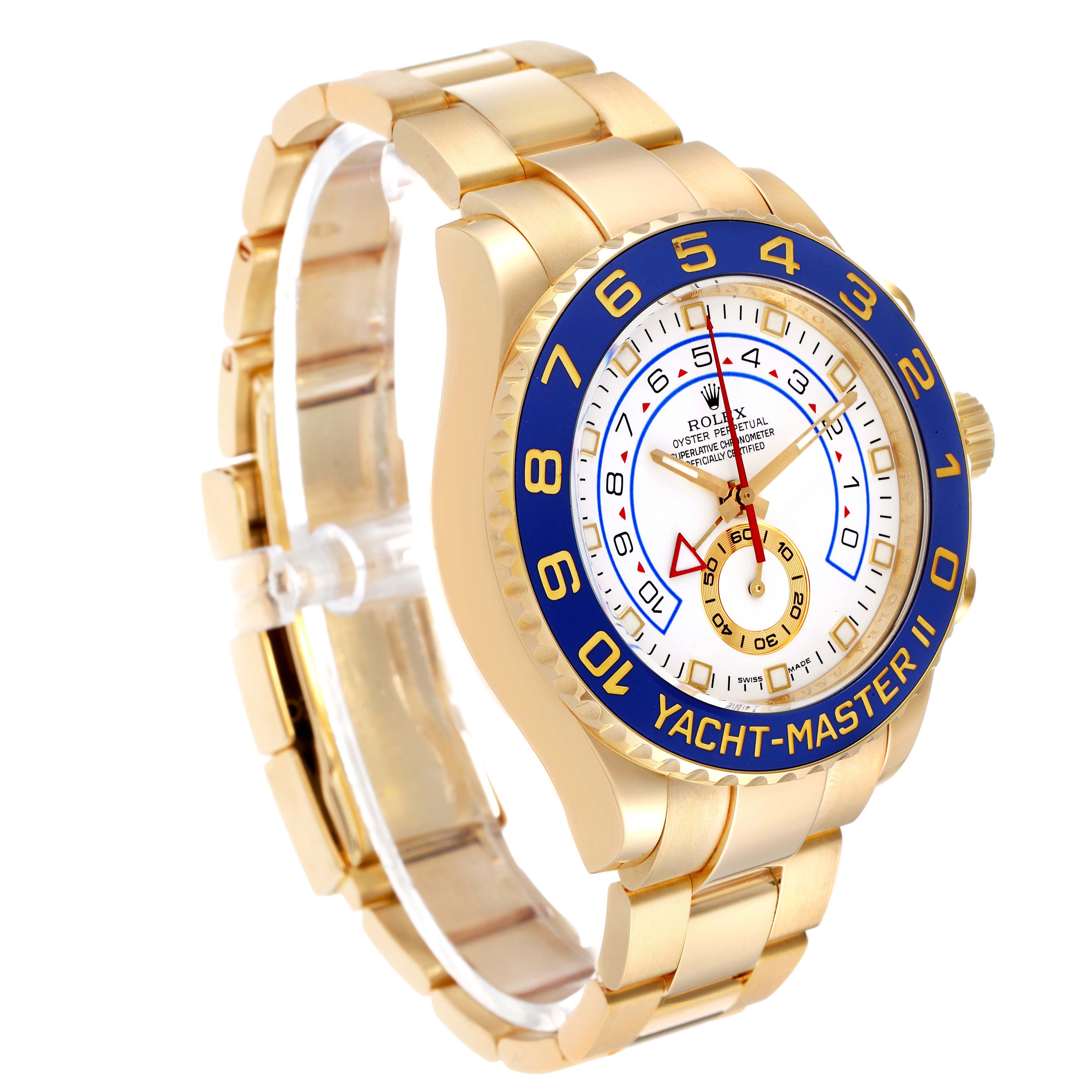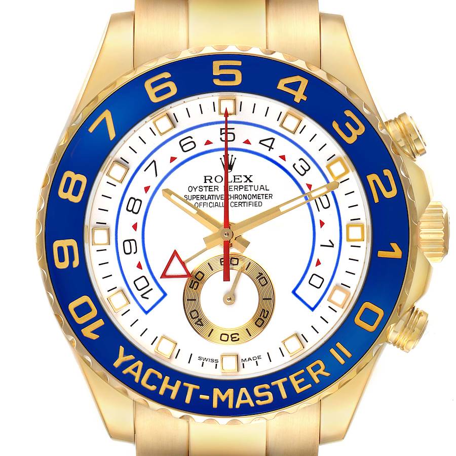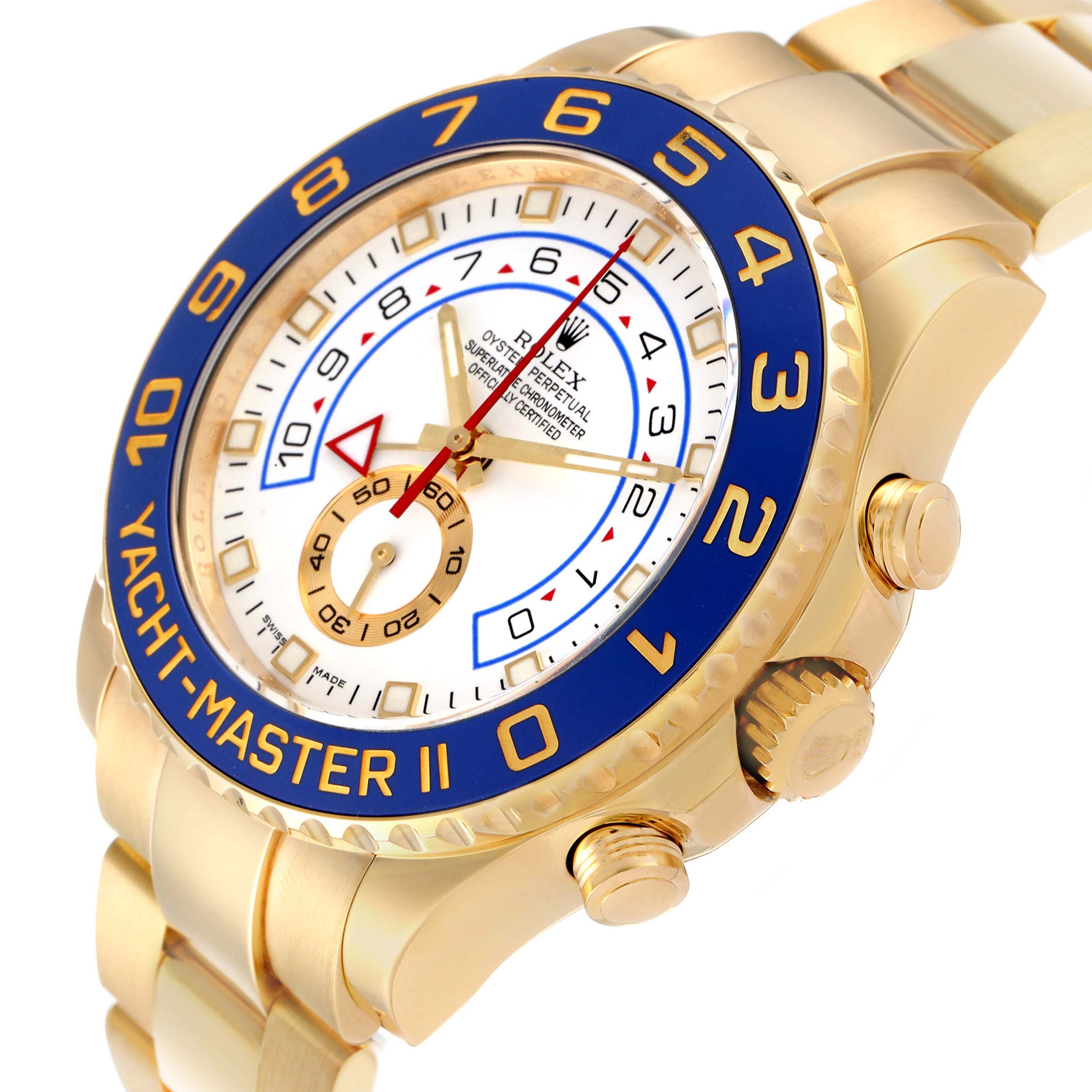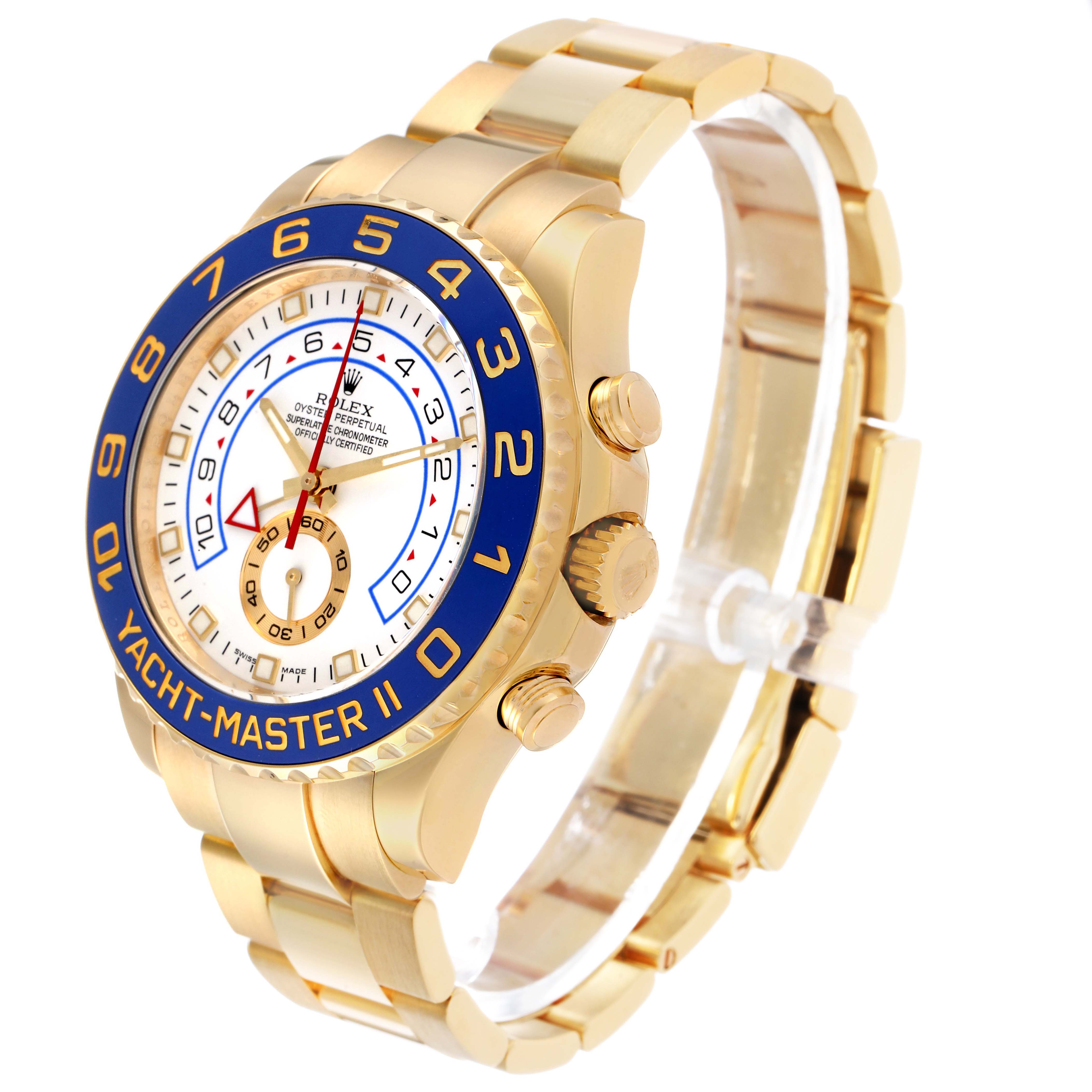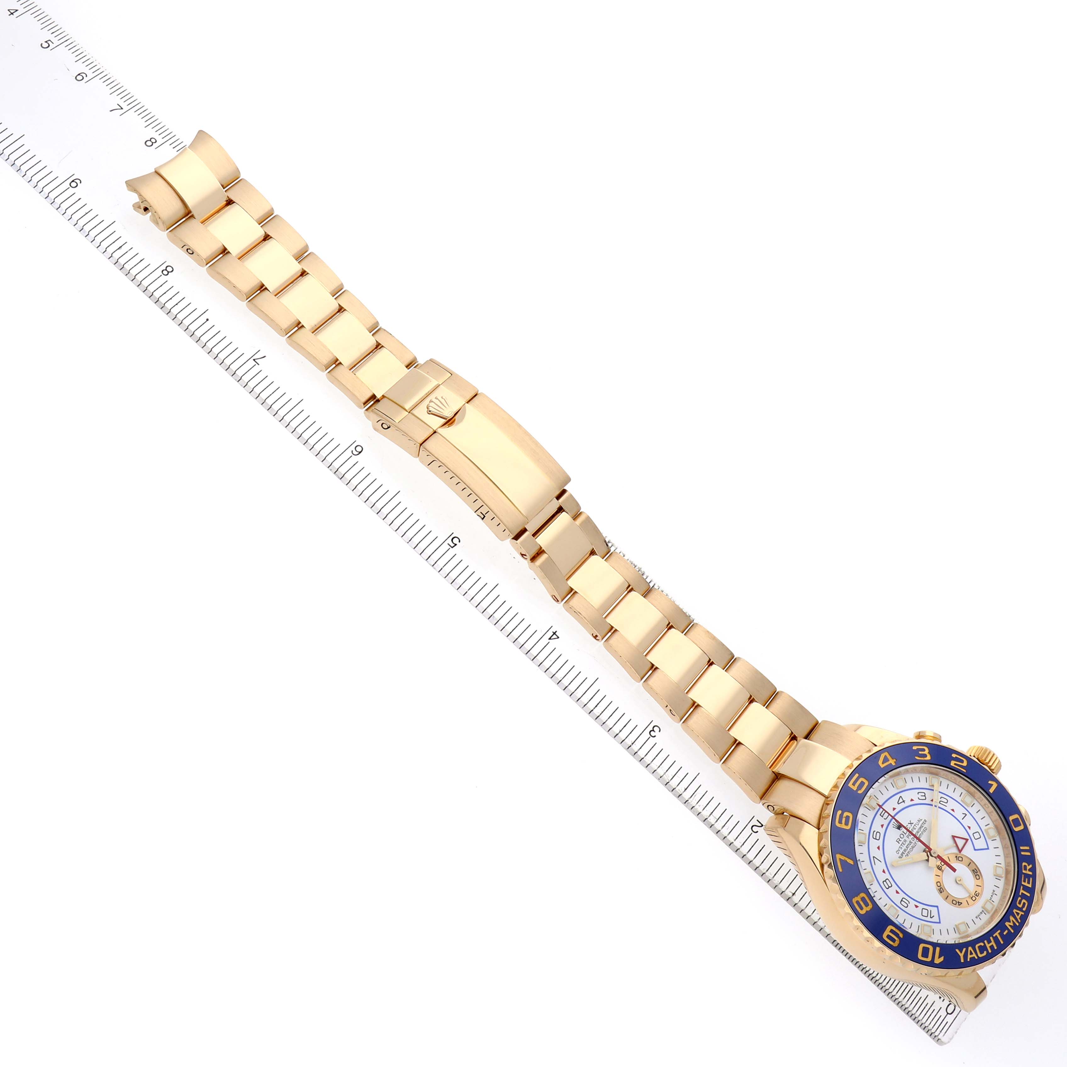 Rolex Yachtmaster II Regatta Yellow Gold Mens Watch 116688. Officially certified automatic chronometer self-winding movement. 18K yellow gold oyster case 44.0 mm in diameter. Two 18k yellow gold pushers operate the chronograph functions. Pointed crown guards. Rolex logo on the 18k yellow gold screw-down crown. Blue Ring Command 90-degree rotating yellow gold bezel with a blue ceramic top ring. Scratch resistant sapphire crystal. White dial with luminescent baton hands and square yellow gold outlined hour markers. Red central chronograph hand. Regatta 0-10 countdown timer with a red arrow-shaped countdown hand. Yellow gold outlined 60 seconds subdial at the six o'clock position. Outer stick minute markers. Small seconds subdial at 6 o'clock. 18K yellow gold oyster bracelet with a flip-lock clasp. Fits an 8" wrist.