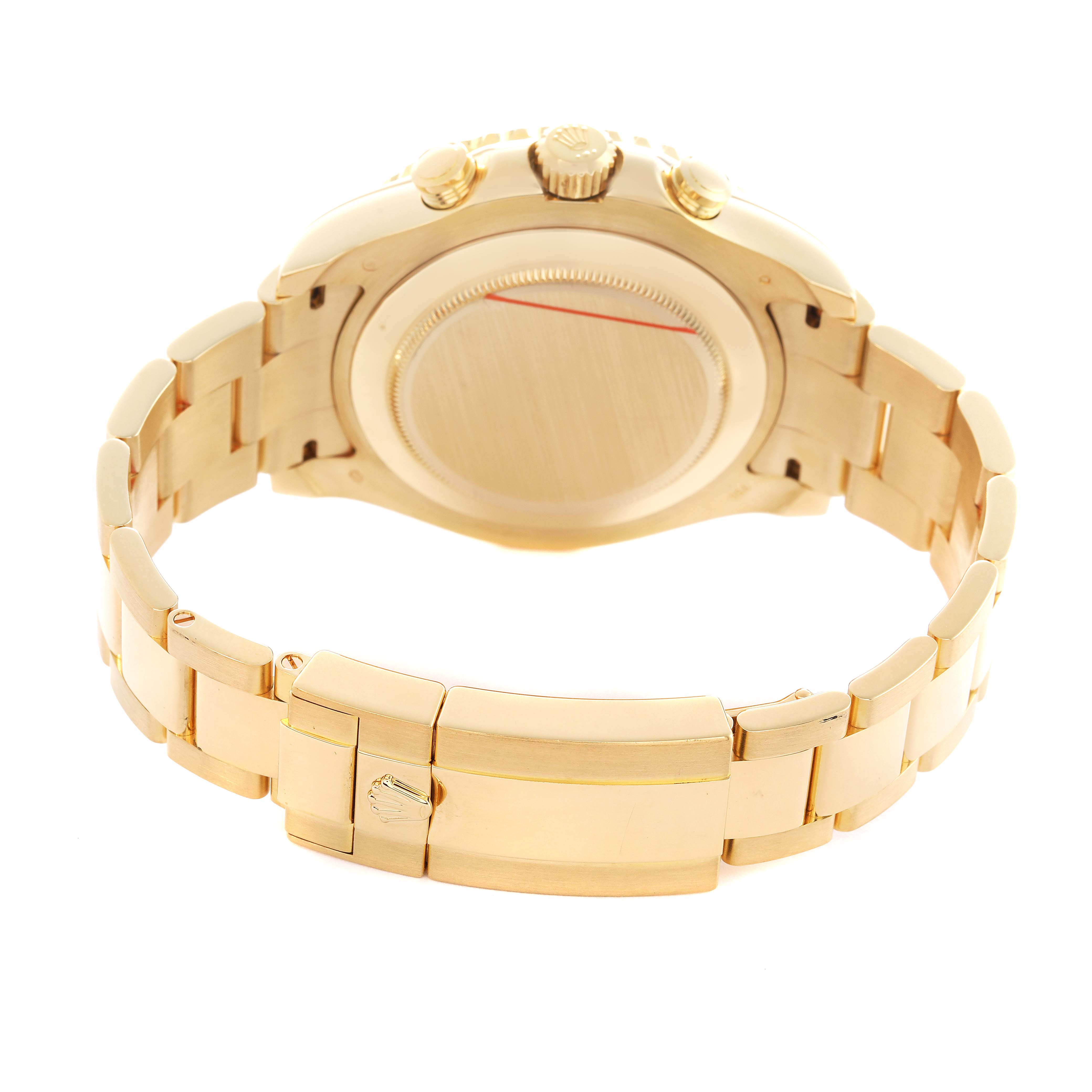 | Case: | 18K yellow gold oyster case 44.0 mm in diameter. Two 18k yellow gold pushers operate the chronograph functions. Pointed crown guards. Rolex logo on the 18k yellow gold screw-down crown. |