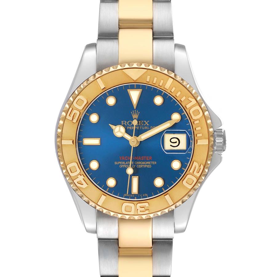 Rolex Yachtmaster Midsize 35 Blue Dial Steel Yellow Gold Mens Watch 68623. Officially certified chronometer automatic self-winding movement. Stainless steel and 18K yellow gold oyster case 35.0 mm in diameter. Rolex logo on the crown. 18K yellow gold special time-lapse bidirectional rotating bezel. Scratch resistant sapphire crystal with a cyclops magnifier. Blue dial with luminescent dive-style hour markers and Mercedes hands. Date calendar at the 3 o'clock aperture. Stainless steel and 18K yellow gold oyster bracelet with a flip-lock clasp. Fits up to a 7 1/4" wrist.