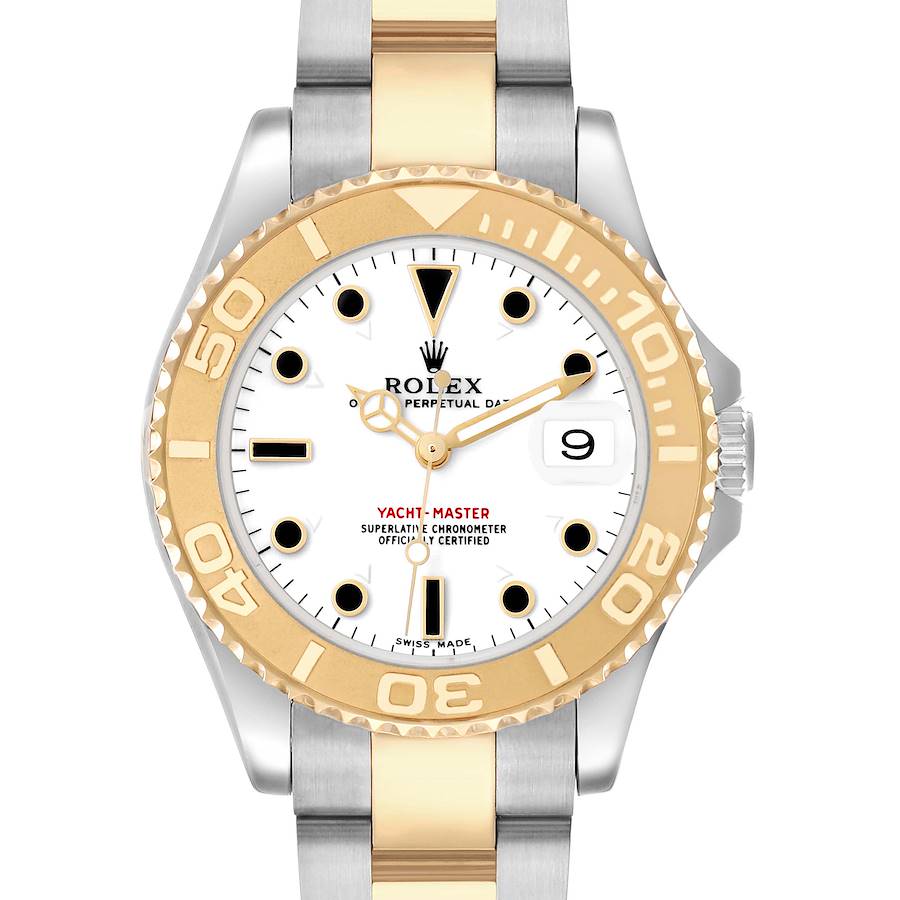 Rolex Yachtmaster Midsize Steel Yellow Gold Mens Watch 168623. Officially certified chronometer automatic self-winding movement. Stainless steel and 18K yellow gold oyster case 35.0 mm in diameter. Rolex logo on the crown. 18K yellow gold special time-lapse bidirectional rotating bezel. Scratch resistant sapphire crystal with a cyclops magnifier. White dial with gilt black dive style hour markers and luminescent yellow gold Mercedes hands. Date calendar at the 3 o'clock aperture. Stainless steel and 18K yellow gold oyster bracelet with a flip-lock clasp. Fits a 7 1/4" wrist.