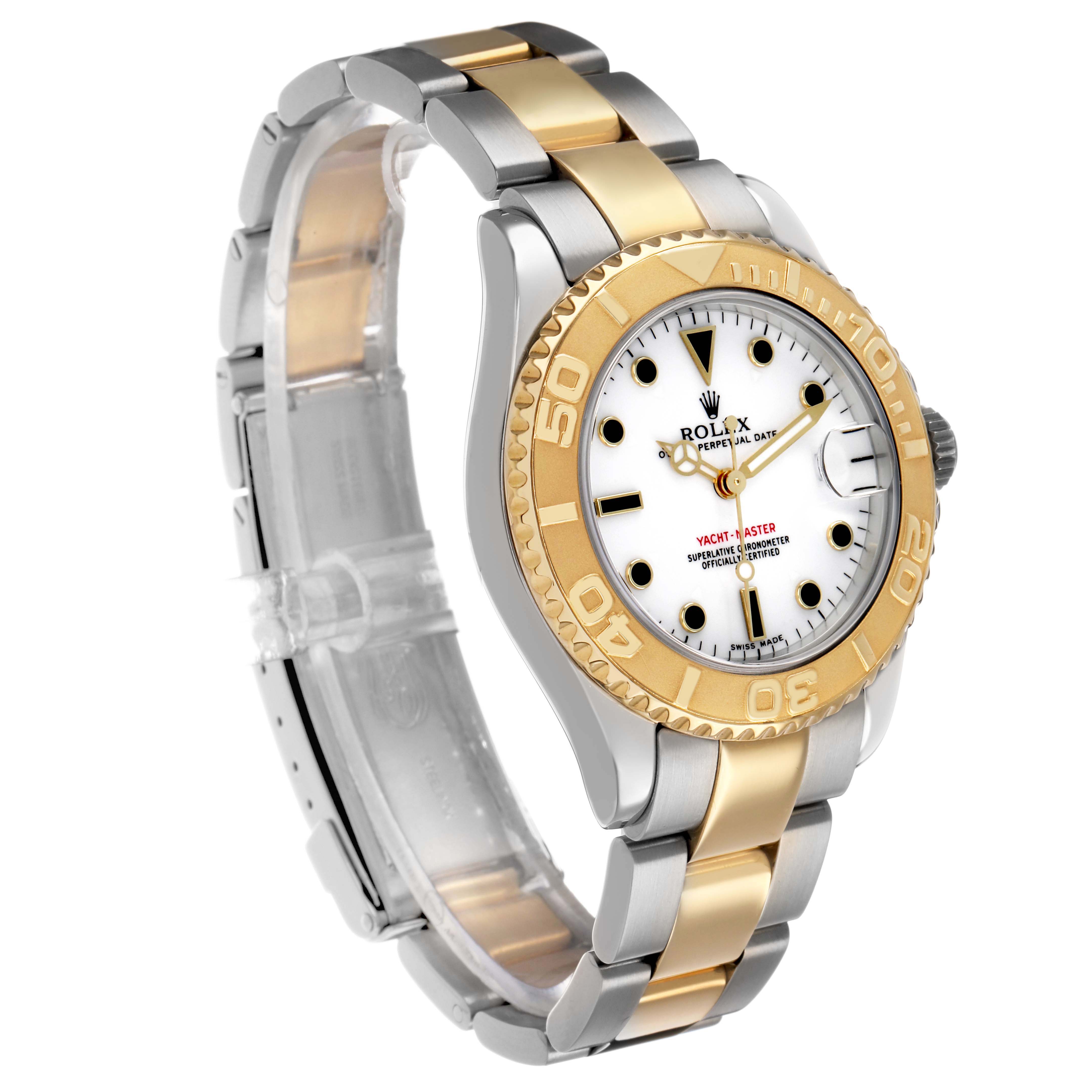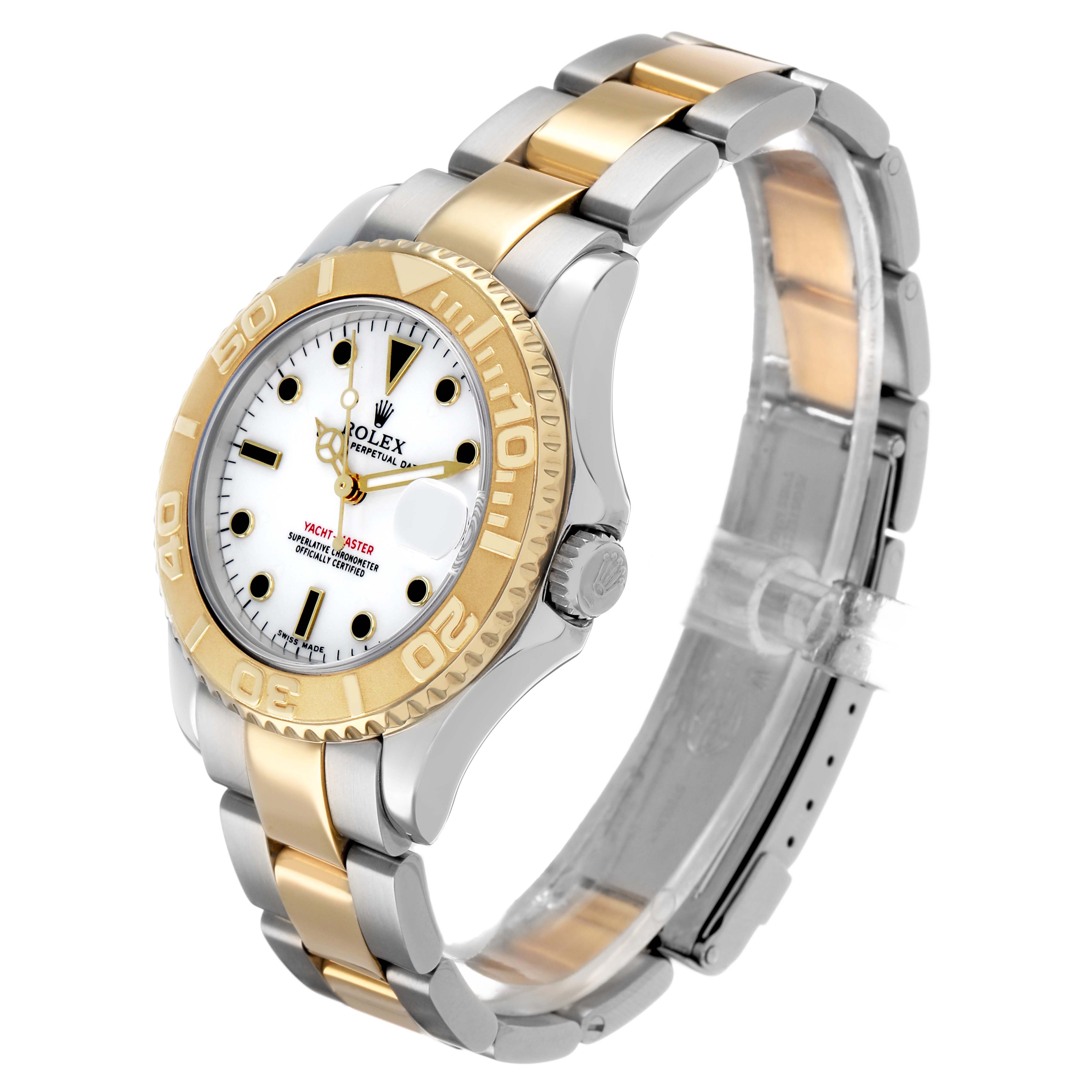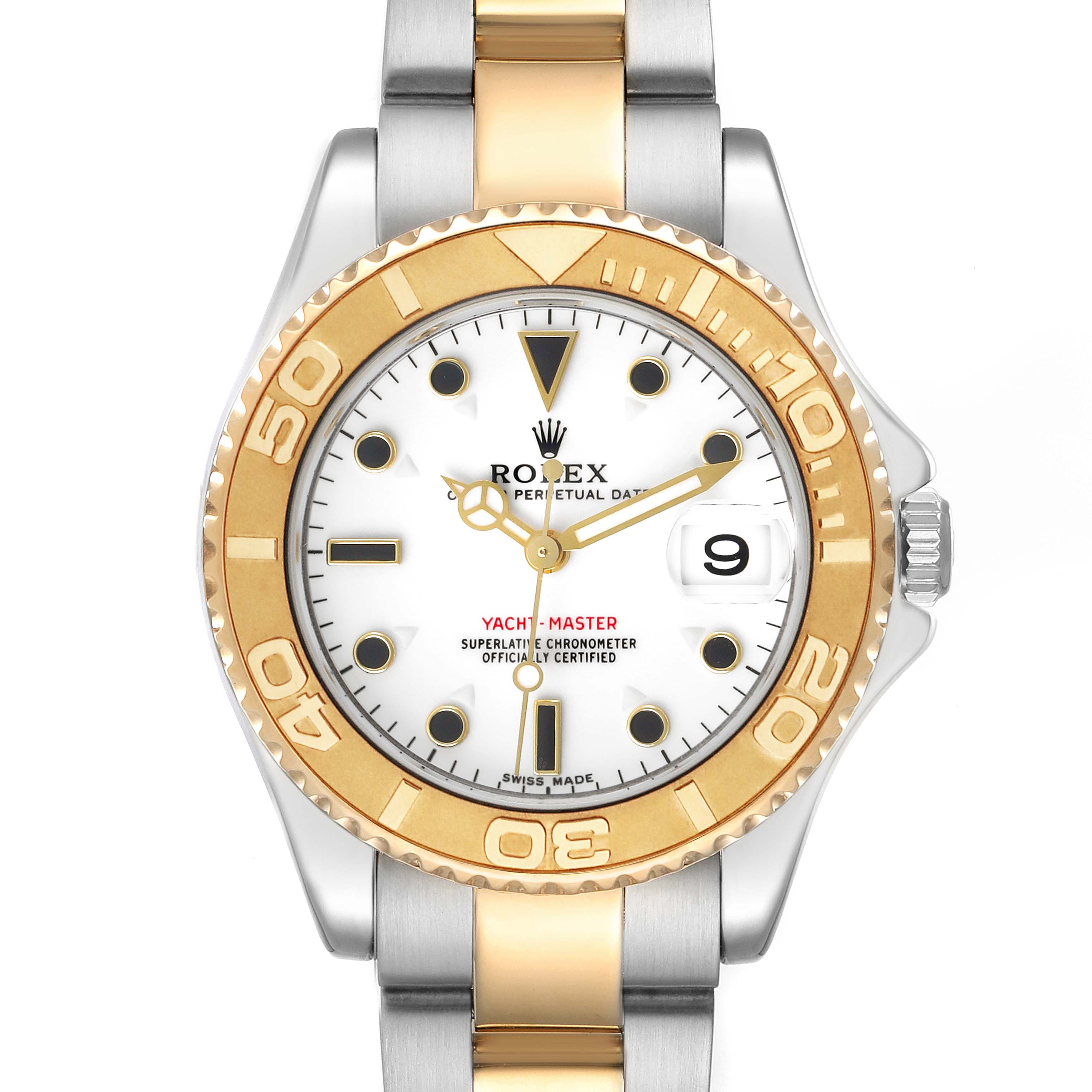 Rolex Yachtmaster Midsize Steel Yellow Gold White Dial Mens Watch 168623. Officially certified chronometer automatic self-winding movement. Stainless steel and 18K yellow gold oyster case 35.0 mm in diameter. Rolex logo on the crown. 18K yellow gold special time-lapse bidirectional rotating bezel. Scratch resistant sapphire crystal with a cyclops magnifier. White dial with gilt black dive style hour markers and luminescent yellow gold Mercedes hands. Date calendar at the 3 o'clock aperture. Stainless steel and 18K yellow gold oyster bracelet with a flip-lock clasp. Fits a 7" wrist.