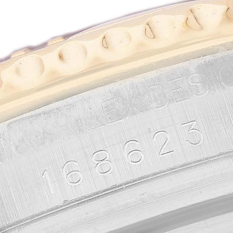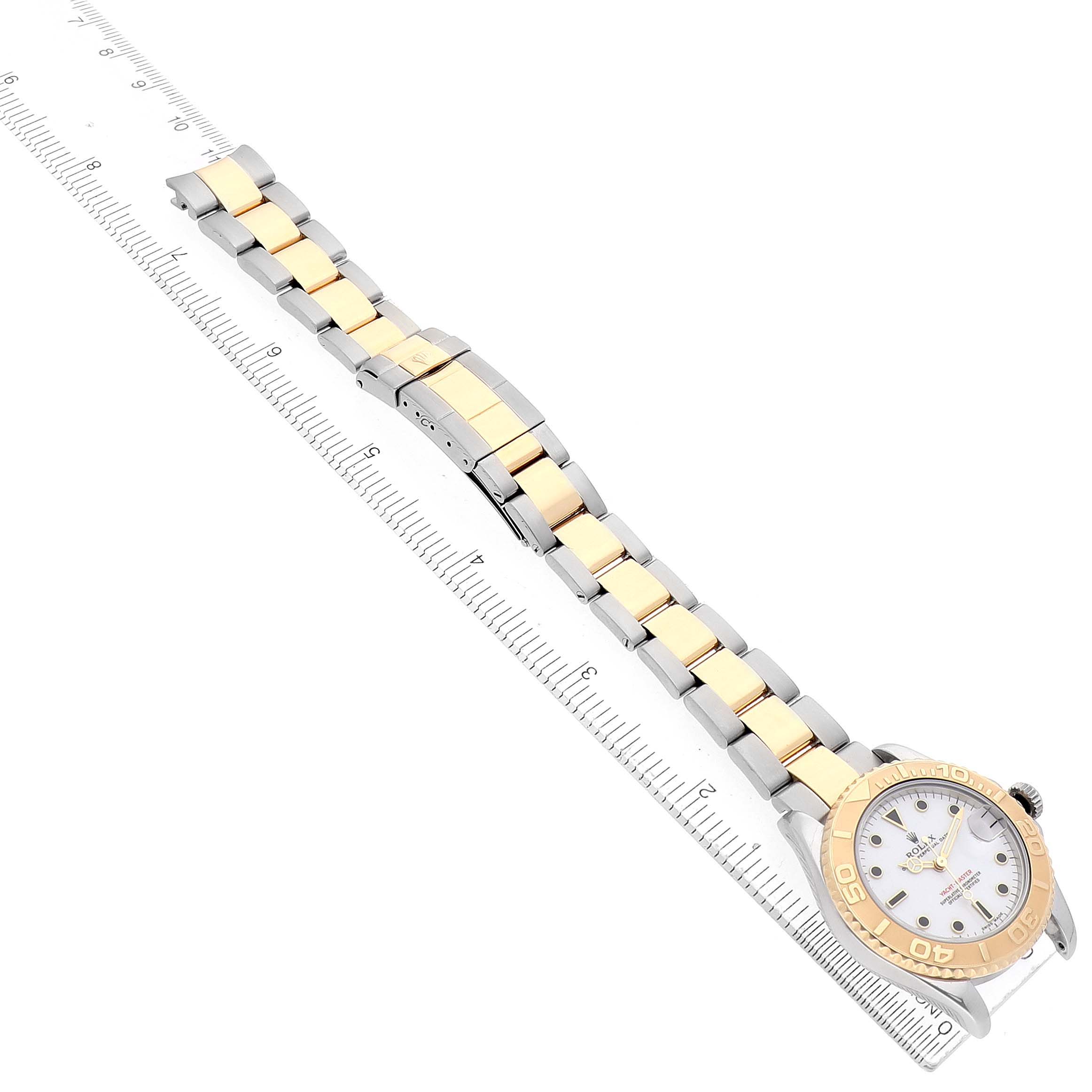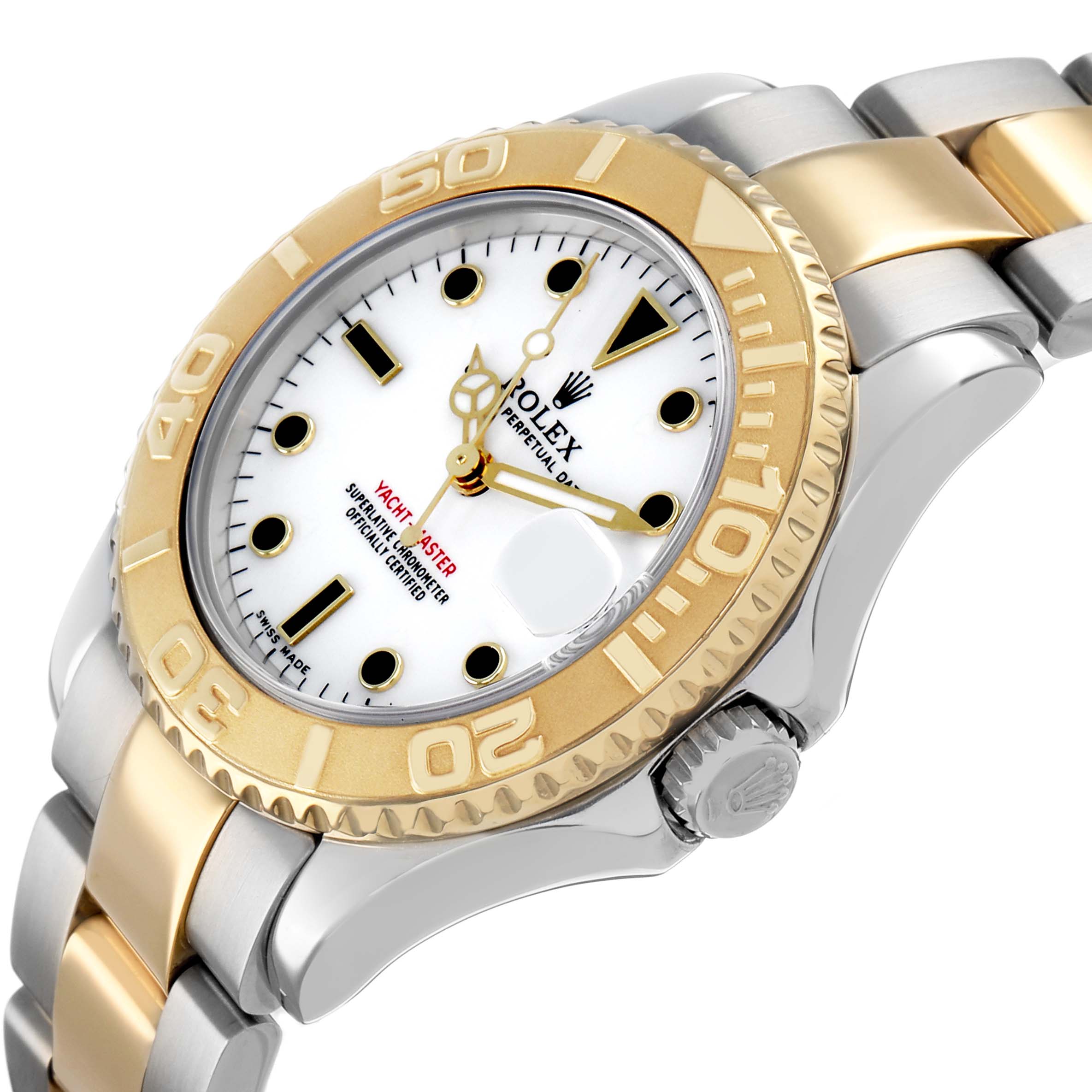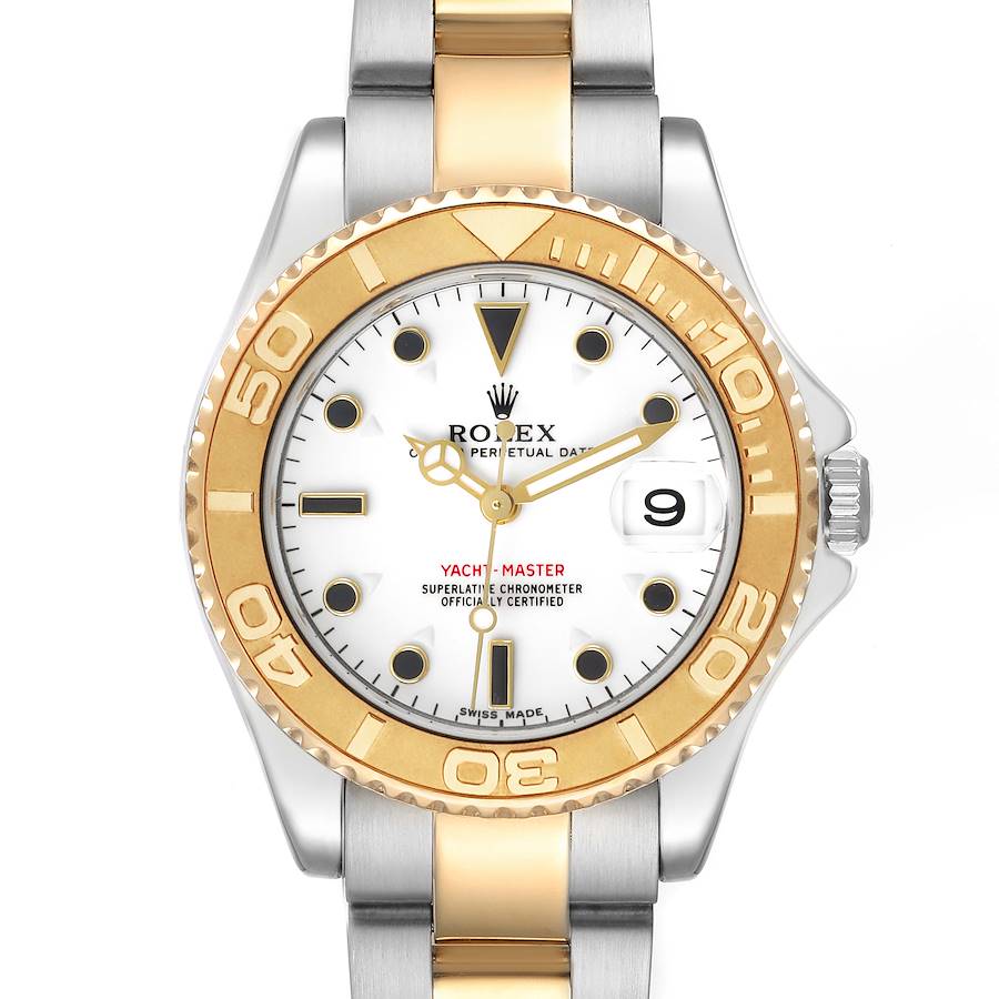 Rolex Yachtmaster Midsize Steel Yellow Gold White Dial Mens Watch 168623. Officially certified chronometer automatic self-winding movement. Stainless steel and 18K yellow gold oyster case 35.0 mm in diameter. Rolex logo on the crown. 18K yellow gold special time-lapse bidirectional rotating bezel. Scratch resistant sapphire crystal with a cyclops magnifier. White dial with gilt black dive style hour markers and luminescent yellow gold Mercedes hands. Date calendar at the 3 o'clock aperture. Stainless steel and 18K yellow gold oyster bracelet with a flip-lock clasp. Fits a 7" wrist.